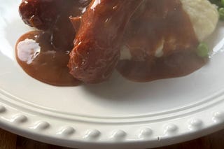 An English home comfort, this simple dish combines pork sausages and mashed potatoes with a rich caramelised onion gravy.
