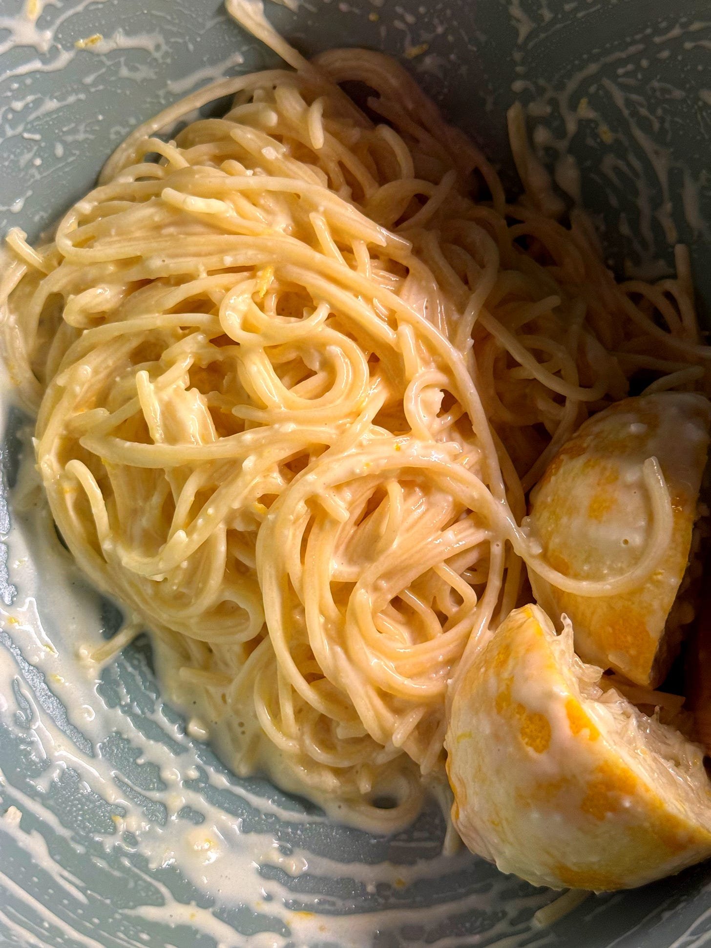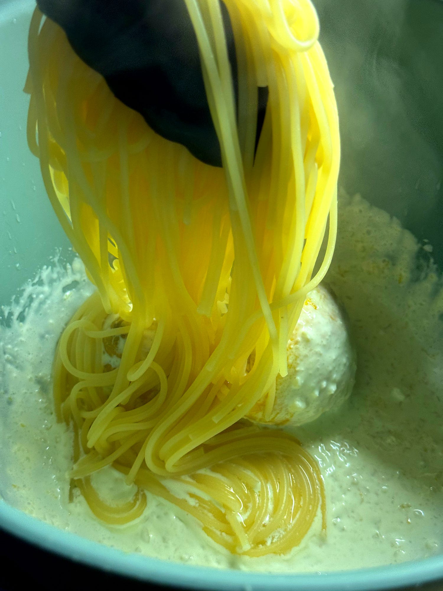 Remove the cooked pasta from the water and, without draining, add it to the mixing bowl with the lemon cream. Mix and thrash the pasta vigorously, allowing it to release its starch and bind to the sauce. If the sauce looks a little thin, just continue mixing to release starch from the pasta.