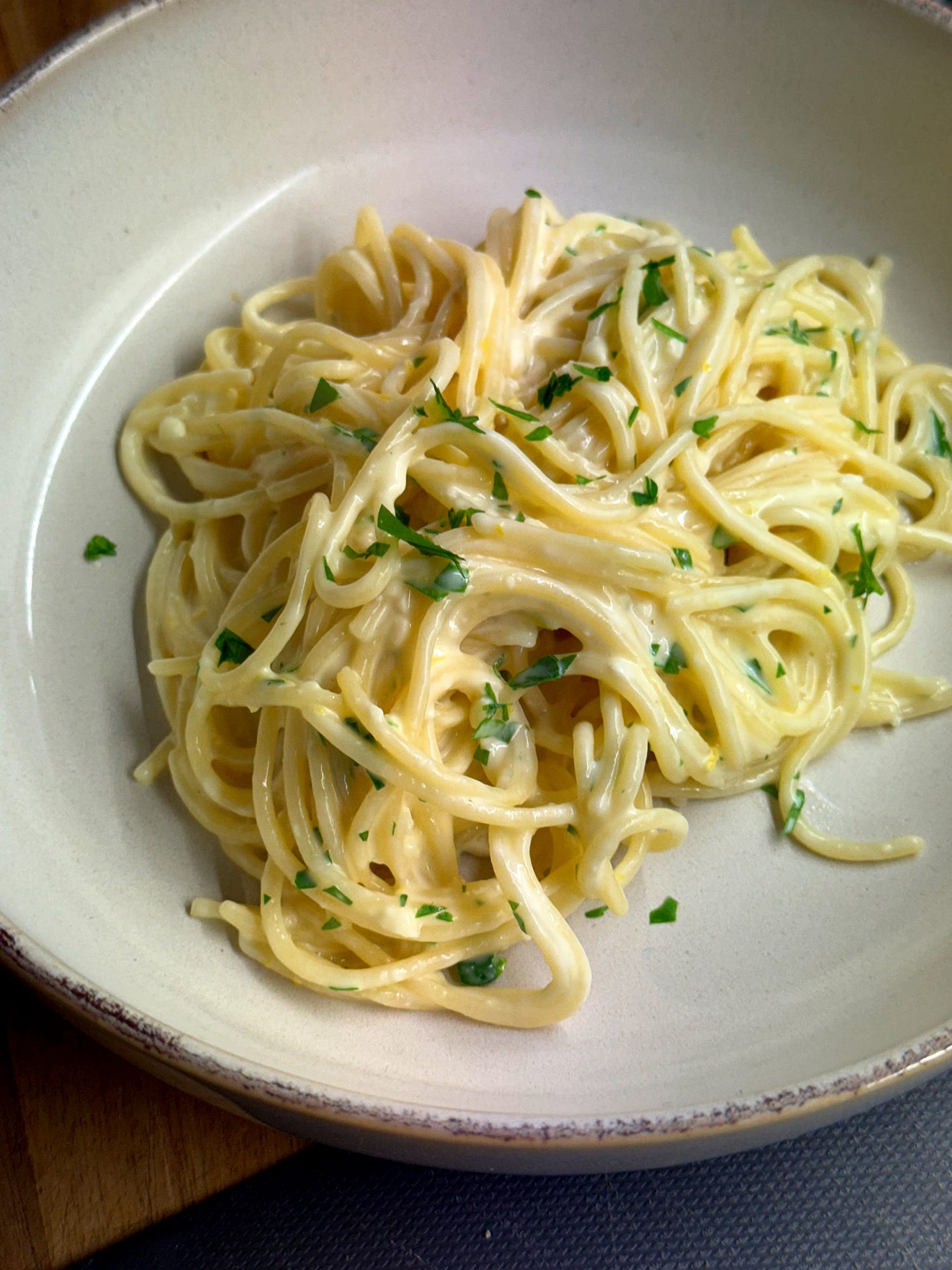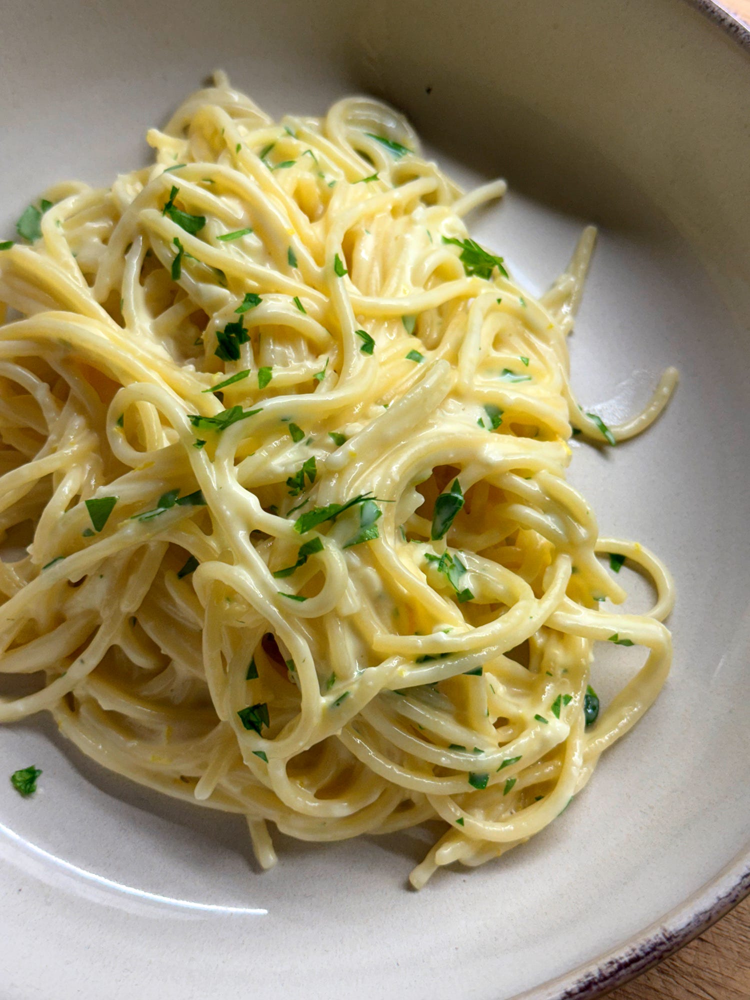 This iconic dish from the Italian Amalfi Coast puts one of their best produce items in the frame: lemons. Lemons have been growing along the Amalfi coast for centuries and were used to infuse many of their dishes including pasta. Traditional ‘spaghetti al limone’ from the Amalfi area is quite lean, using just olive oil, pasta, cheese and lemons with a smattering of fresh parsley or basil. Further up coast in Sorrento, ingredients were more plentiful, especially dairy. There you will find this dish made with butter or even cream, which buffers the acidity of lemon. Amalfi lemons are naturally mild in their acidity due to their growing conditions. The usual lemons that we have access to elsewhere in the world are a bit too sour to execute this dish without the dairy to soften their blow. The dash of double cream helps things along, though if you prefer you could just rely on the cheese, which should be pecorino but parmesan is just fine too. With dairy in the equation, this is still a very simple pasta dish to prepare that’s perfect for a weeknight. Let’s go!