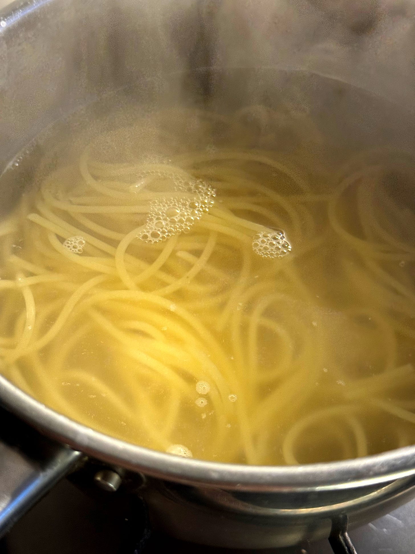 Place the 150g spaghetti into boiling, salted water and cook to the packet instructions - usually 1-2 minutes before to ensure it is ‘al dente’.
