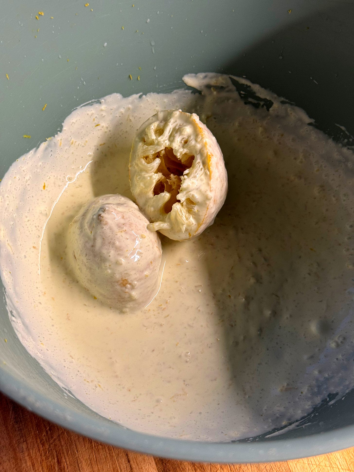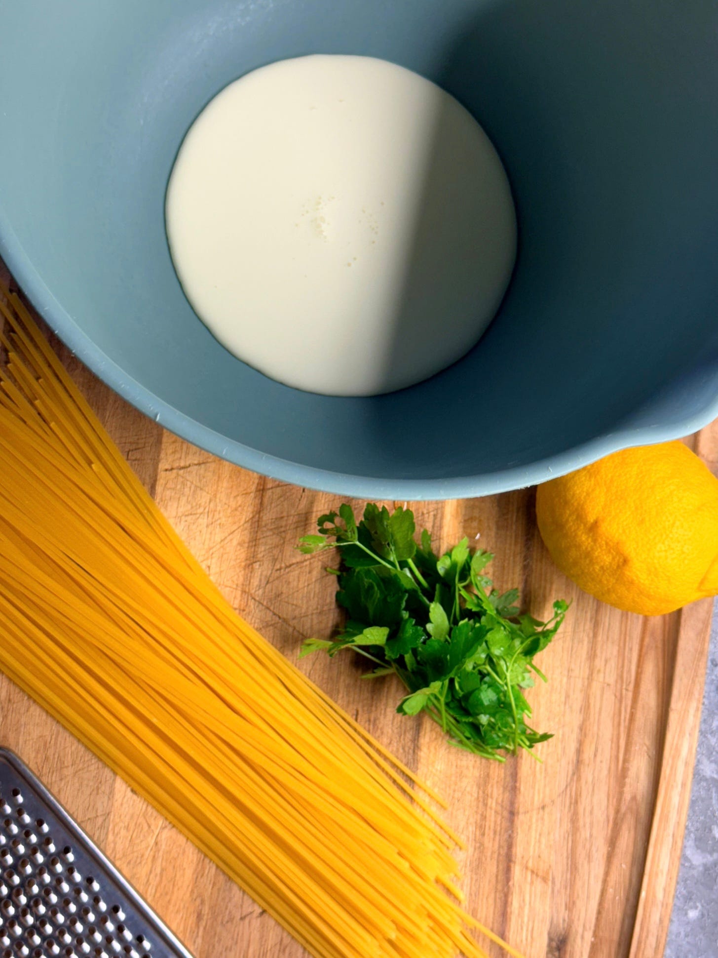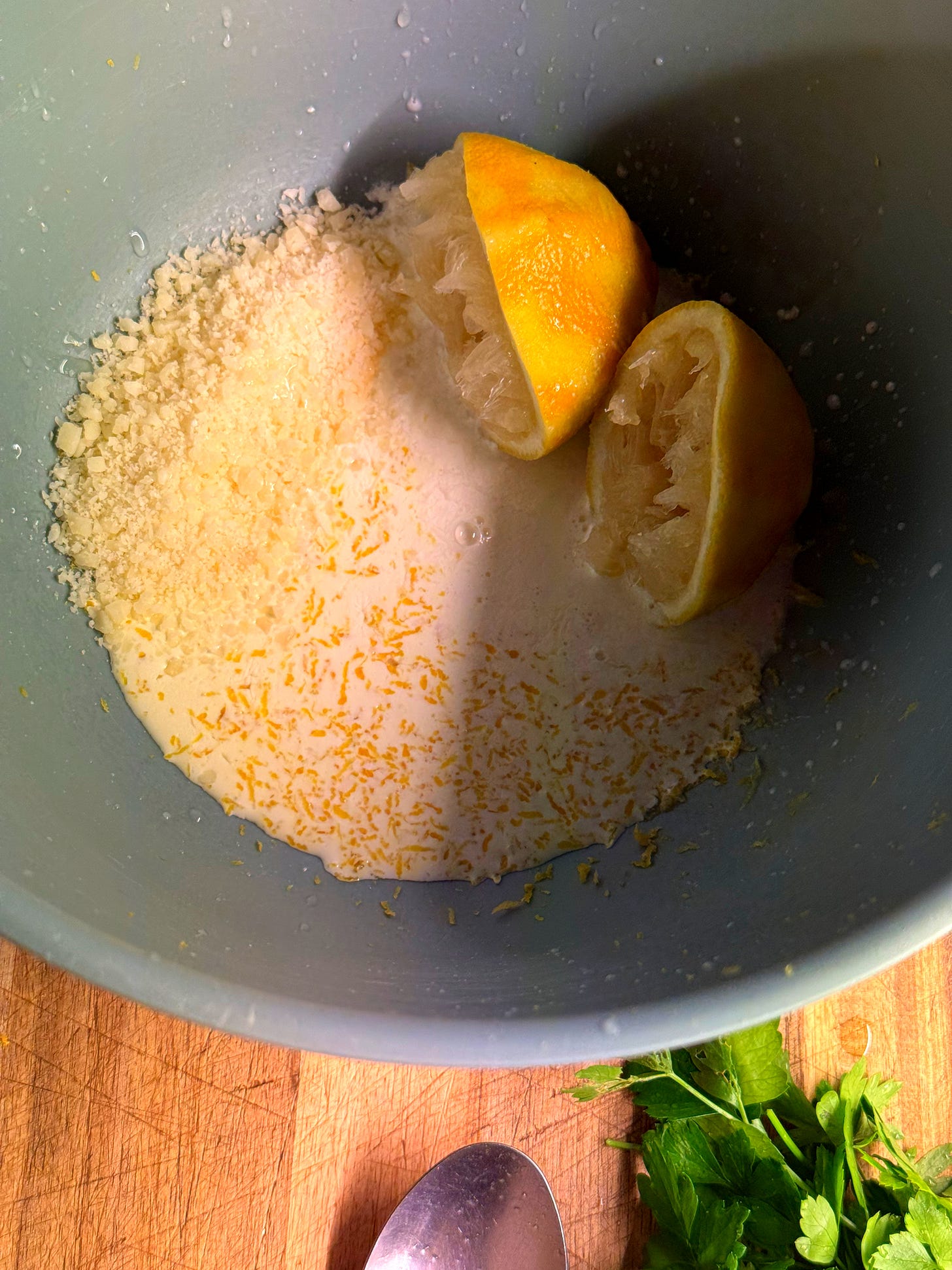 First, let’s make the lemon sauce. In a large mixing bowl, whisk together the 2 tablespoons lemon juice, lemon zest, 1/4 tsp salt, 1 tablespoon extra virgin olive oil, 3 tablespoons of double cream and 3 tablespoons of grated pecorino cheese. Set aside.