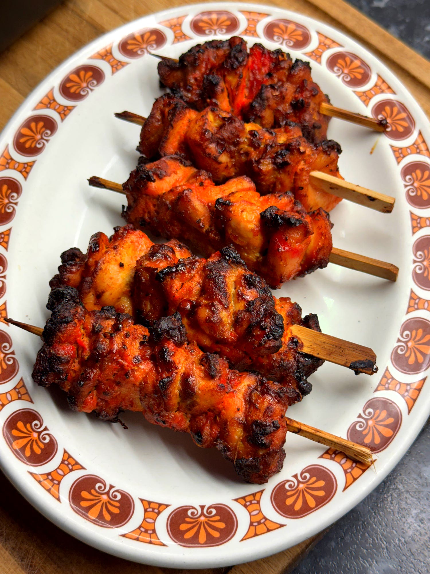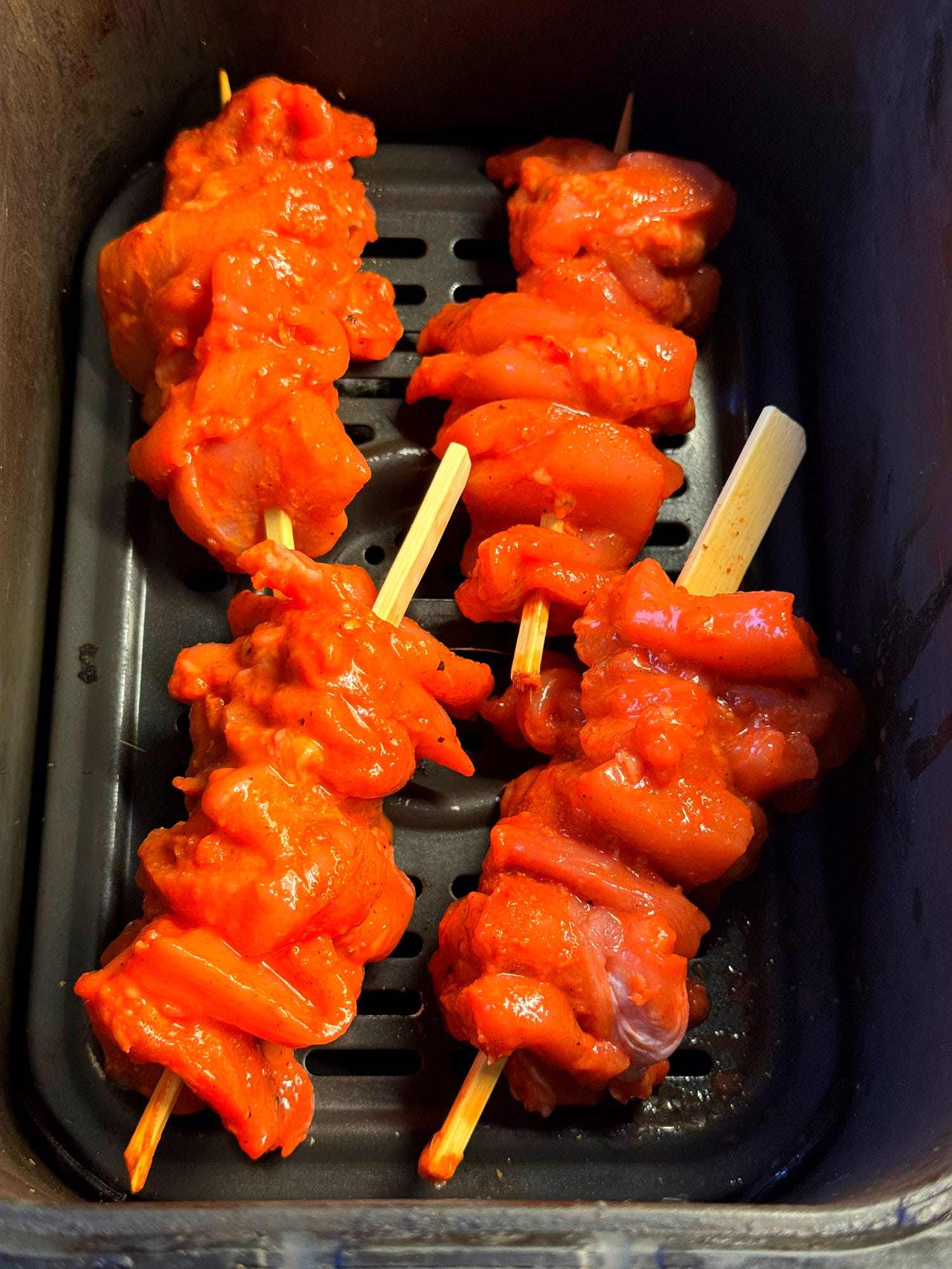 When you are ready to cook, skewer the marinated chicken pieces onto wooden or metal skewers. Thread the chicken pieces onto the skewers tightly, as they will shrink and compact on cooking.