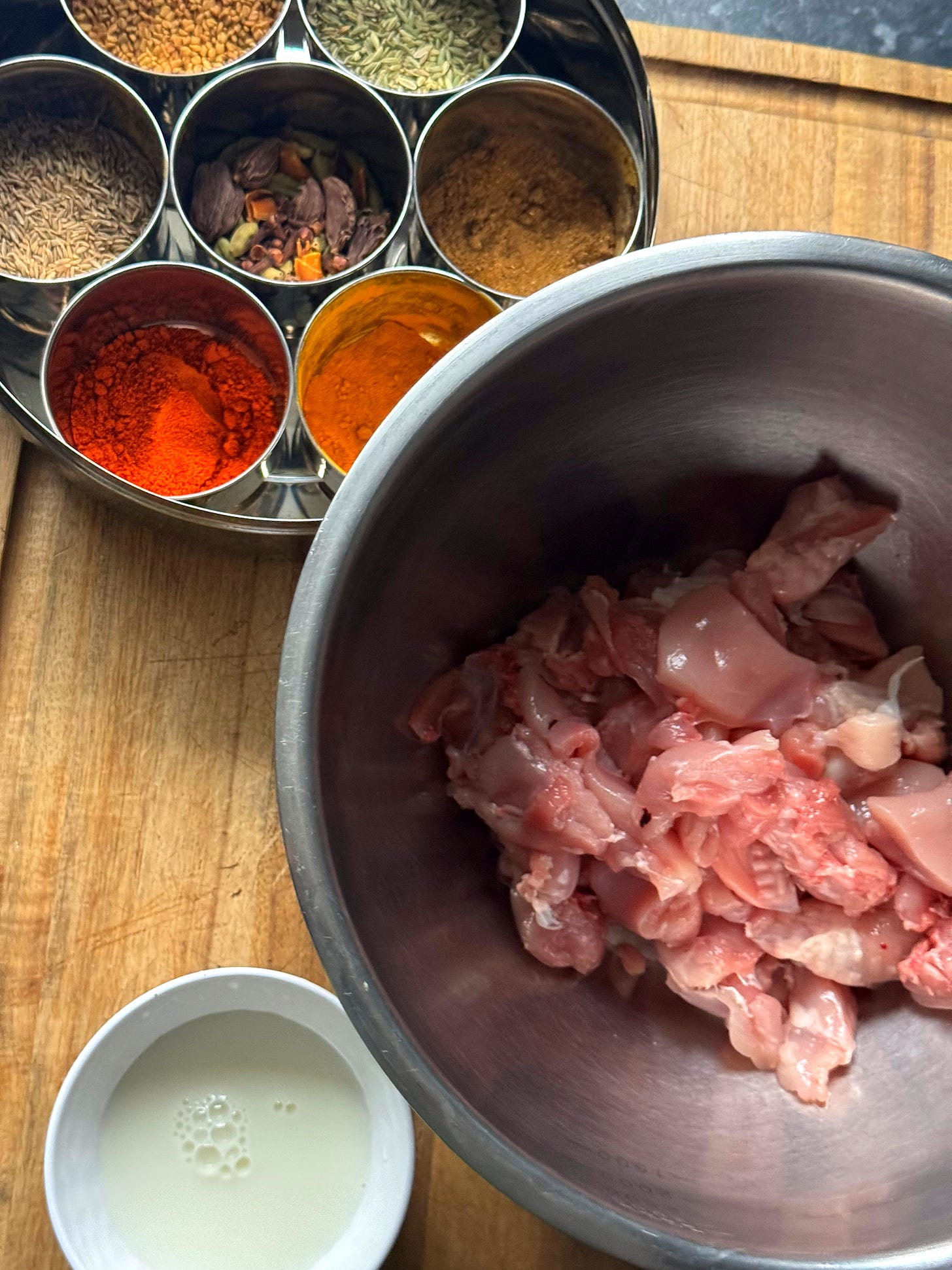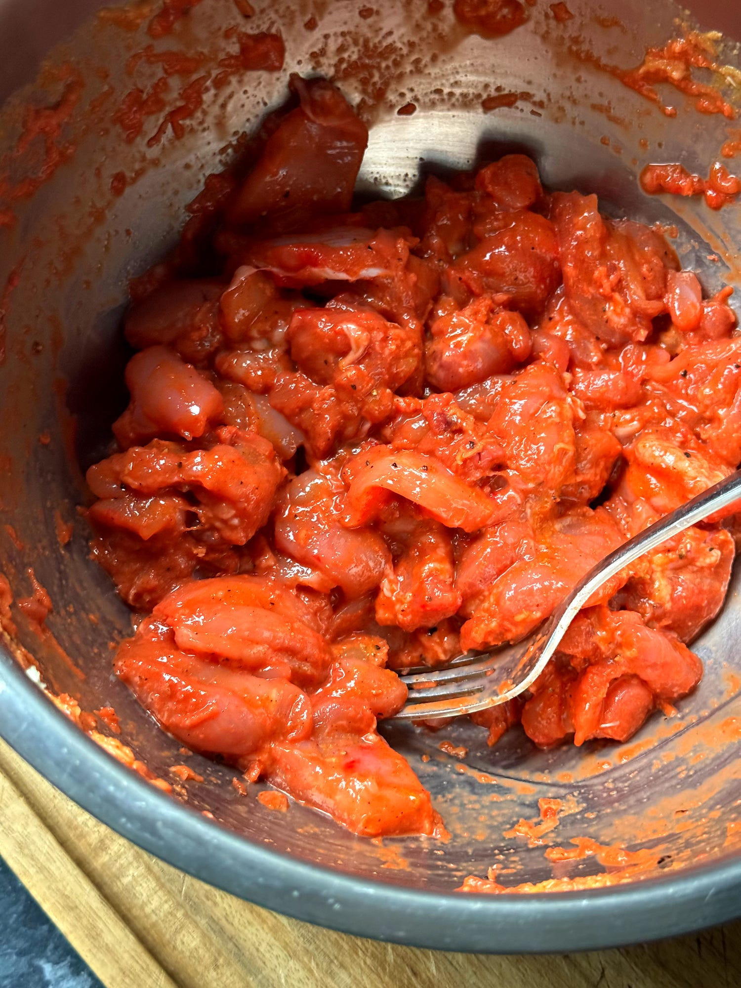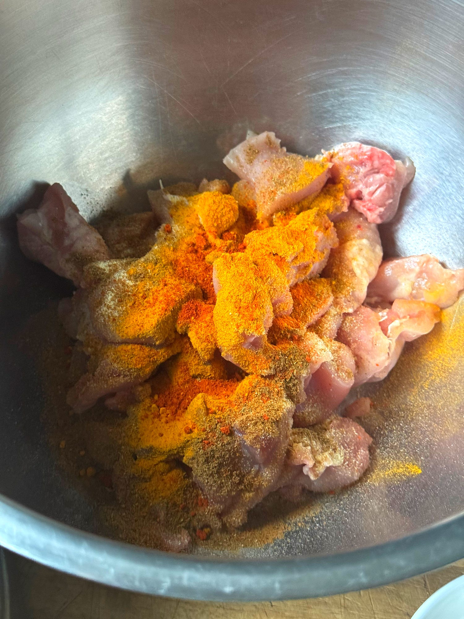 Into a mixing bowl, add the 5x boneless chicken thighs, chopped into bitesize pieces. Add all of the tikka spices and aromatics to the chicken, followed by the soured milk. You can also add red food colouring if desired. Mix everything well until the chicken is thoroughly coated.