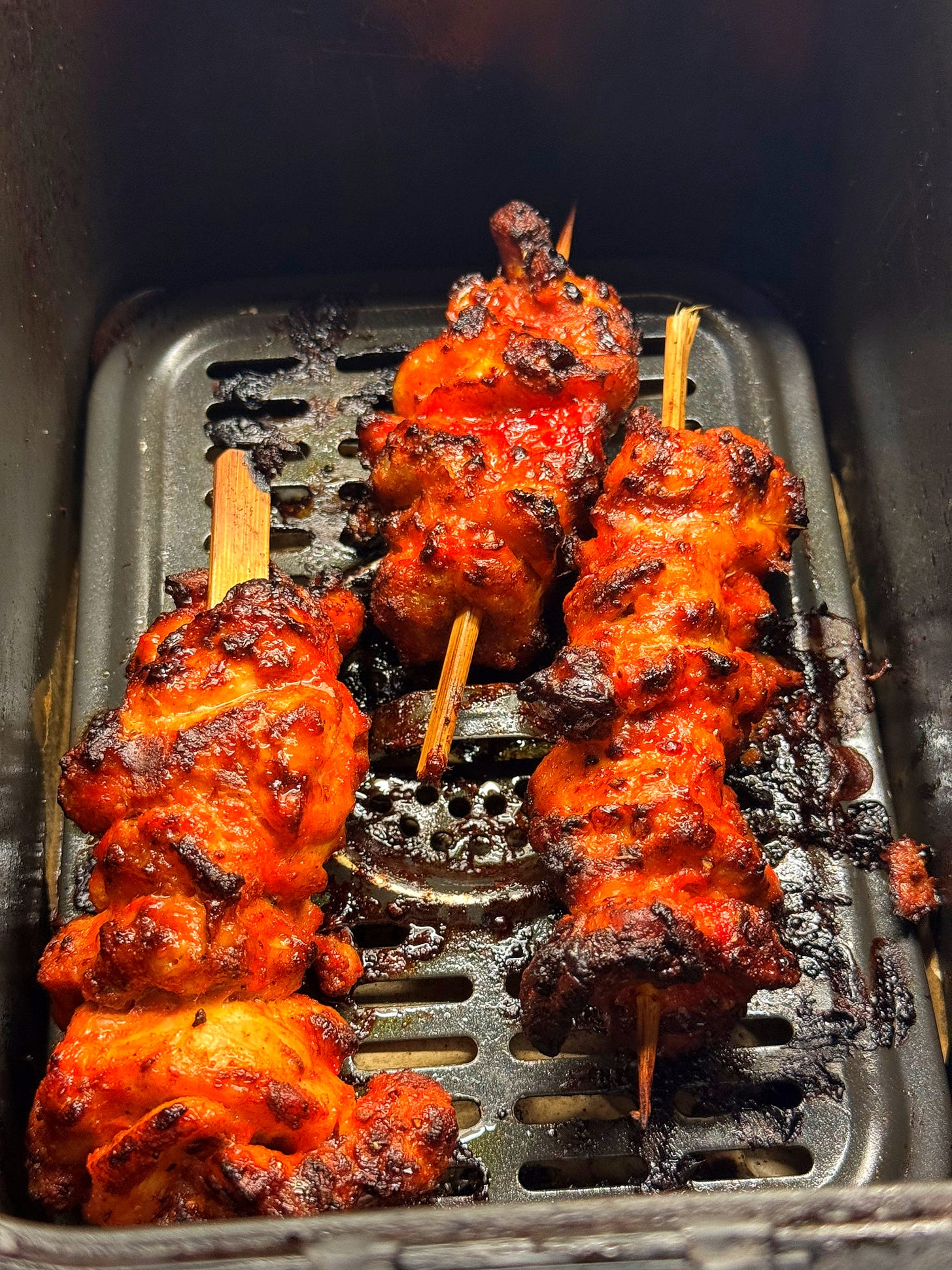 Once skewered, place the chicken tikka skewers under a hot grill/broiler (at least 3 inches from the grill element) or cook for 18-20 minutes at 200C/400F in the oven or air fryer, turning them halfway.