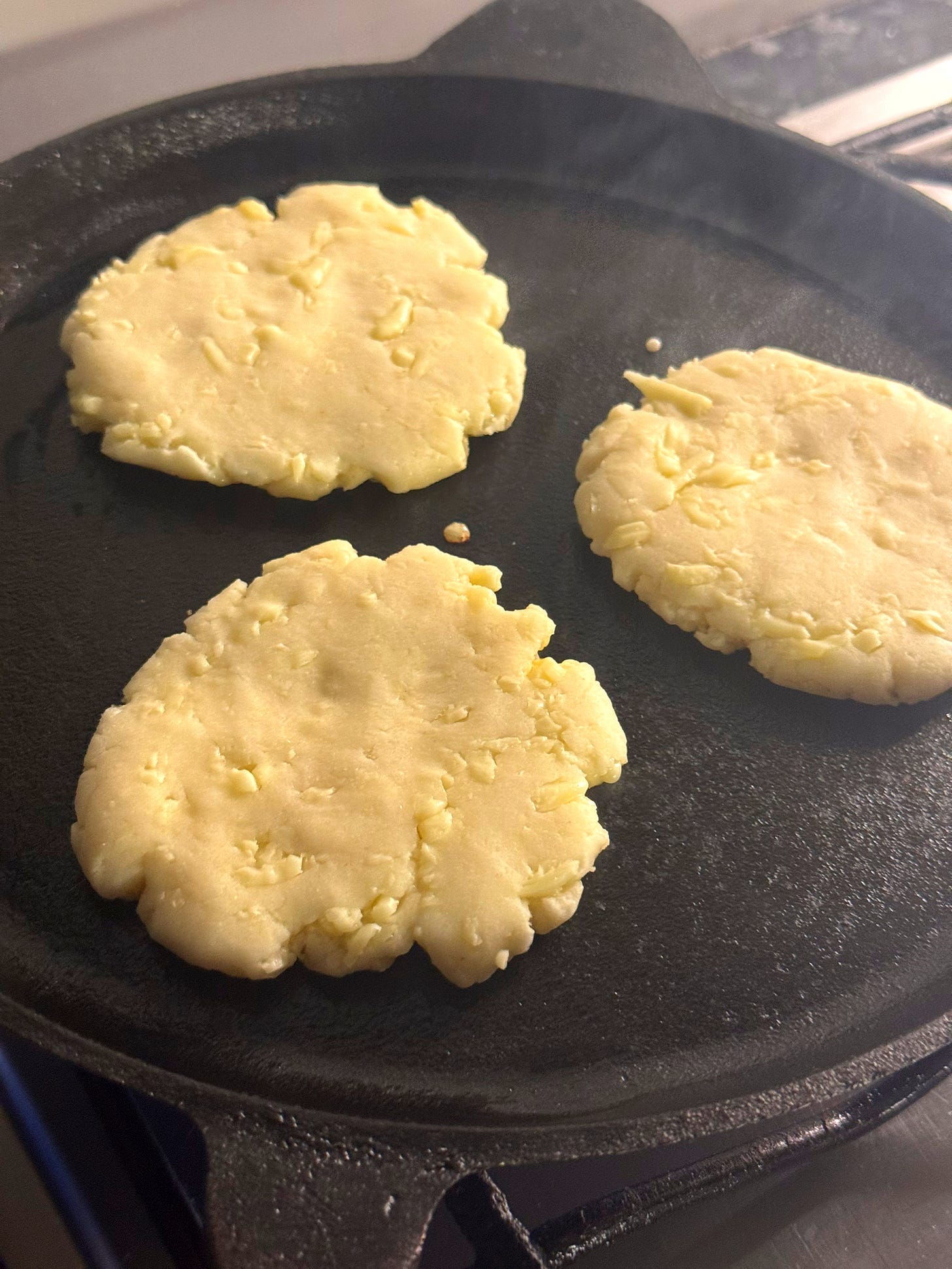 Arepas are the daily bread for many Colombians and Venezuelans and are often the fuel for rivalry as both countries claim to the serve the best. The truth is, arepas actually predate the borders of these countries and originate in pre-colonial South America. They are a marvel of indigenous cookery, using a special flour called ‘masarepa’. This is a flour made from corn, but what sets it apart from other types of cornmeal around the world is that its cooked prior to grinding. It’s also different to ‘masa harina’ used to make tortillas or the cornmeal used in Asia. The process of making ‘masarepa’ gives the resulting bread a special flavour and texture. For this reason, I recommend sourcing the proper stuff which is fairly easy today given the internet [BEST BUY]. Once you have the ‘masarepa’ in stock, these breads are refreshingly easy and fast to prepare. There’s no kneading or stretching, in fact these breads contain no gluten so you can make the dough, shape it into arepas with your hands and cook them right away. What makes these particular arepas special is the addition of cheese, ‘arepas con queso’. The addition of cheese to the dough creates a richer, chewier texture and a savoury taste. The traditional cheese used for this is queso fresco, a fresh white cheese which is easily substituted with dried, pre-shredded mozzarella. They’re perfect eaten with salsa, scrambled eggs or even dipped into a Colombian hot chocolate for breakfast. Either way, you won’t regret trying them. Let’s go!