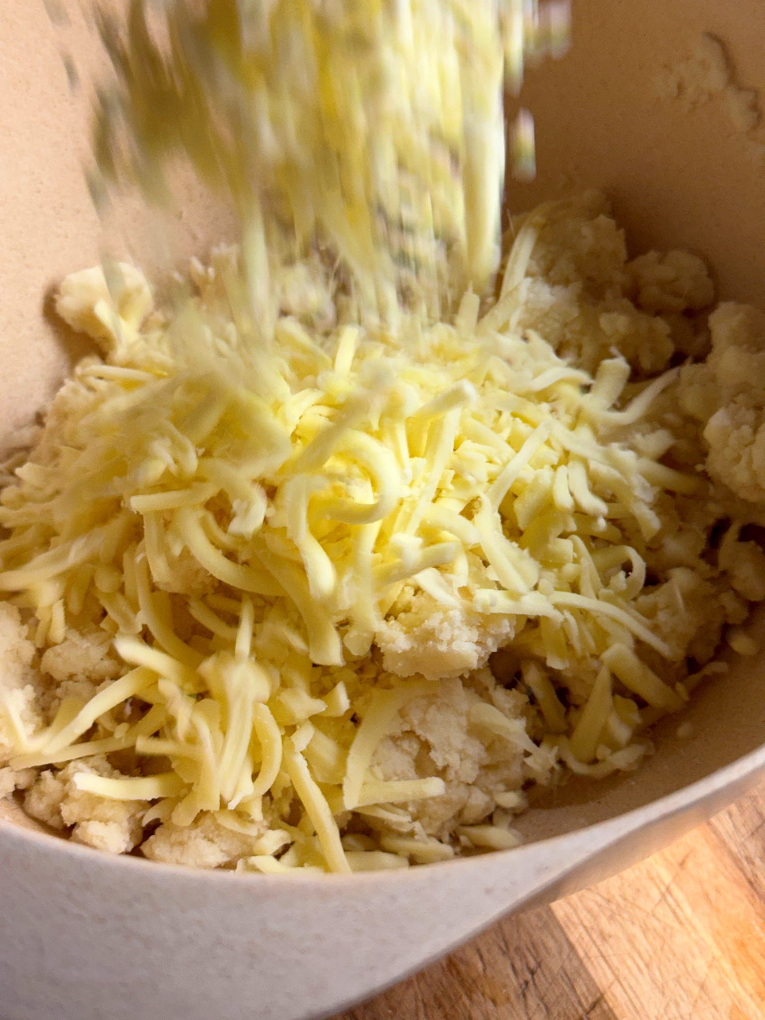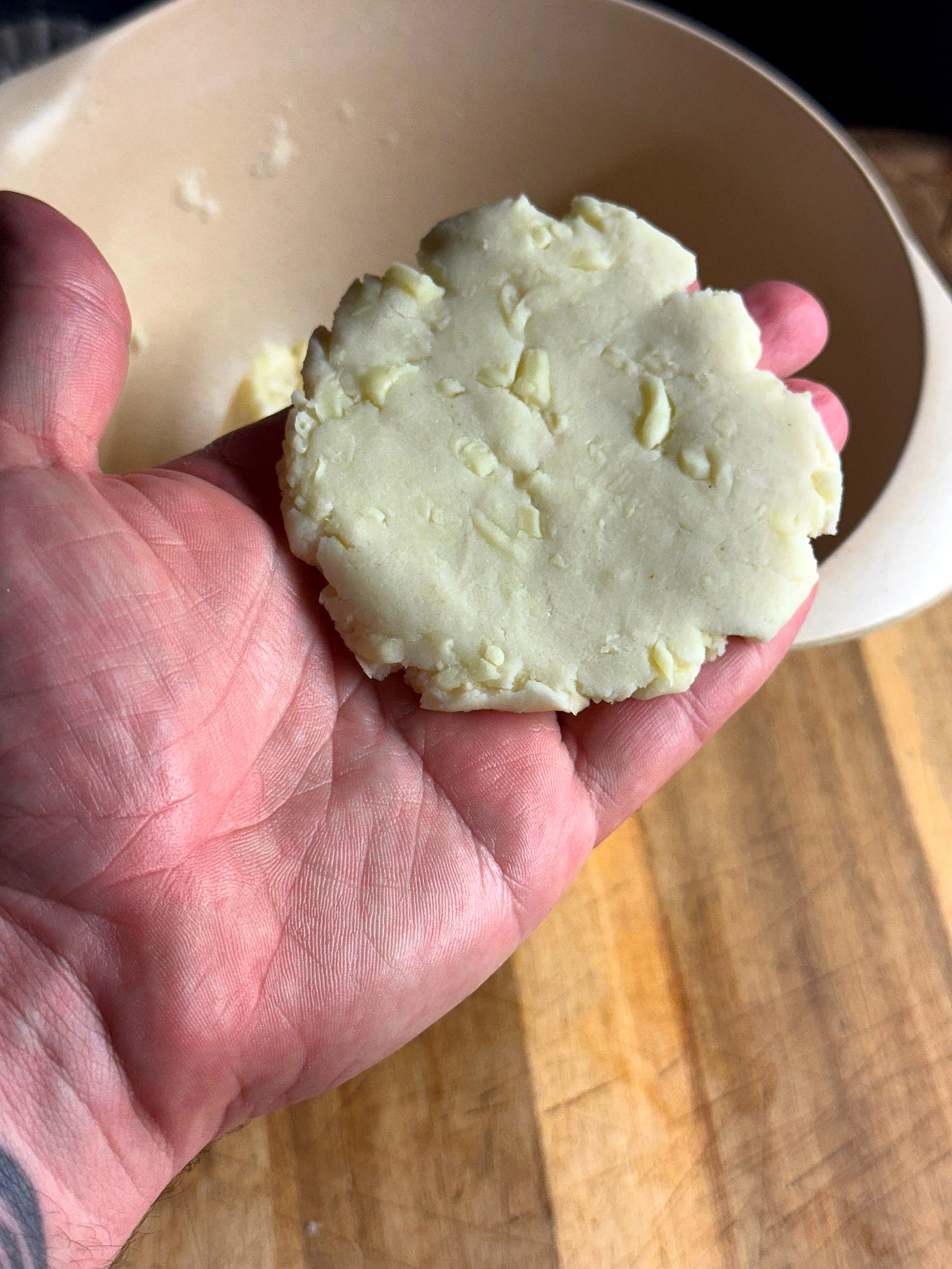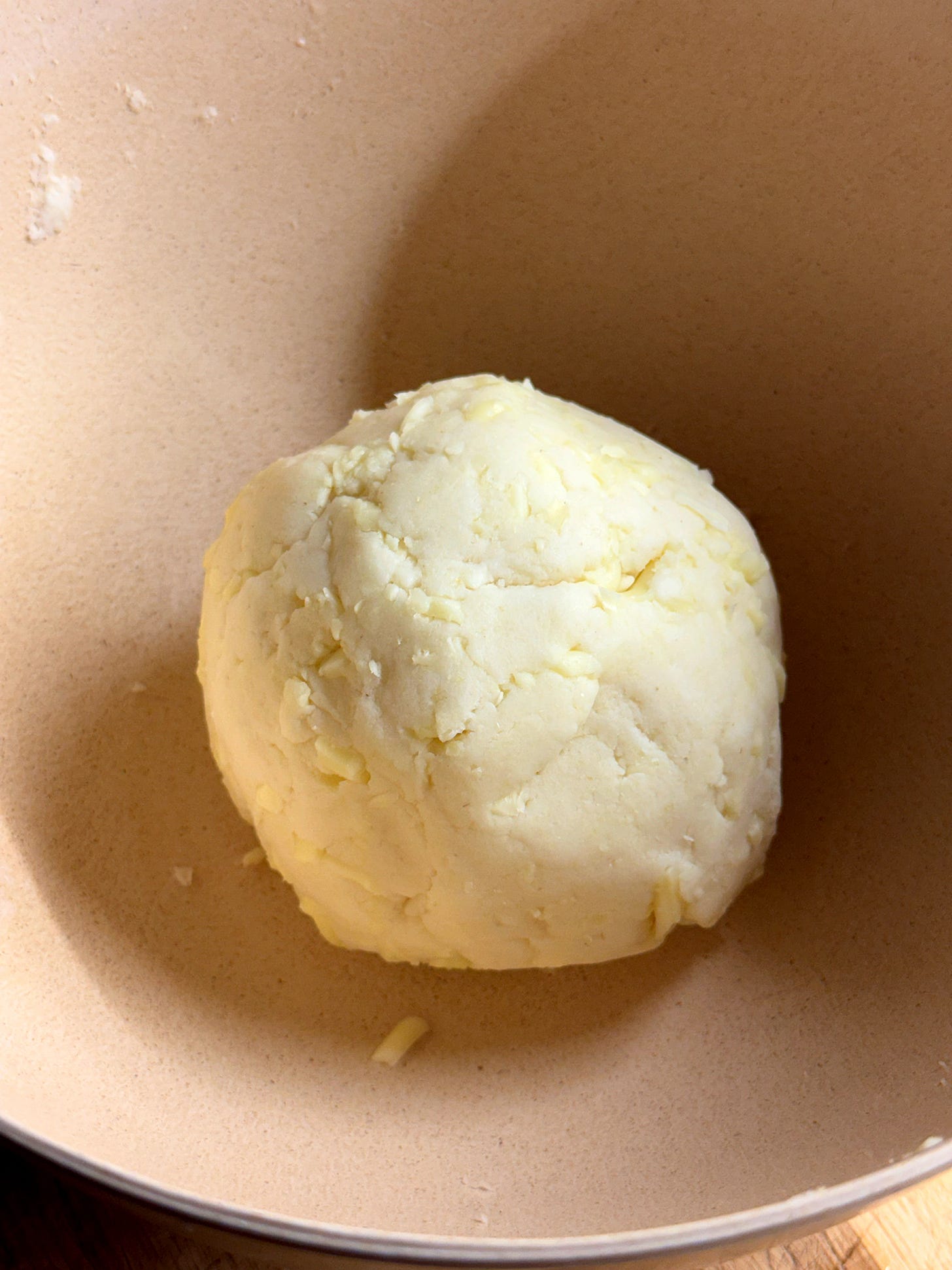 Now we’ll add the cheese. Break up the dough into rubble. This should be very easy as the dough has no gluten or elasticity. Add the 250g grated mozzarella, mix it into the dough and bring it back together to make a large ball. Keep it loosely covered so it doesn’t dry out. Now we can prepare our pan and shape the arepas.