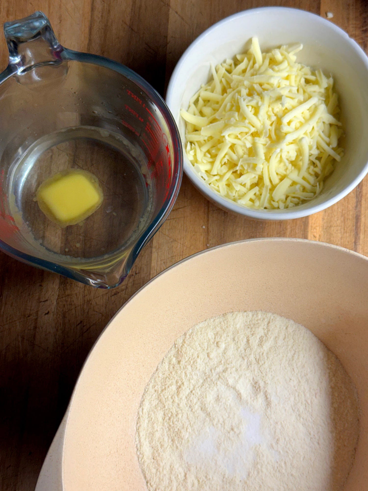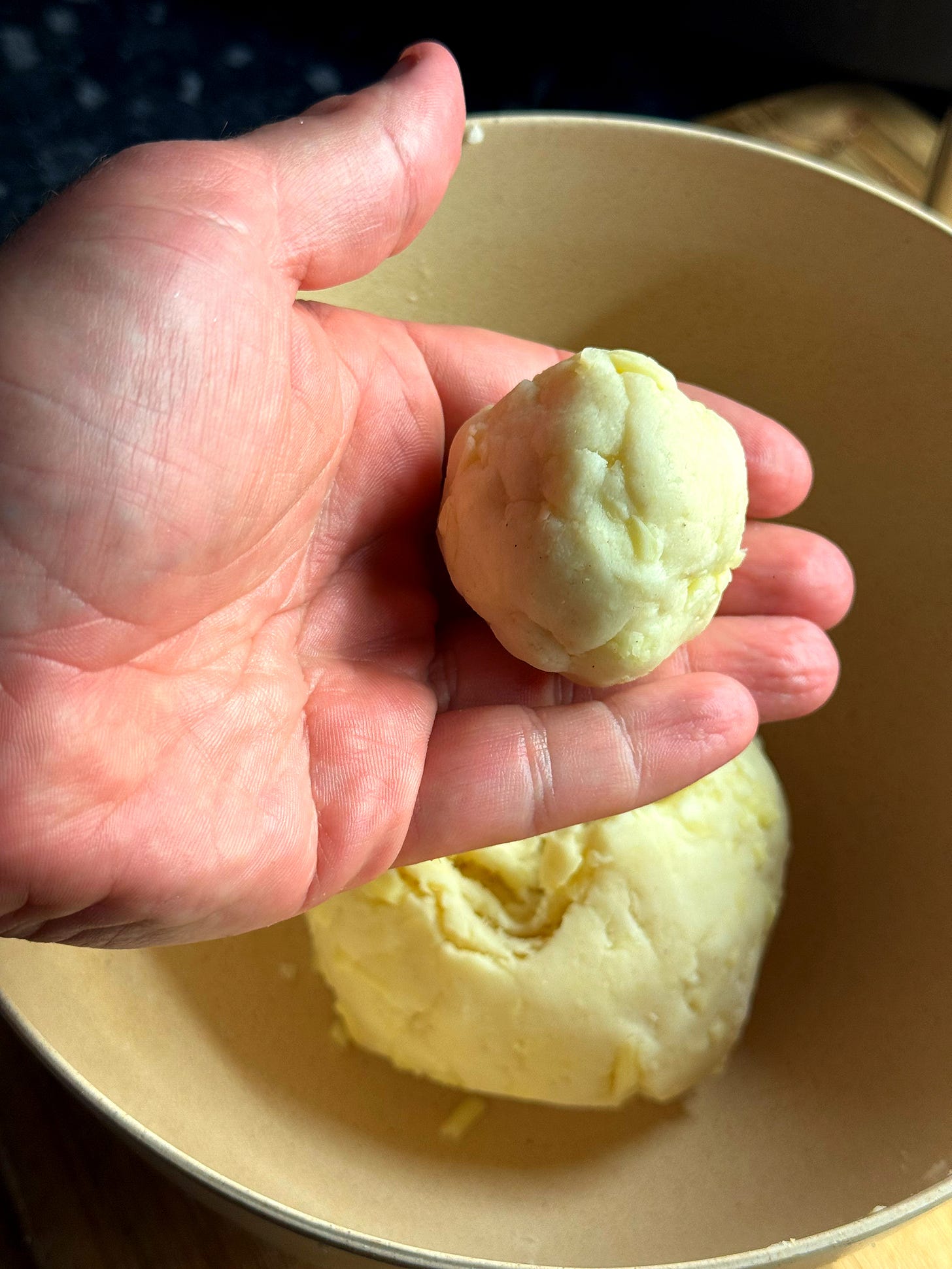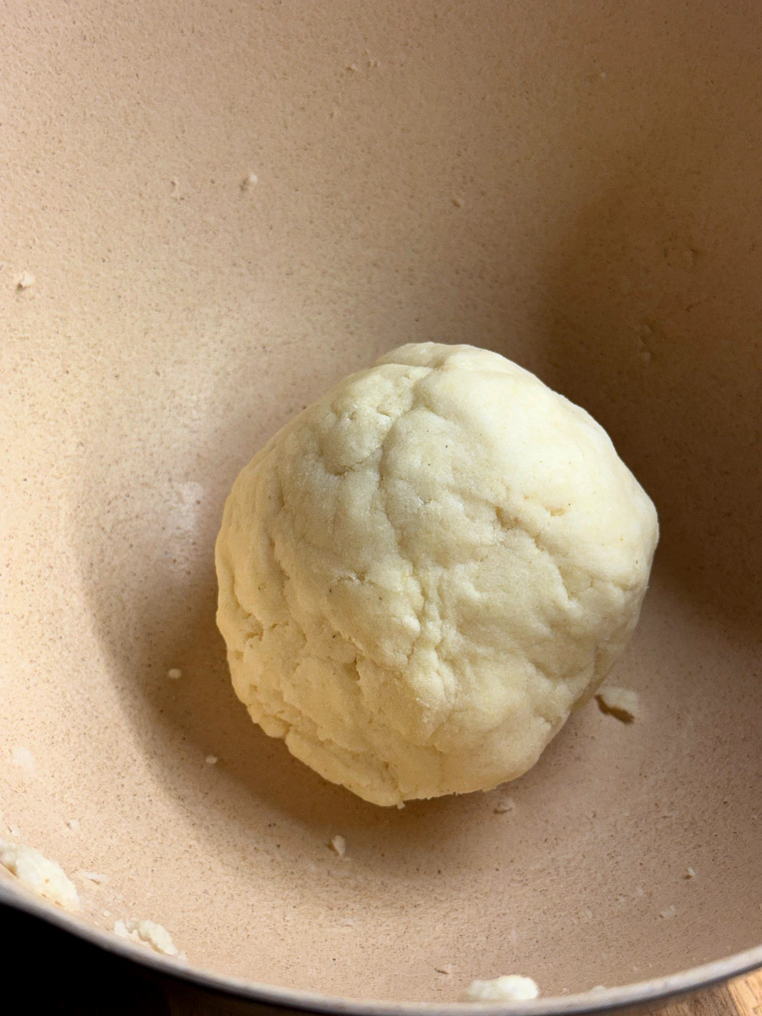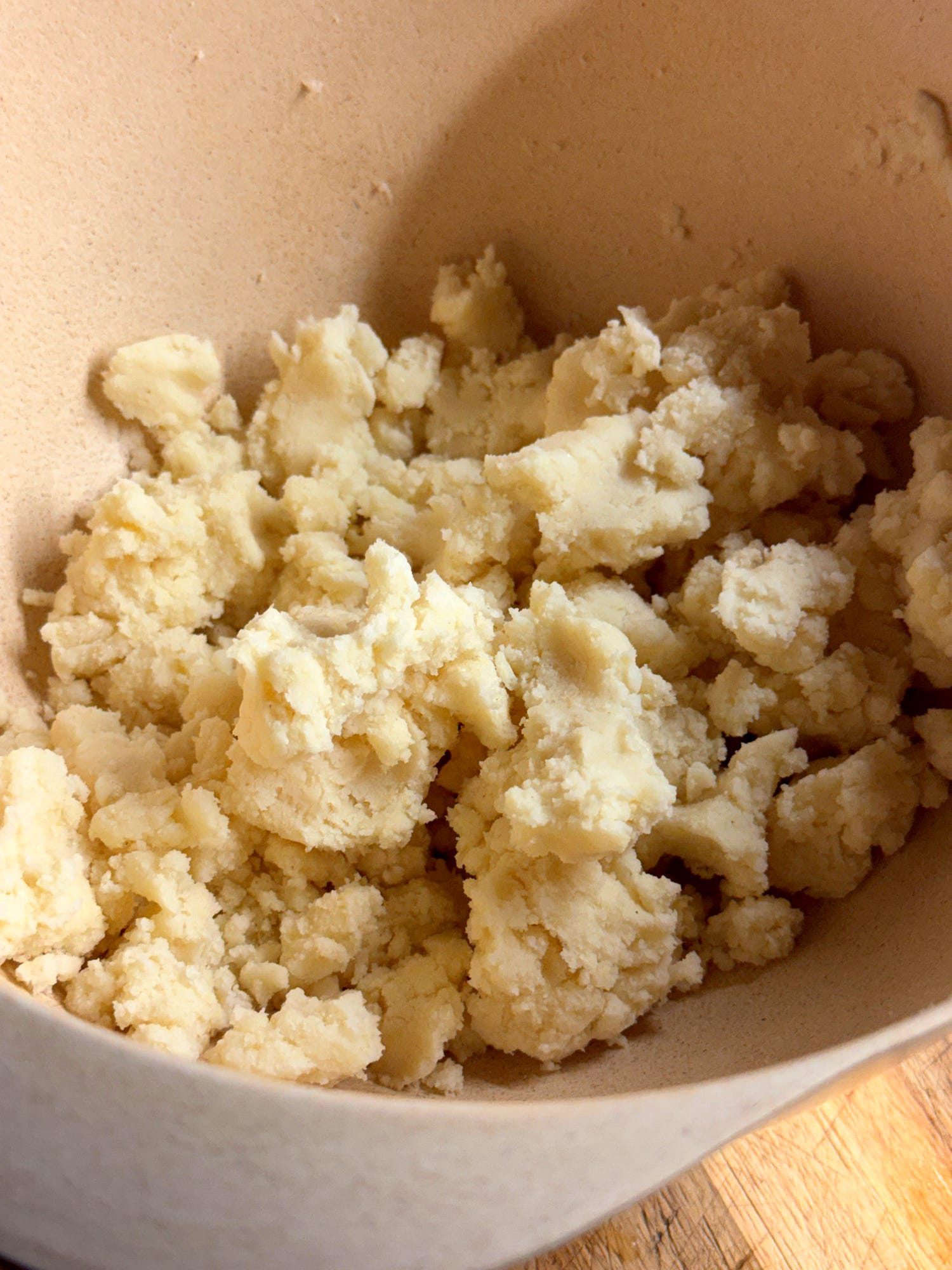 Now we’ll add the cheese. Break up the dough into rubble. This should be very easy as the dough has no gluten or elasticity. Add the 250g grated mozzarella, mix it into the dough and bring it back together to make a large ball. Keep it loosely covered so it doesn’t dry out. Now we can prepare our pan and shape the arepas.