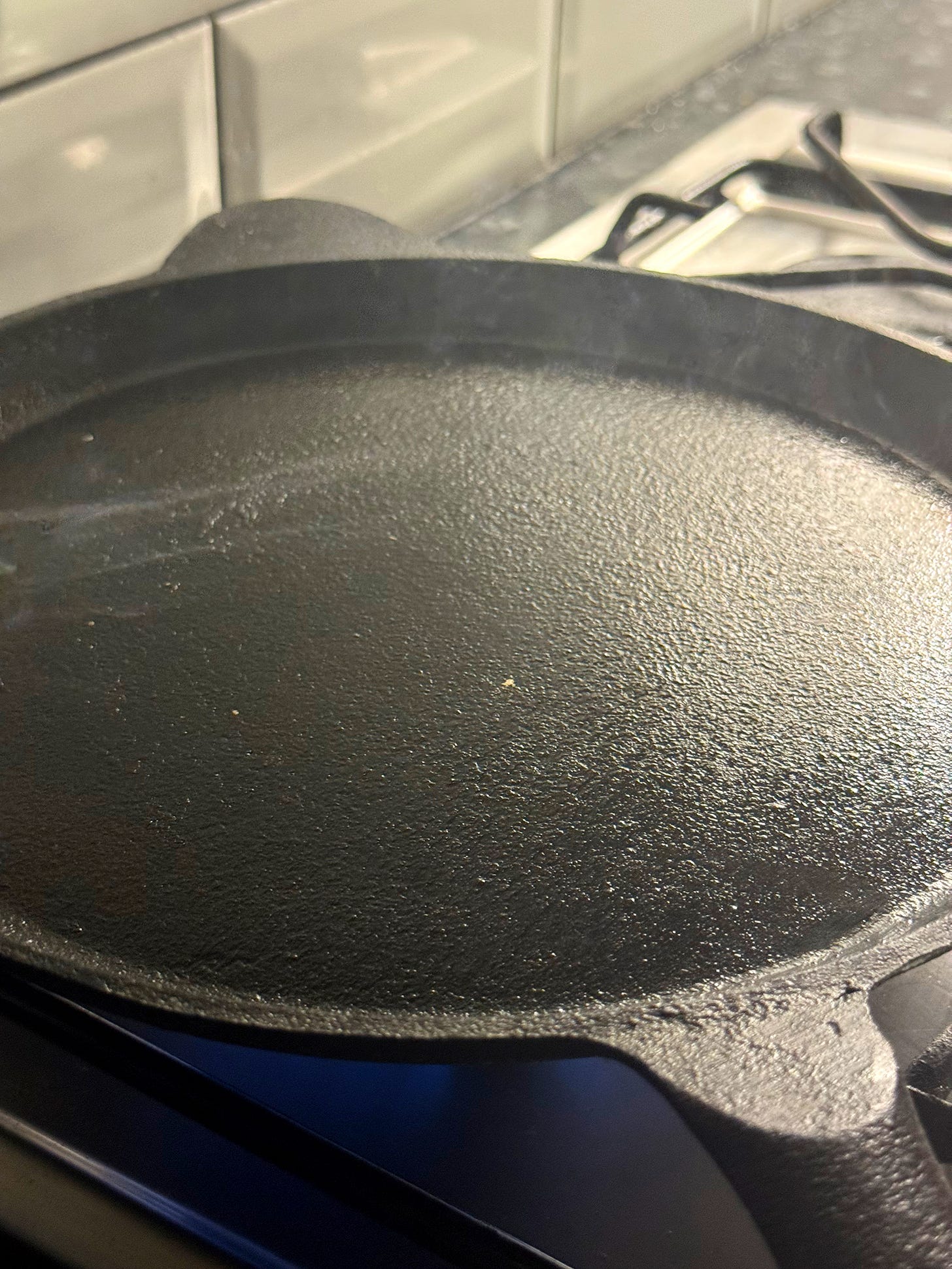 Now we’ll prepare the pan. Place a heavy-based frying pan or griddle pan onto a medium-high heat. Heat it for 5-6 minutes until evenly heated. Just before cooking, wipe over a small amount of vegetable oil with a paper towel to coat the surface.