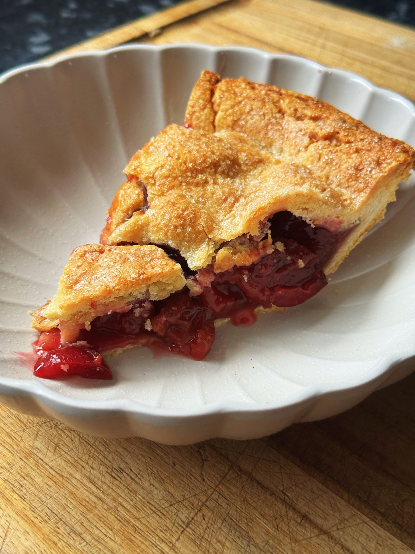 Proper cherry pie is a highlight of my summer. I make it at least once a summer from fresh cherries. It’s a little bit of a project, as fresh cherries require pitting - quite a messy job - but it’s a nice ritual for me to be covered in berry juices at least once during the summer! Pitting cherries is quite easy really, just tedious, but much faster when you elicit help from others. Frozen cherries are just as effective, so feel welcome to take that route instead. The main issue with cherry pie is moisture content. Cherries vary enormously in how juicy they are, which can be challenging when you’re trying to bake a pie pastry to a beautiful crisp. My solution is to macerate the cherries in sugar to draw out their juices. These juices are then reduced down to a thin syrup. If that sounds technical to you, let me reframe it: you’re just boiling the juice for about 10-15 minutes on the stovetop! Not too challenging, but the results are guaranteed to be jammy, tangy and packed with the essence of summer cherries. You must enjoy it with vanilla ice cream. Let’s go!