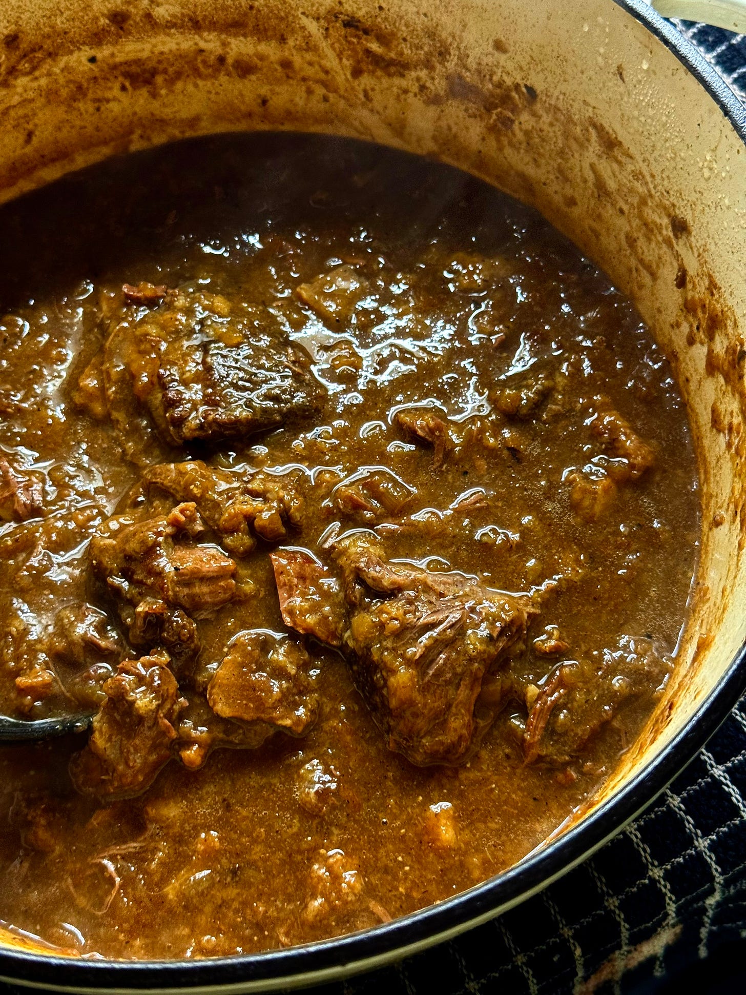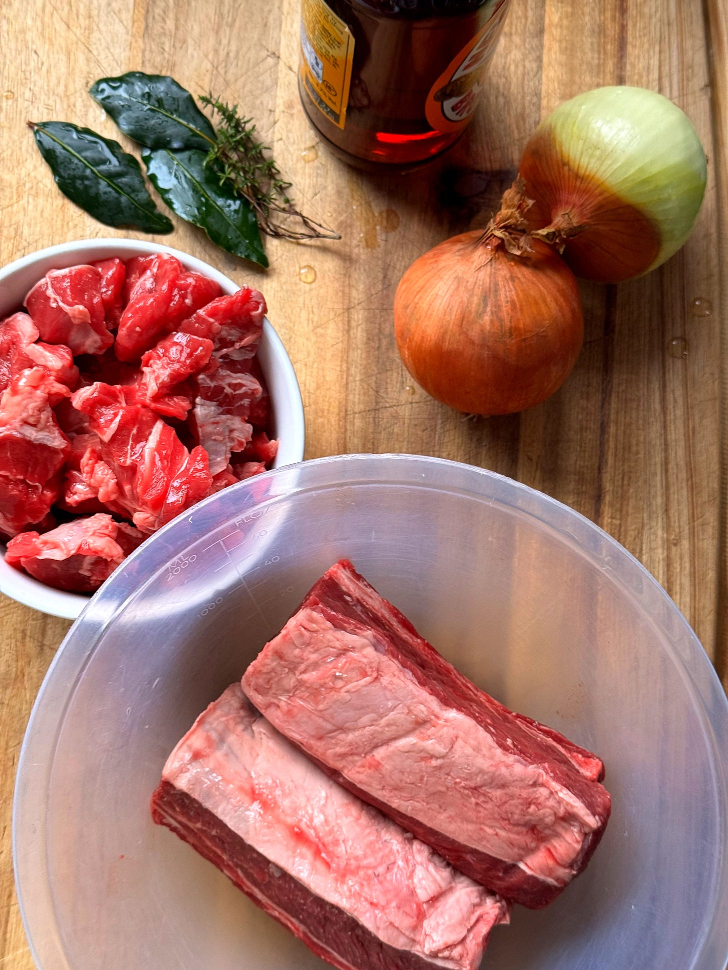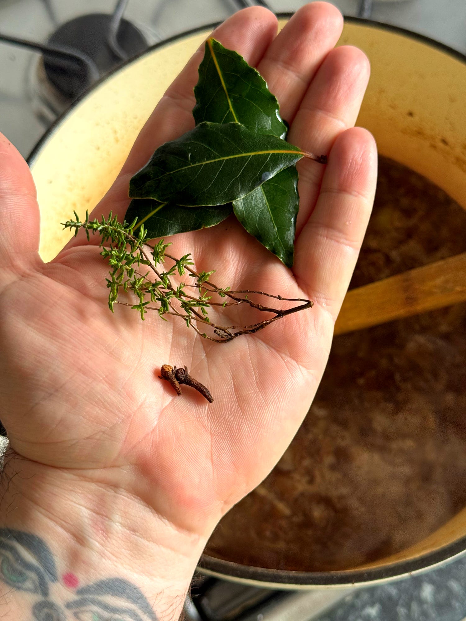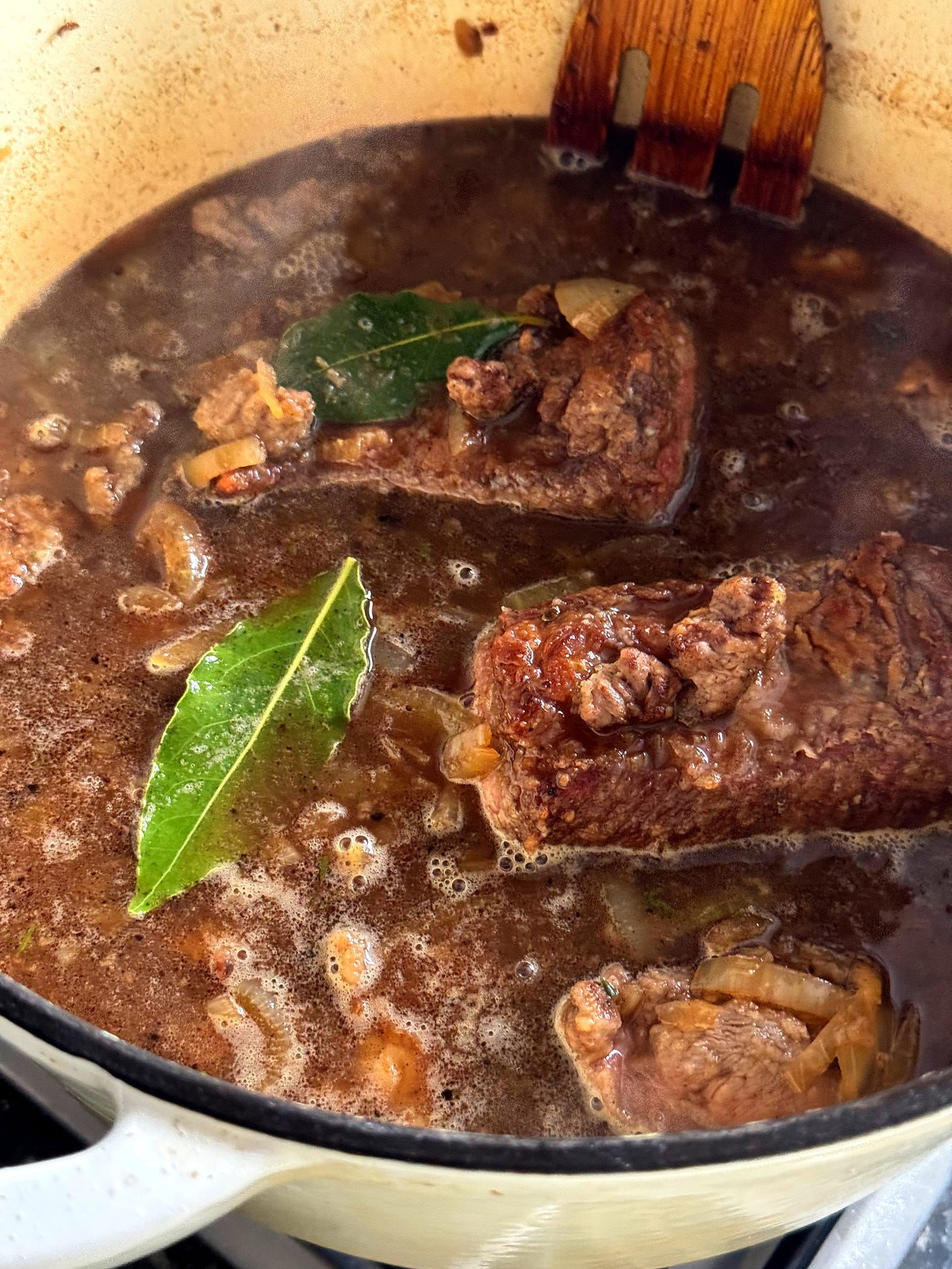 Bring the liquids to a boil and stir any caramelised browning from the bottom of the pot. Add all the browned beef pieces to the pot along with any drippings remaining on the plate. Add the 3x bay leaves, 2x cloves, 2-3 sprigs of fresh thyme, 1/2 tsp black pepper and 2 tsps of salt.