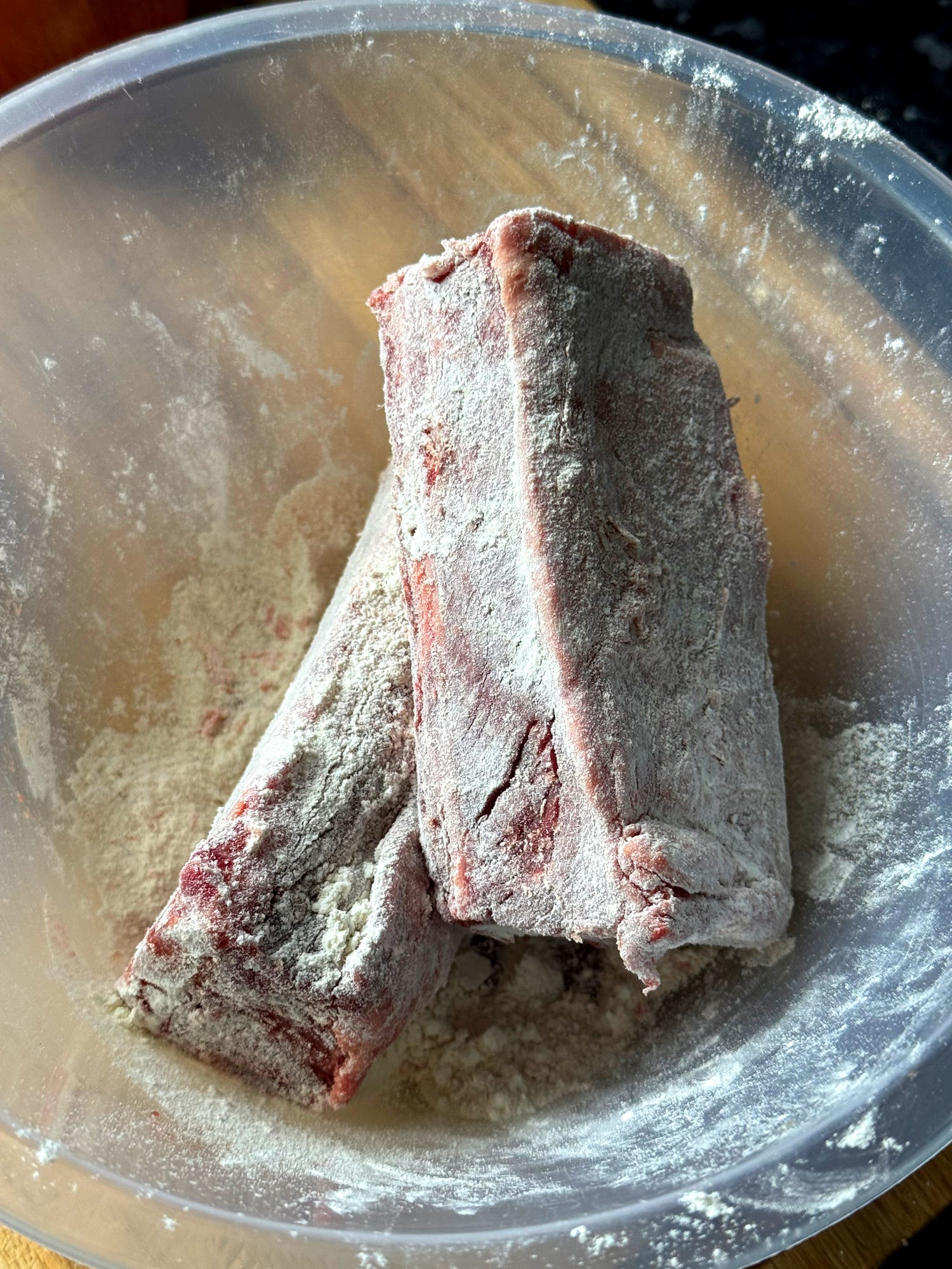First, let’s flour the beef. Add the 500g diced beef shin and 500g beef short ribs to mixing bowl with 2 tablespoons of flour. Toss until lightly coated and set them aside.