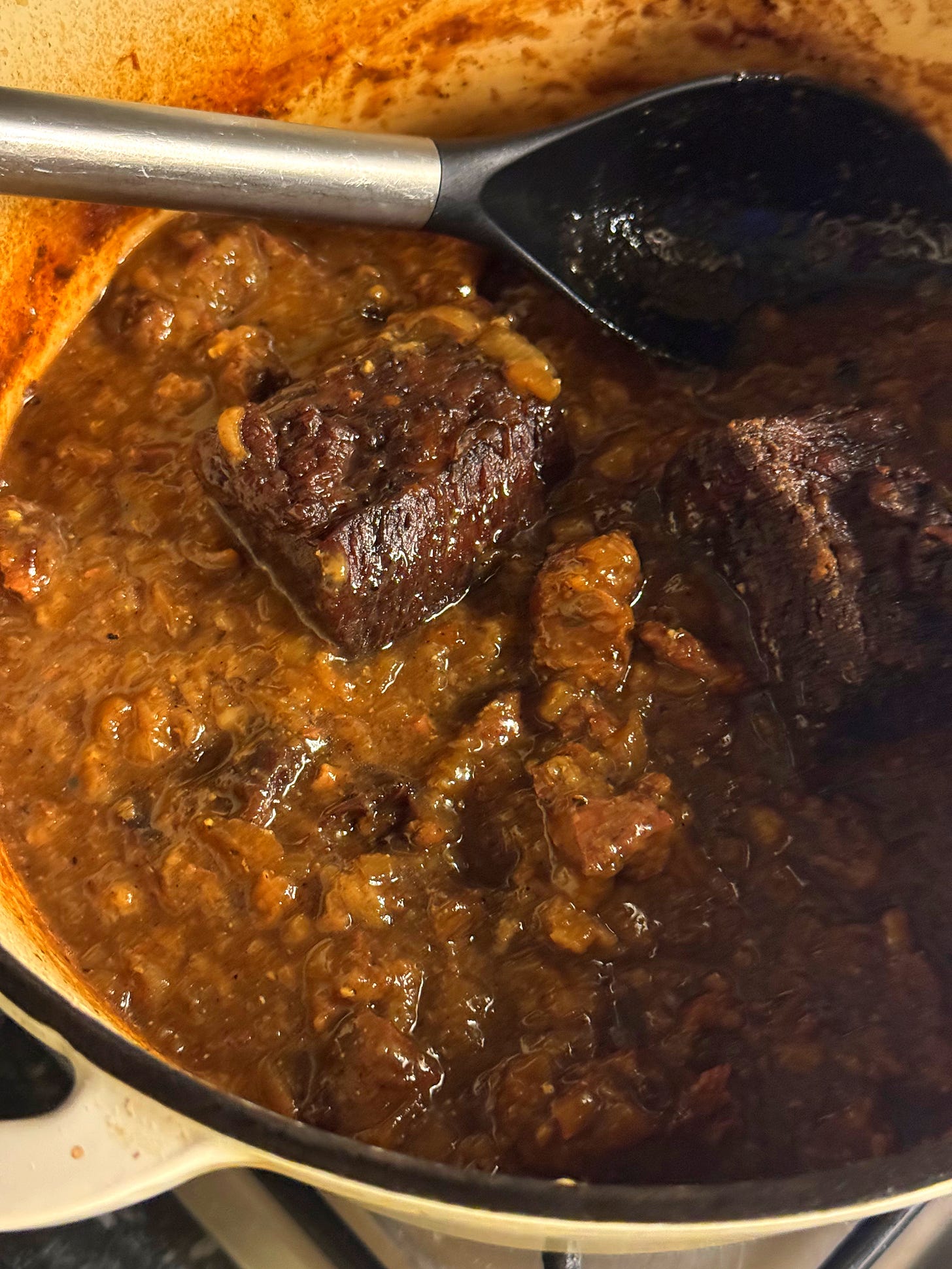 Once boiling, spread 2 tsp of Dijon mustard onto a slice of white bread, crusts removed. Place the slice of bread on top of the boiling stew, mustard side-down. Cover the pot with a lid and reduce to low heat. Simmer very gently for 2.5 hours, or transfer to a 140C oven and cook for 2.5 hours, or until the meat is knife-tender. Once tender, remove any rib bones and stir gently until the bread has dissolved.