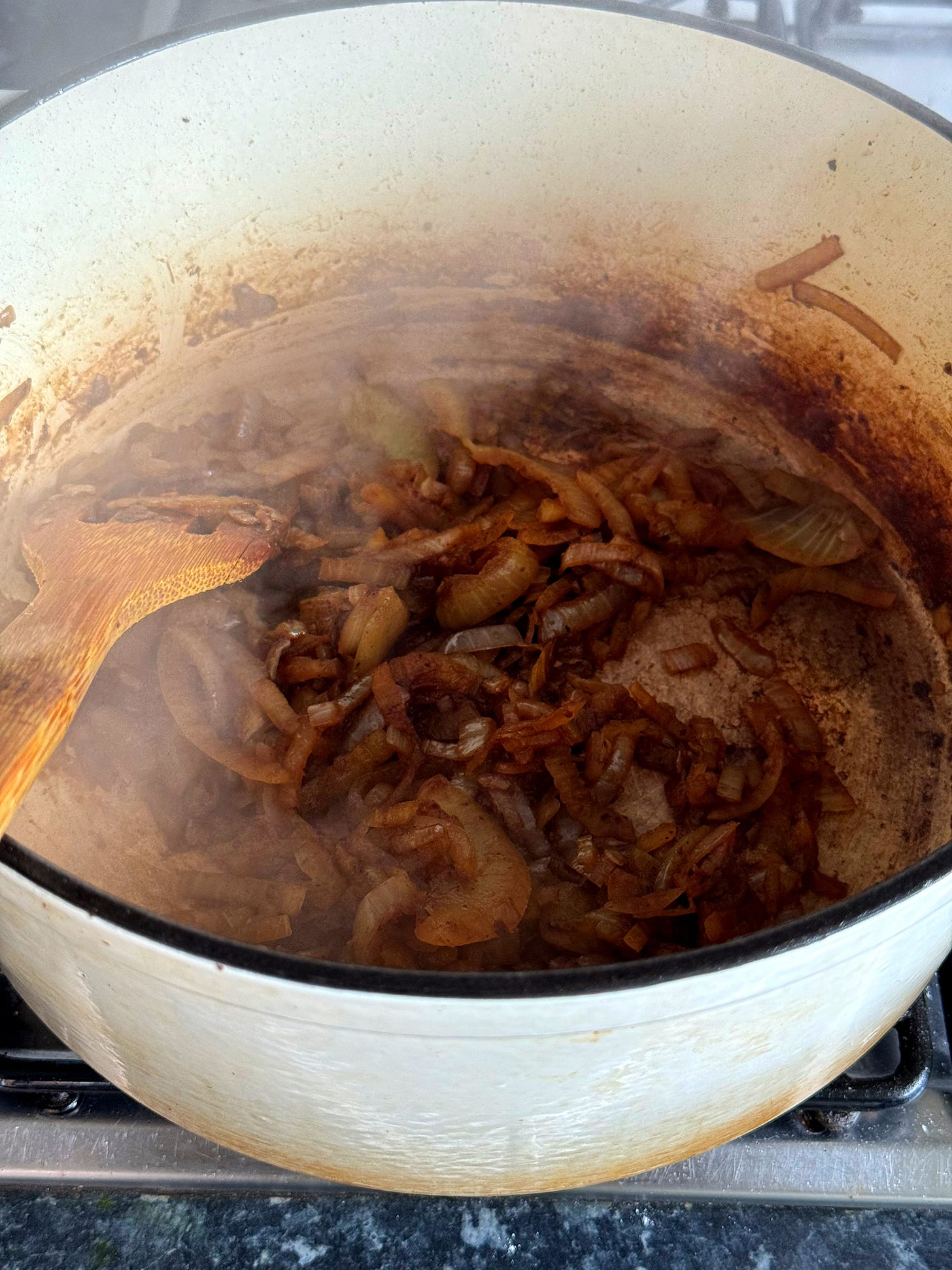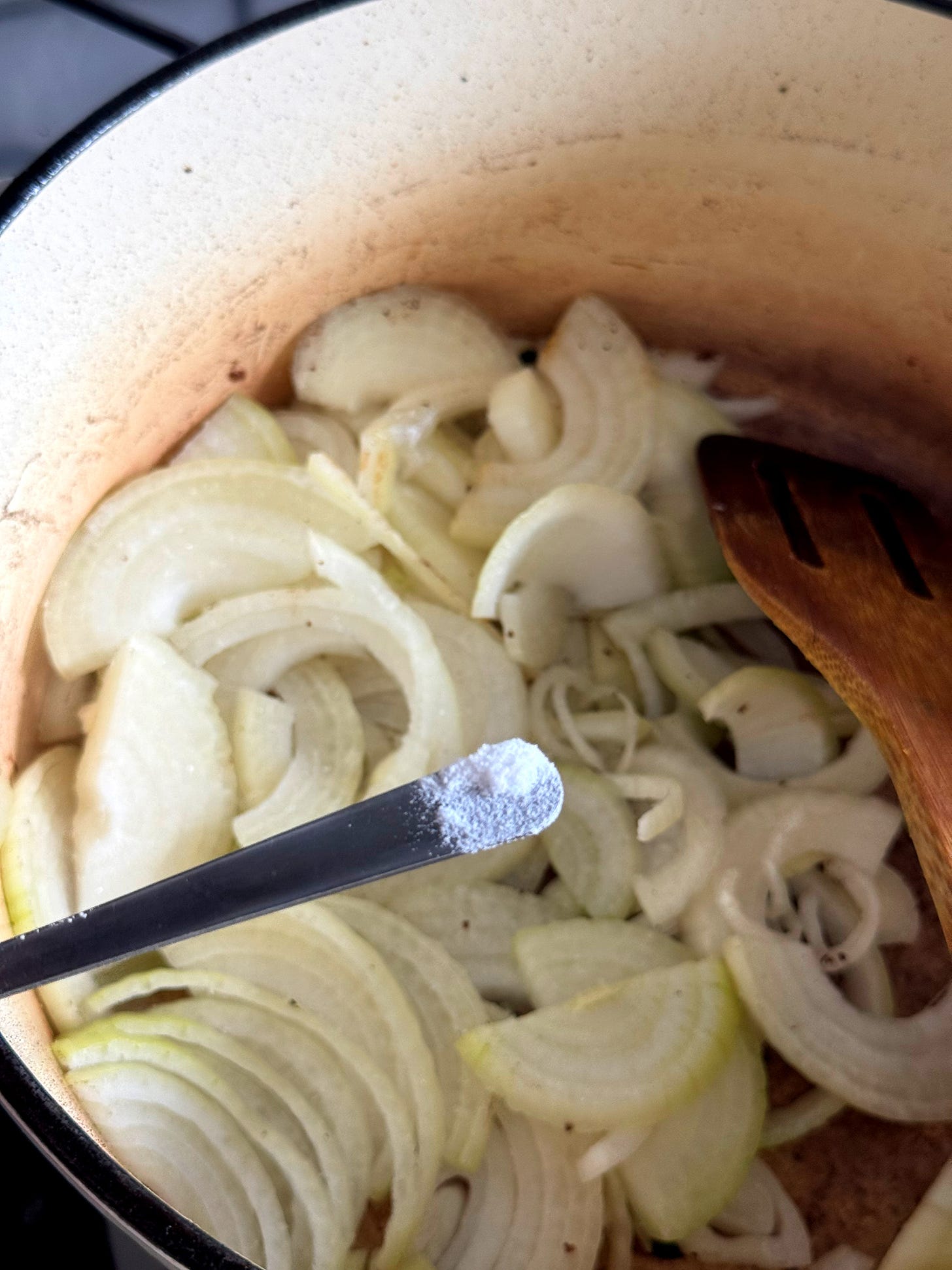 Once browned, place the beef pieces on a plate and set aside.Reduce the heat to low. Add the 2x sliced onions with a pinch of salt and 1/8 tsp of baking soda. Cook the onions slowly for 15–20 minutes, stirring often, until soft and lightly browned.