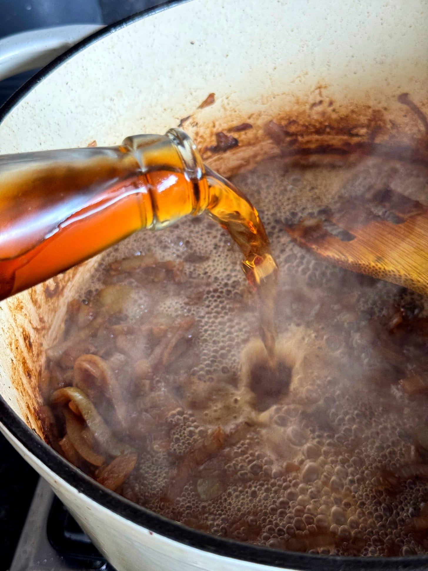 Add the 1 tablespoon of light brown sugar and stir them through the onions. Allow it to deepen in flavour and caramelise for 1-2 minutes before adding the 400ml of brown beer, 400ml of water and 1 tsp of vinegar.