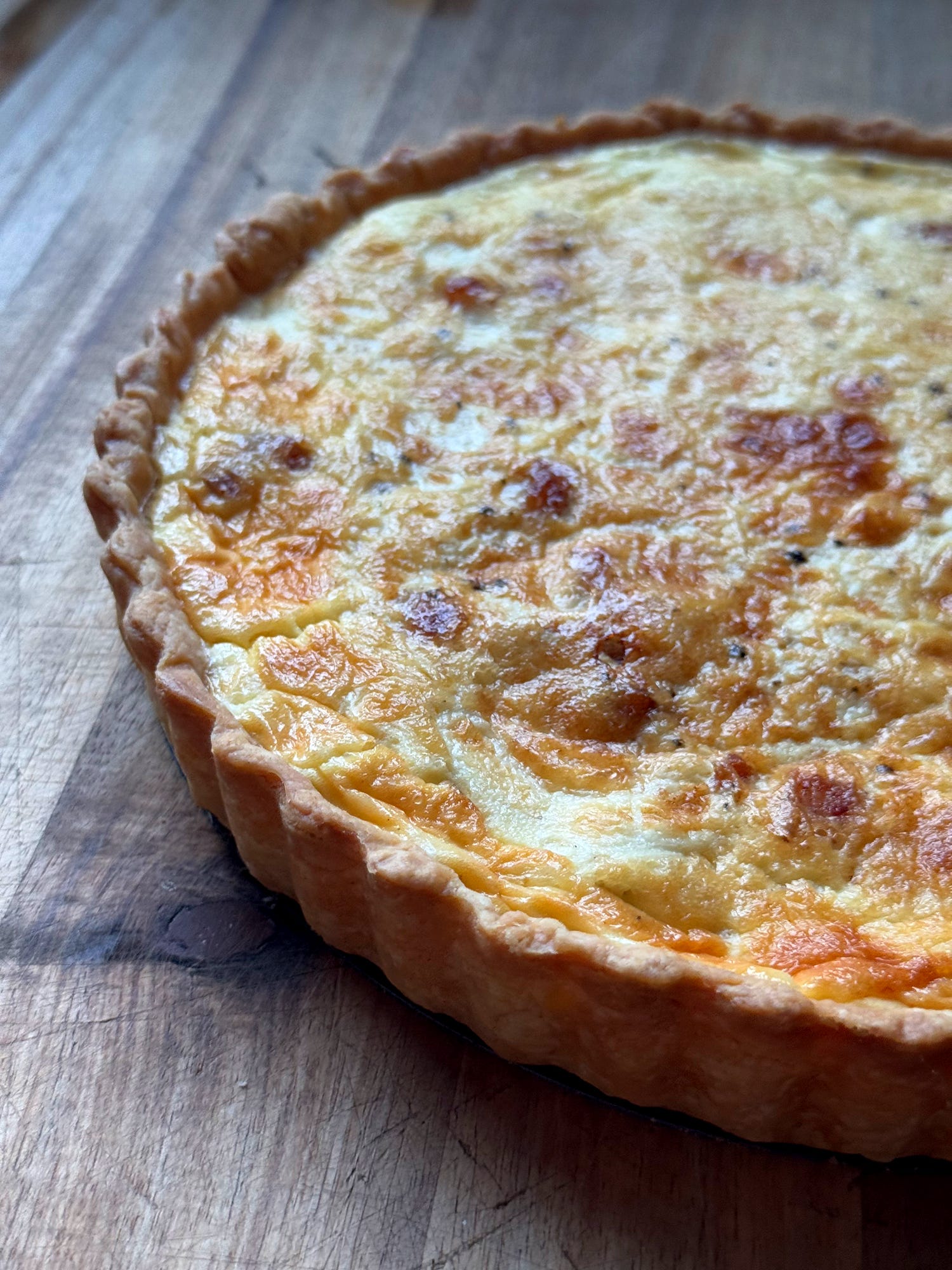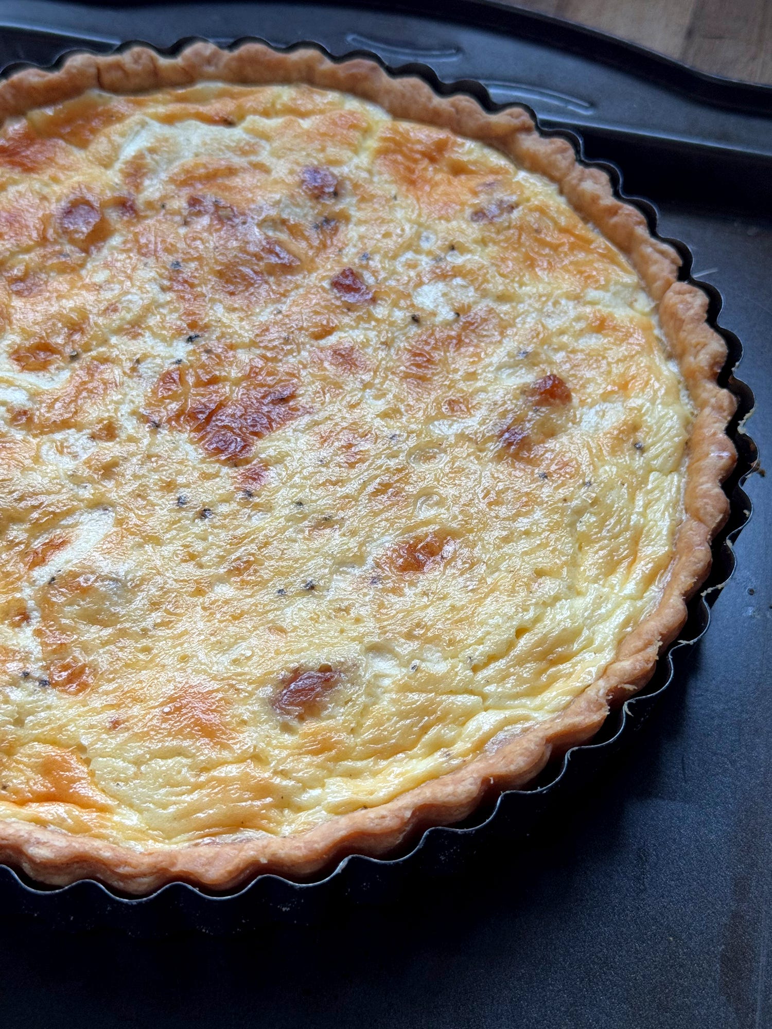 The quiche Lorraine is one of the most well-known styles of quiche in France. Originally from the north-east of France - the Lorraine region - this quiche contains no onions or cheese. Instead the filling is just eggs, bacon and dairy. The dairy takes many forms, but I prefer to use creme fraîche for a rich, silky custard filling with a refreshing tang. The bacon can be smoked or unsmoked, either way it’s fried to a crisp and added along with its flavourful fat. As for the pastry, we’re making a classic pâte brisée. Don’t feel intimidated by this term; this classic French savoury pastry will create a buttery, flaky crust and I’ll guide you through the whole process. Let’s go!