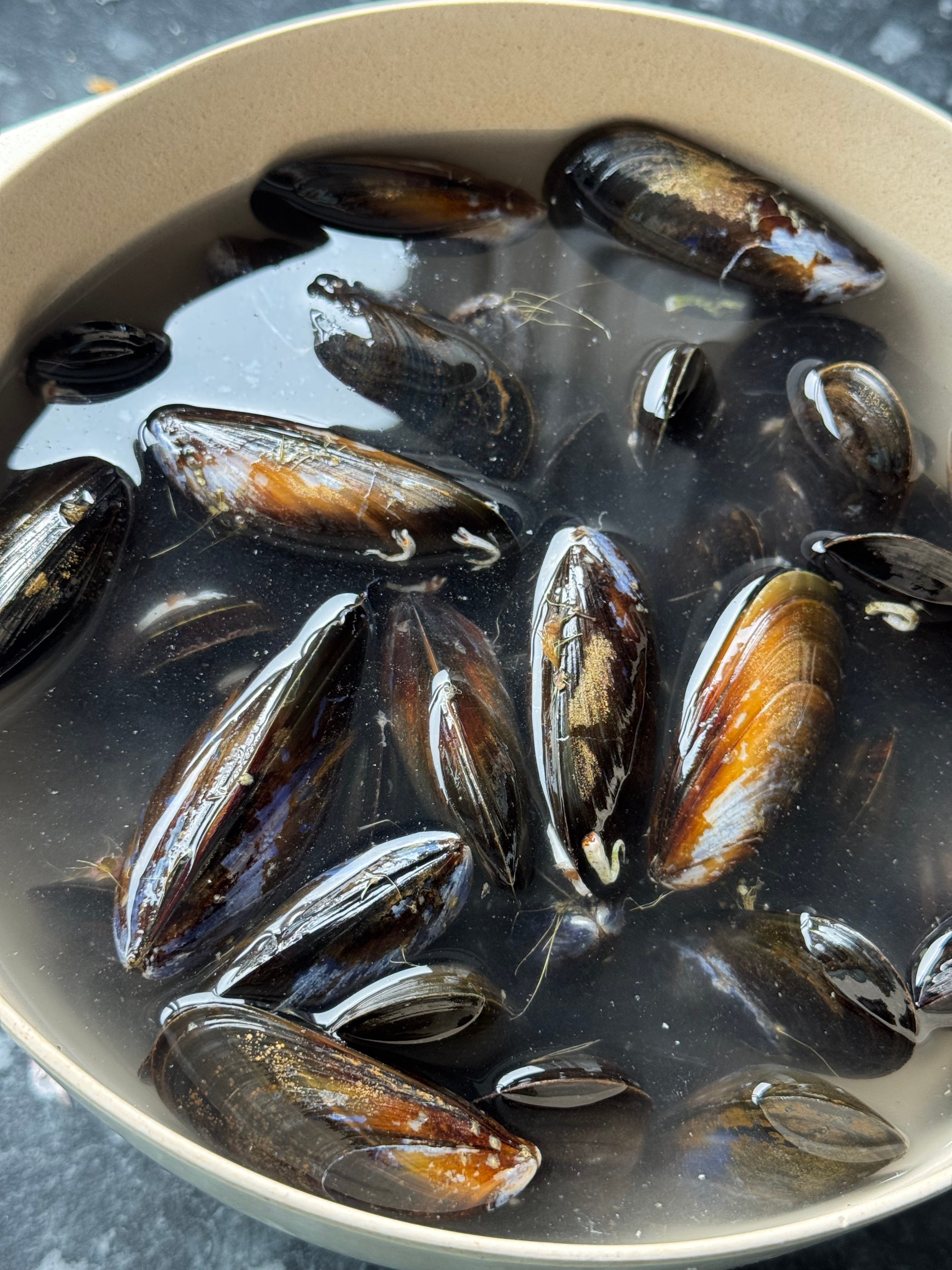 First, let’s soak the mussels. Mussels can be kept in the fridge for up to 2 days once purchased, though try and use them as soon as possible. Before cooking, place the 750g mussels into a bowl and cover them with water. Let them soak for 15 minutes. You may add a handful of oats to the water which encourages the mussels to expel any sand inside their shells - this is optional however.
