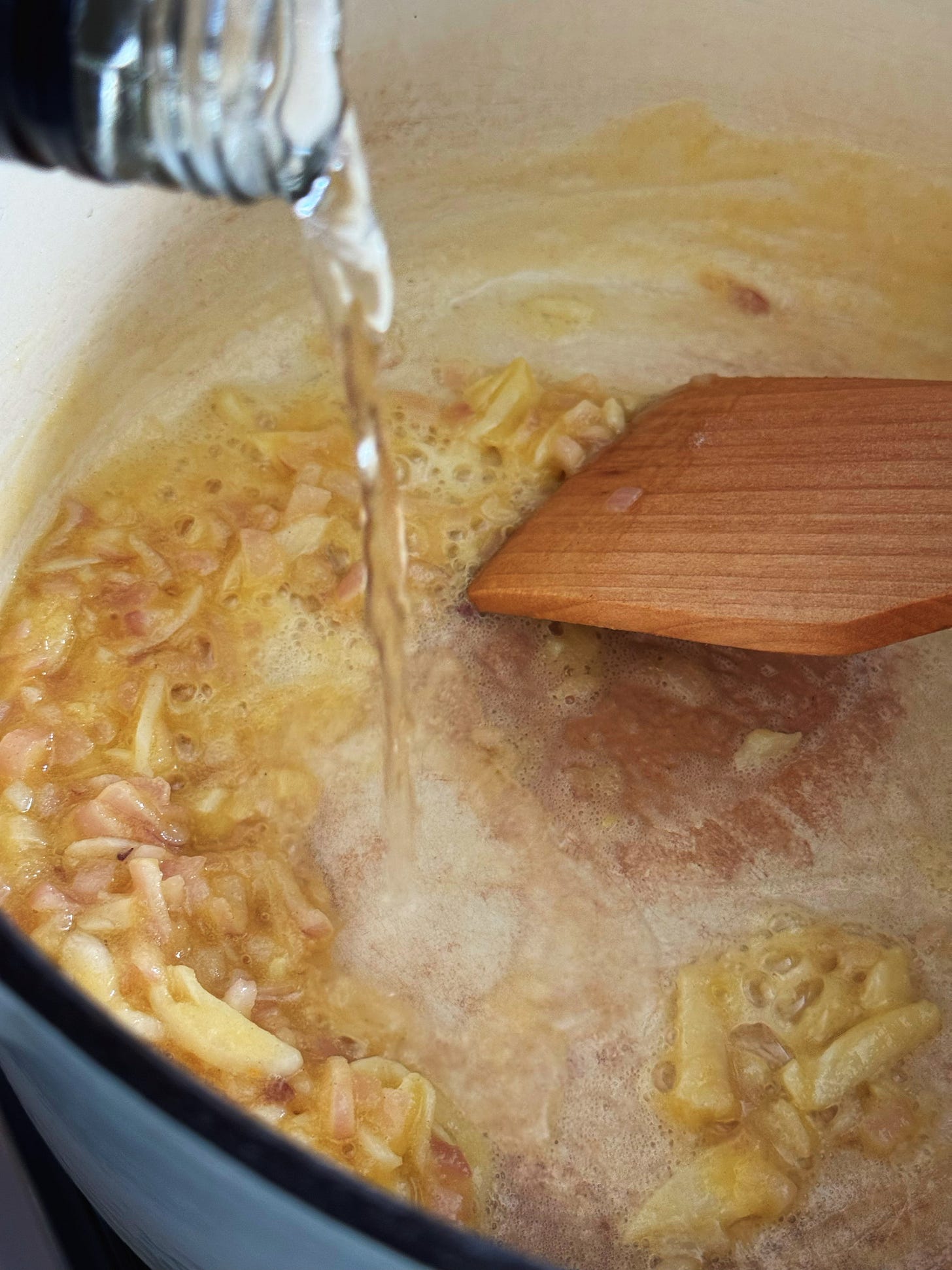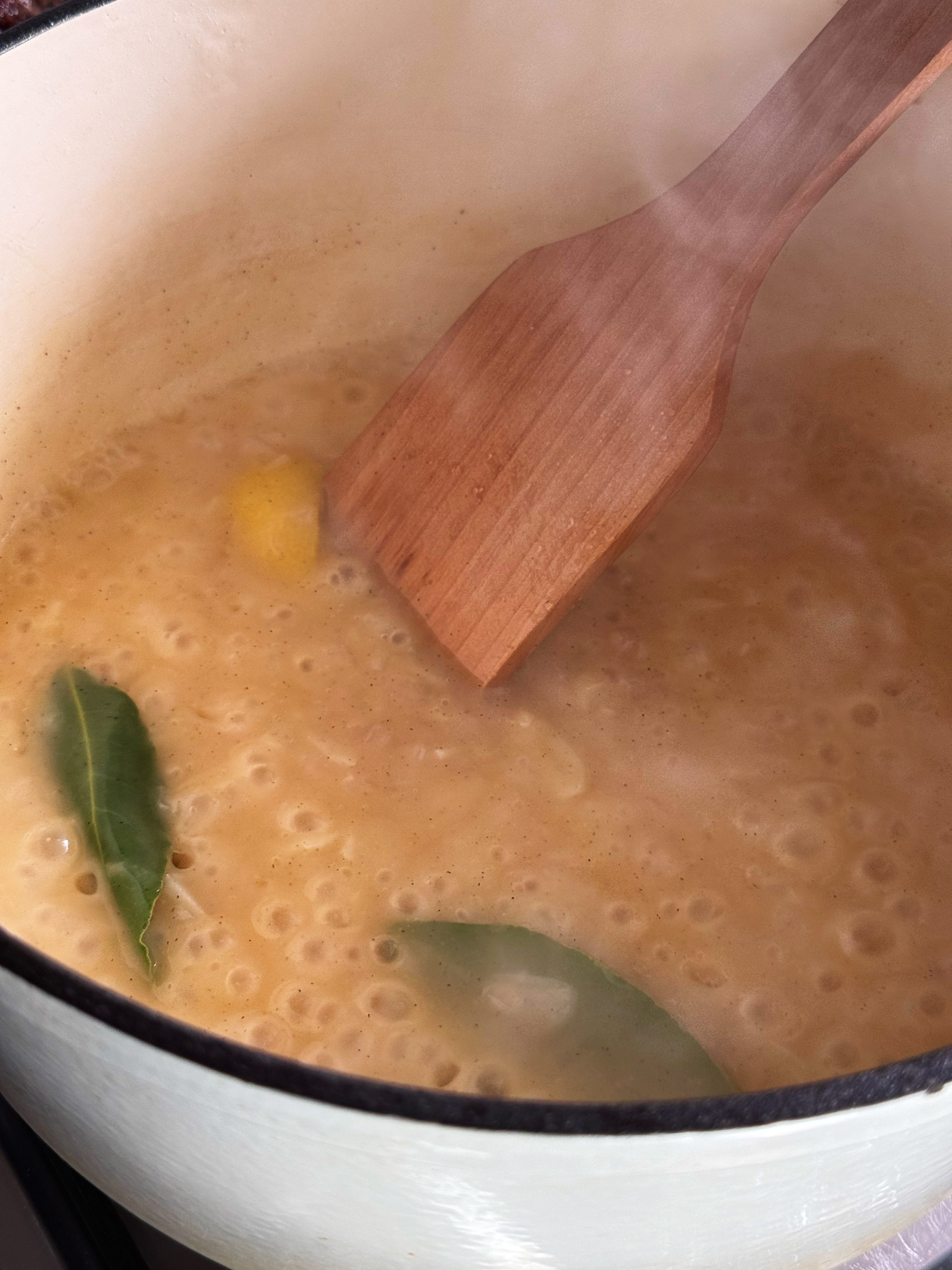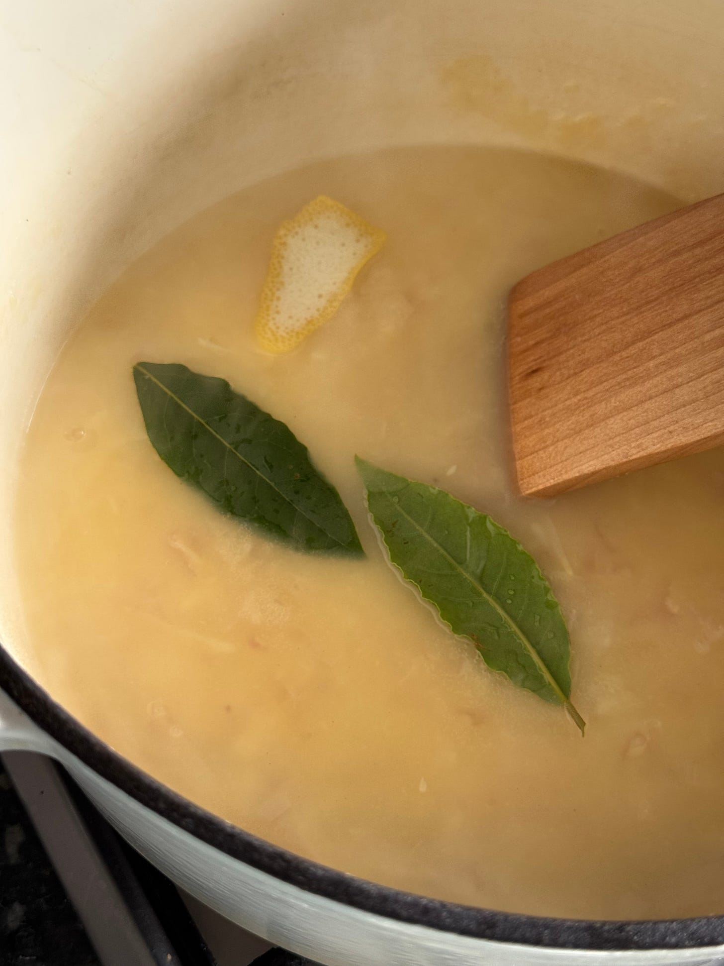 Add the 200ml of white wine followed by 1/2 tsp salt, 1/2 tsp pepper, 1-2 sprigs of thyme, 1x strip of lemon zest and 2x bay leaves. Bring the mixture up to a boil.