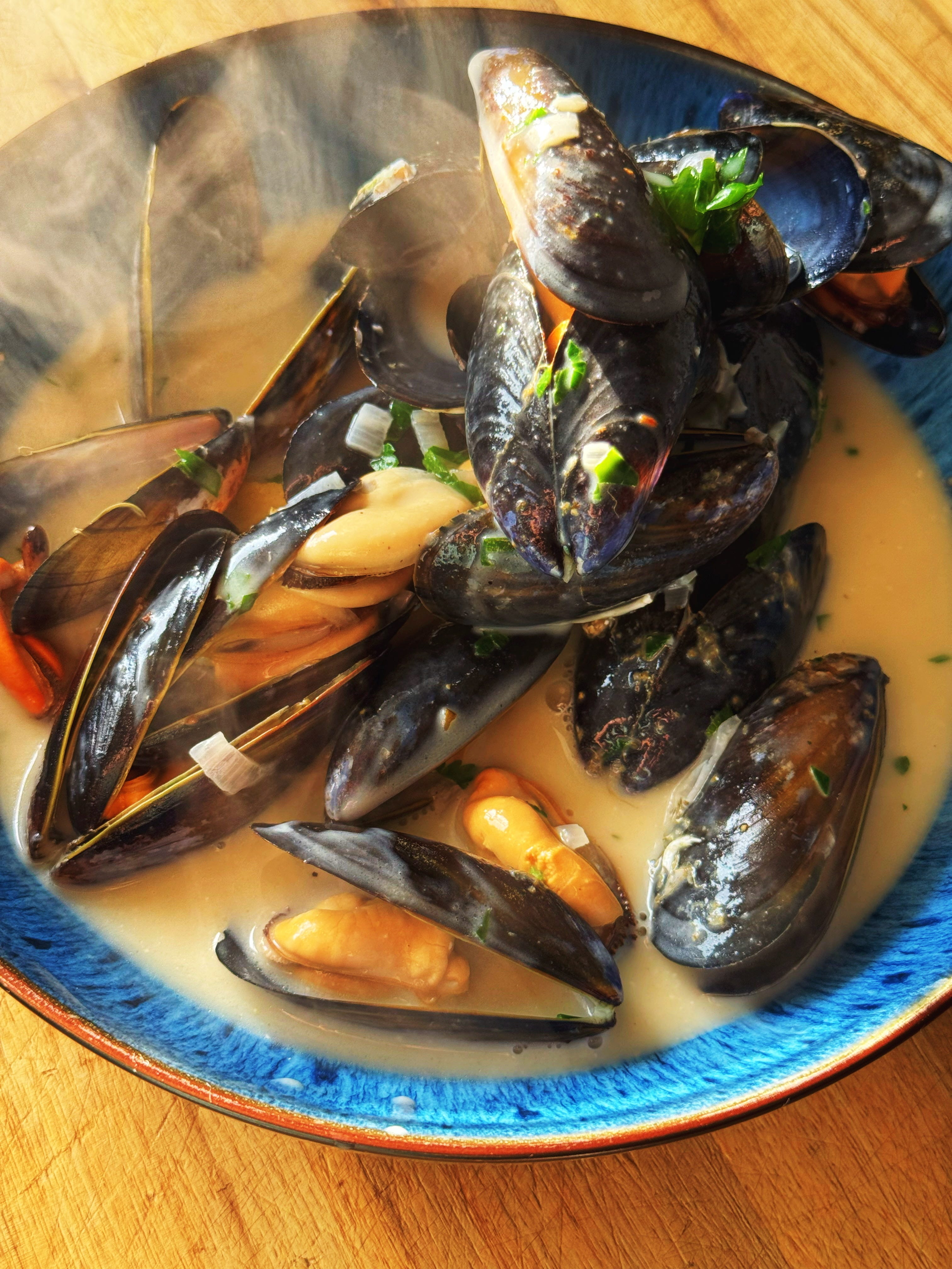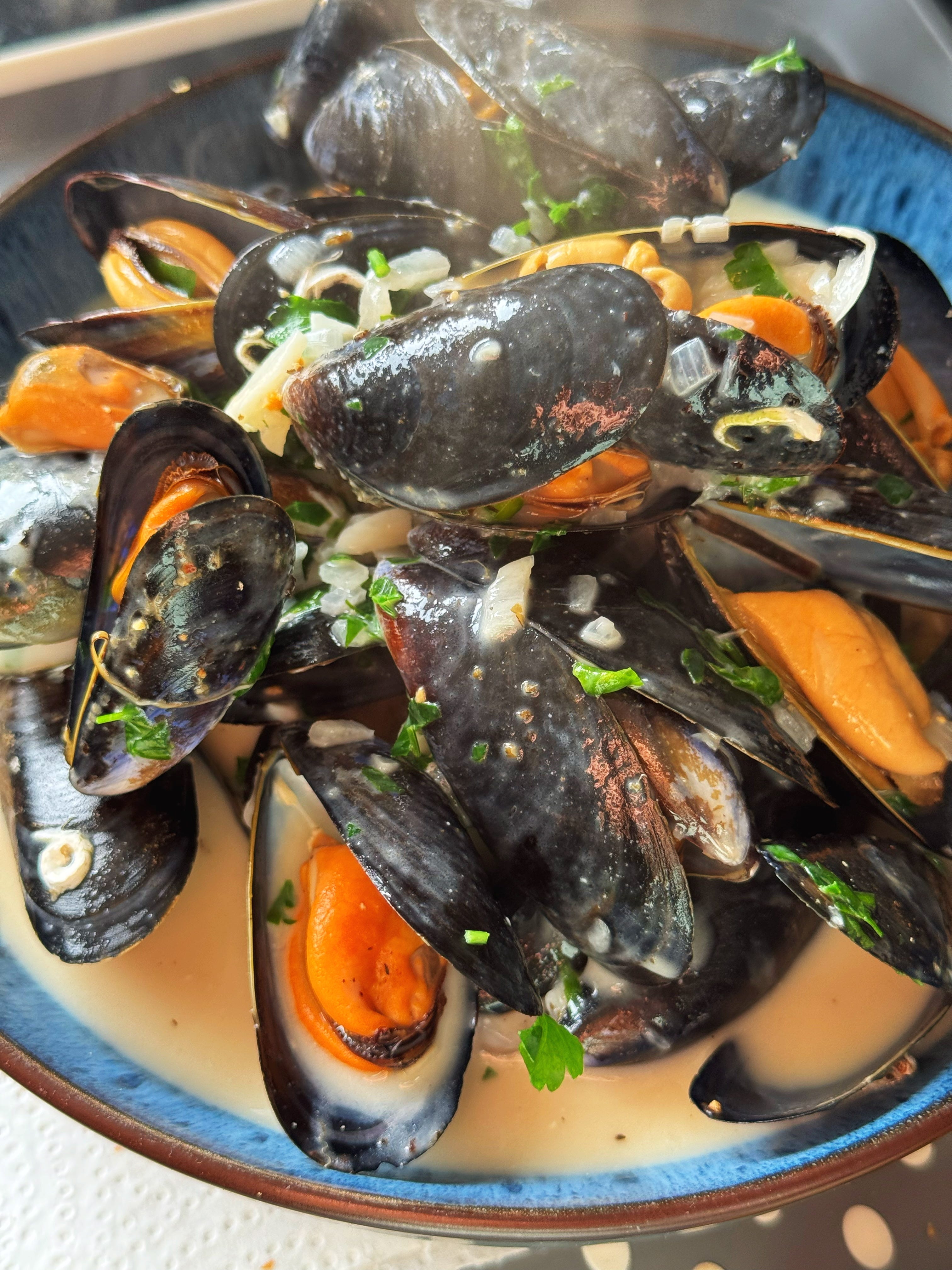 This classic mariner’s dish is popular along the coast of Northern France, especially in Normandy where seafood often meets dairy in the same pot. A bag of fresh mussels from a fishmonger can create a hands-on, indulgent meal with plenty of bread and even a bowl of fries to dip into the creamy juices afterwards. I’ll guide you through sorting fresh mussels, which ones are good and which ought to be discarded, and how to infuse them with savoury aromatics. This recipe features a slightly richer gravy than some versions of moules marinière, thickened with a ‘beurre manié’. This is simply a mixture of softened butter and flour which is added to the pan’s juices after cooking. The thickened cream sauce is then poured over the bowl of waiting mussels, hugging them just as they deserve to be. Let’s go!