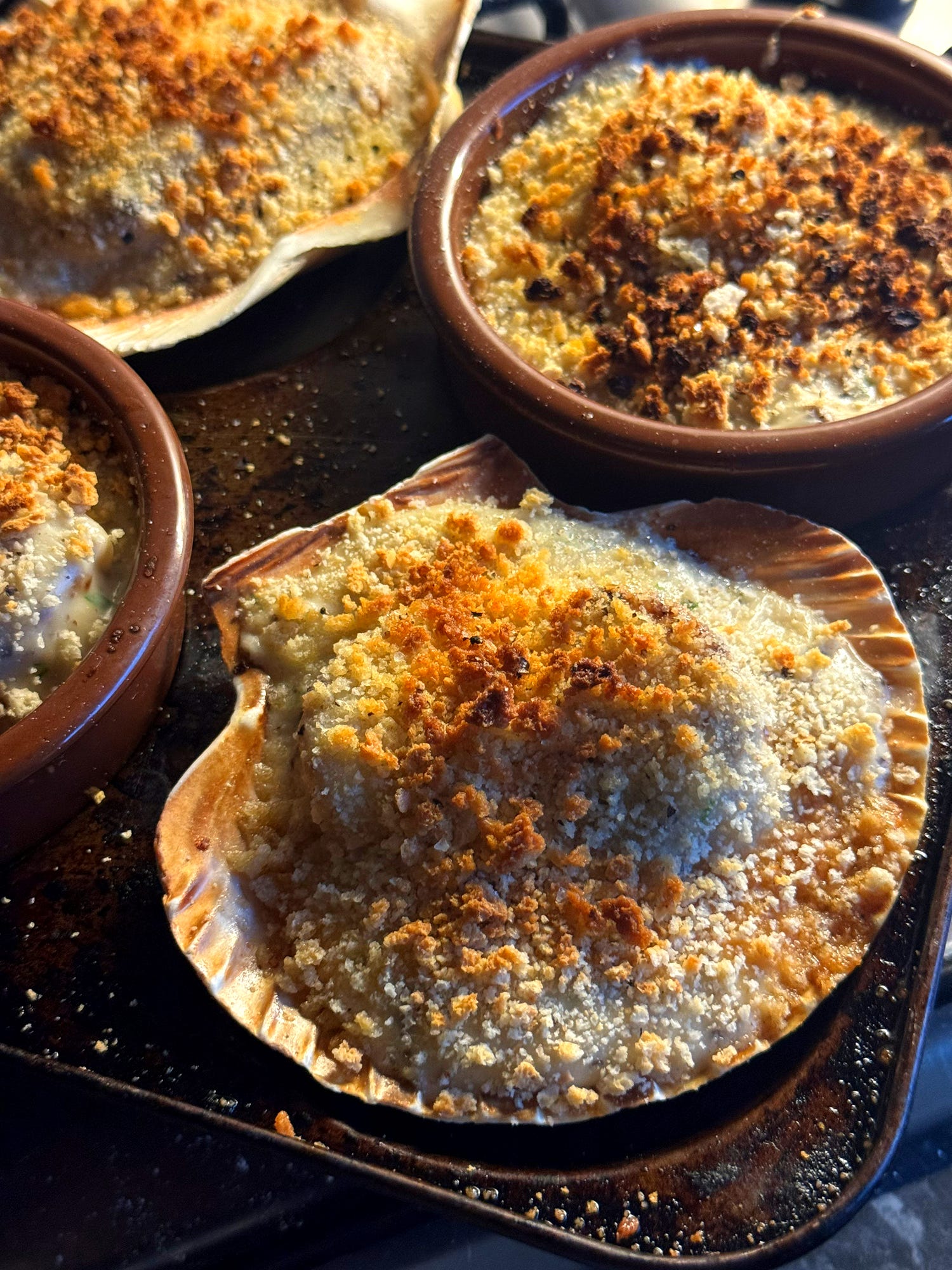 ‘Coquilles Saint Jacques’ is the French term for scallops, rather than the name of a specific dish. A few decades ago a particular scallop dish did the rounds under the same name, denoting a mixture of scallops and prawns cooked in a scallop shell with a cream sauce and piped mashed potatoes. This also happens to be my mother’s famous dish - she lived on the Isle of Jersey for 20 years and really got the taste for Normandy scallops! However, in Normandy there are many ways of cooking and serving Coquilles Saint Jacques, and not many people will pipe mashed potatoes on them. That version that was once so popular was actually a take on ‘à la Normande’ - ‘Norman style’. This style combines scallops with a sauce Normande, a white sauce flavoured with shallot, mushrooms and a nip of calvados/brandy, dry cider or white wine. A seafood essence is traditionally added too - ‘jus de moules’ - which is the cooking liquor left over from cooking mussels, but for this I recommend using a splash of Thai fish sauce. Although made with anchovies, Thai fish sauce actually embodies the exact same savoury, oceanic-umami that makes this sauce phenomenal. Combined with the umami potential of mushrooms, this sauce is really quite explosive with flavour. Feel free to deploy it on any freshly-cooked seafood of your choosing. Let’s go!