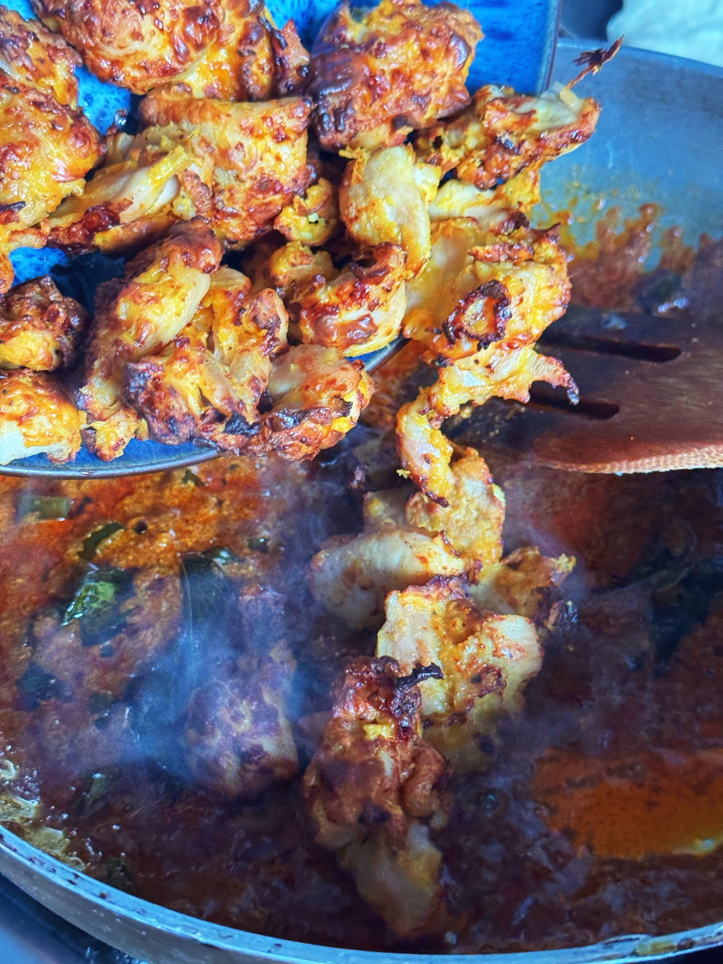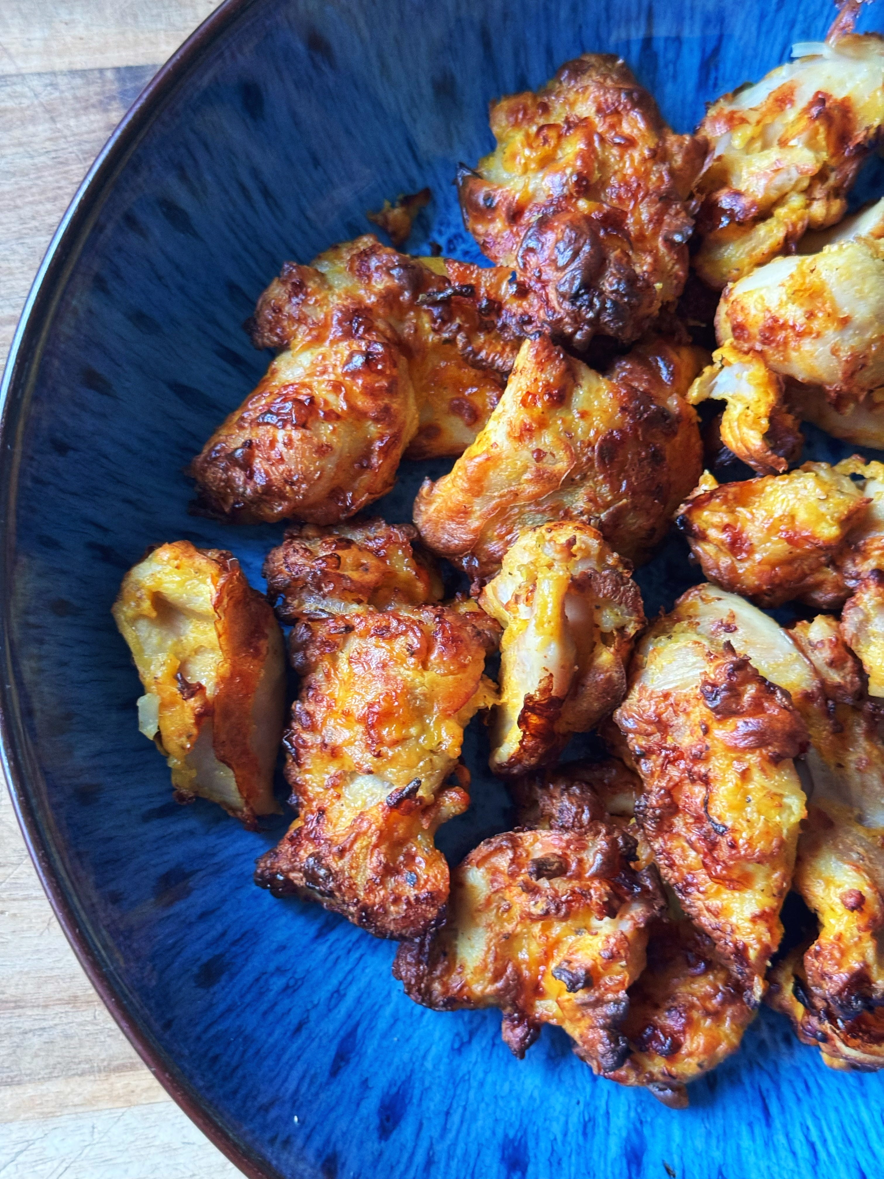 Serve the chicken at once with a skiff of coriander and/or mint, or keep it in the fridge and serve as a cold, spicy snack. Enjoy!