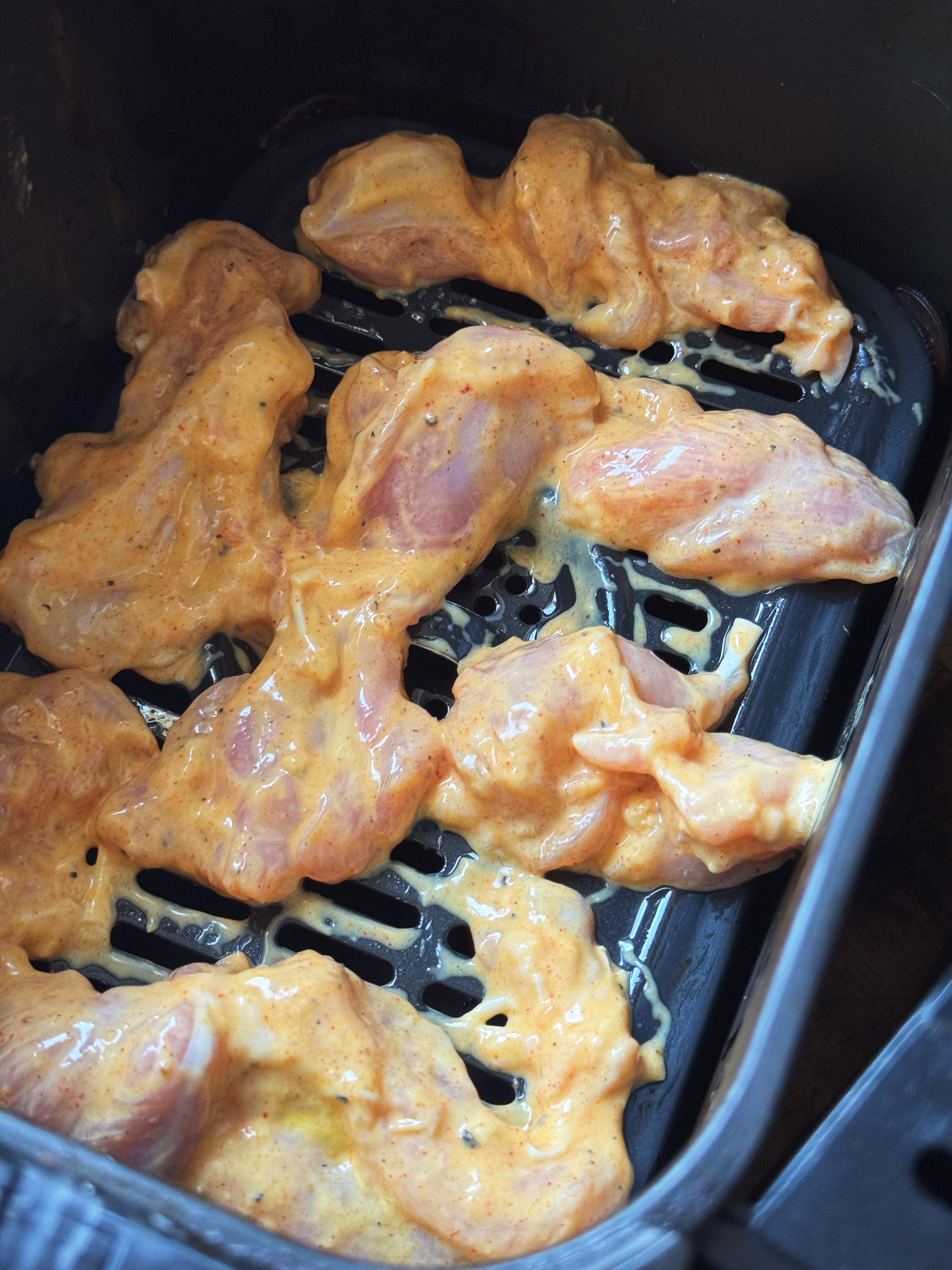 Place the marinated chicken pieces onto an oven rack and bake/air-fry it at 200C for 15 minutes, turning them over halfway, until the chicken is lightly browned and cooked through. Set this aside.