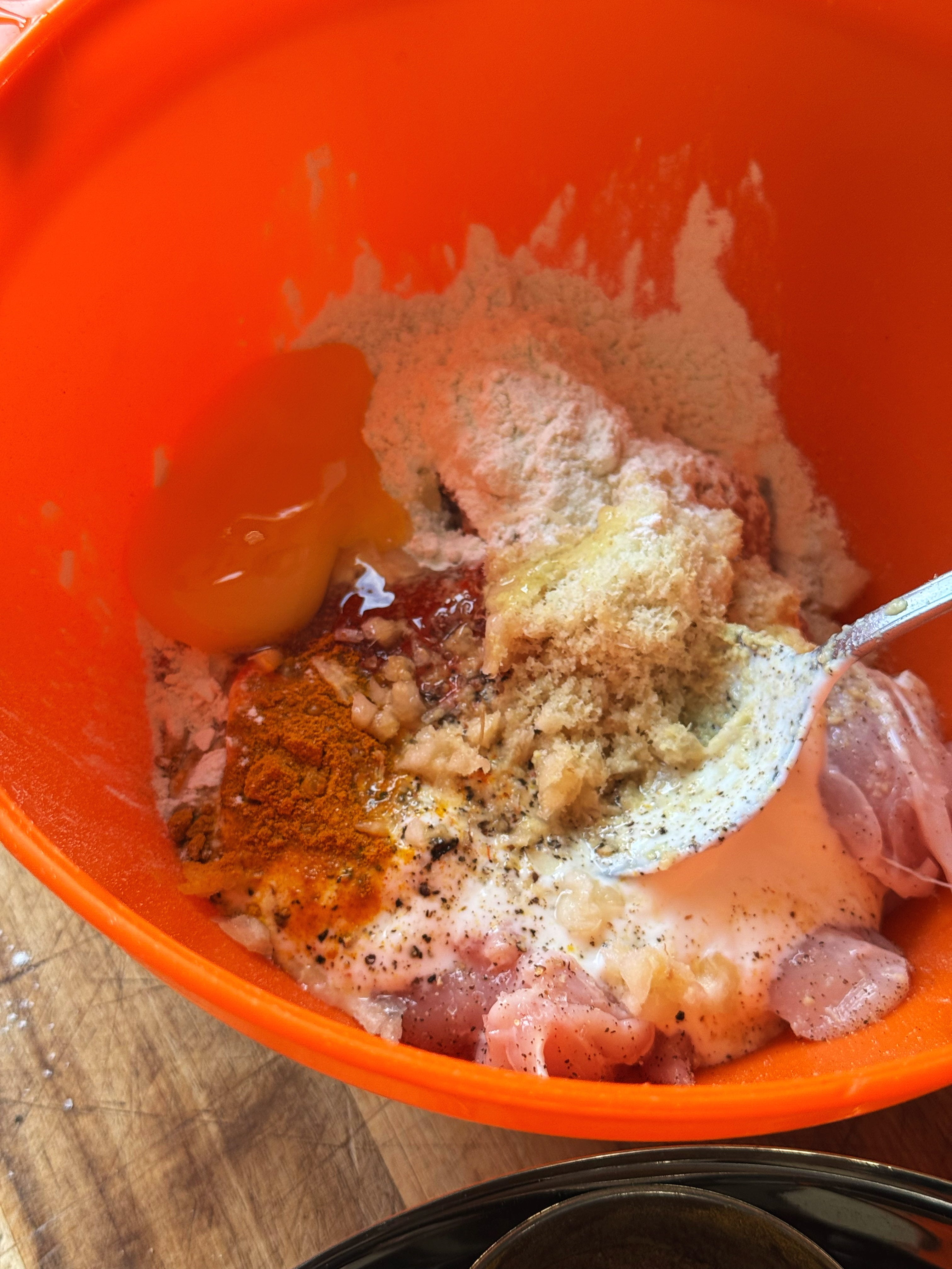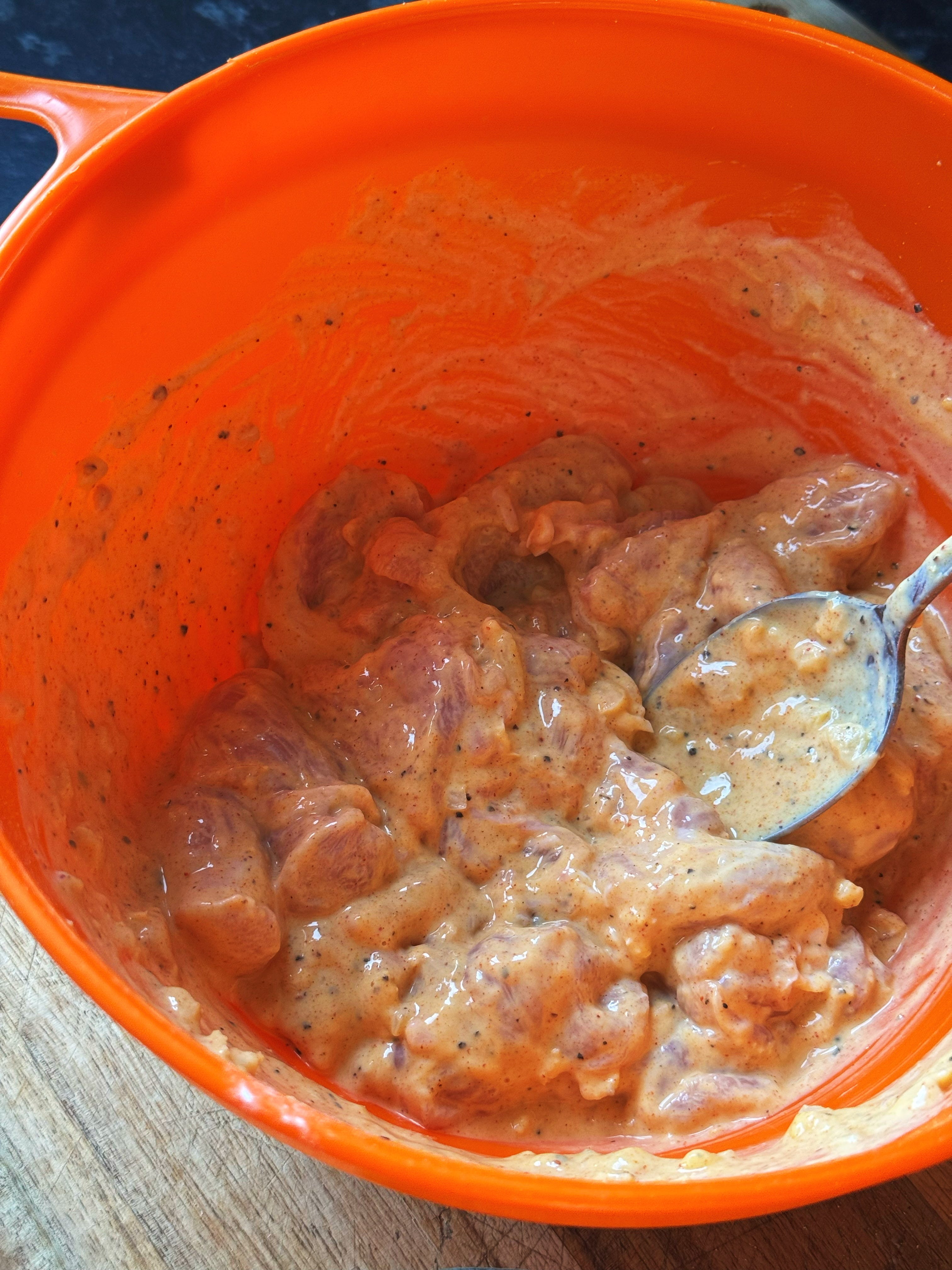 First let’s marinate the chicken in its yoghurt batter. Place the 300g boneless, diced chicken thighs into a bowl and add all of the chicken seasoning ingredients. Mix the chicken well until it is coated in a thick paste. Set this aside for 15 minutes.