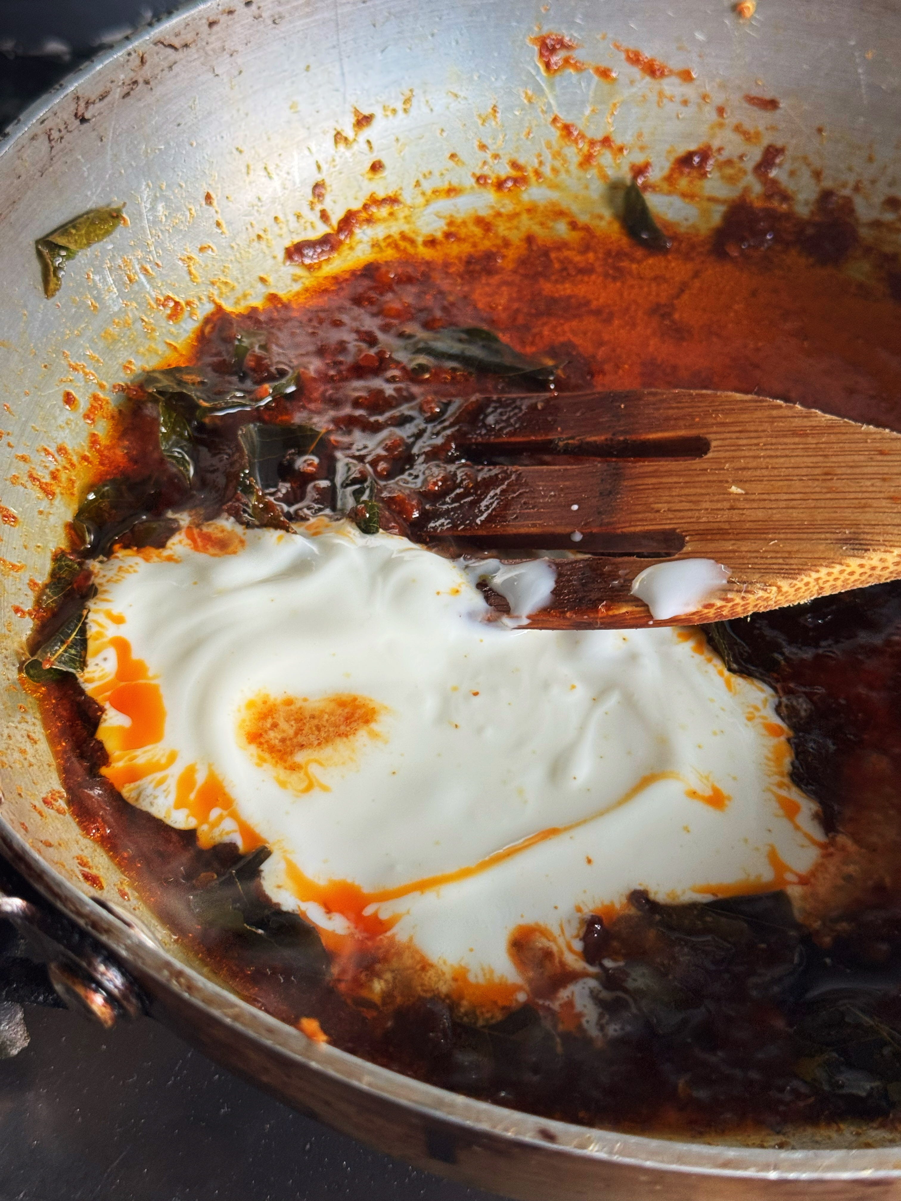 Turn off the heat and add the 3 tablespoons of yoghurt followed by 1/4 tsp salt. Stir the ingredients together until you form a small amount of sauce.
