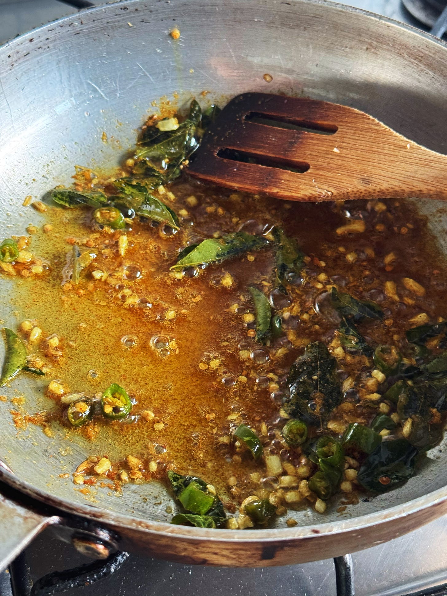 Add the sliced clove of garlic, ginger, green chilli and 6-8 curry leaves, if using. Fry these ingredients on medium heat for 1 minute until softened and fragrant.