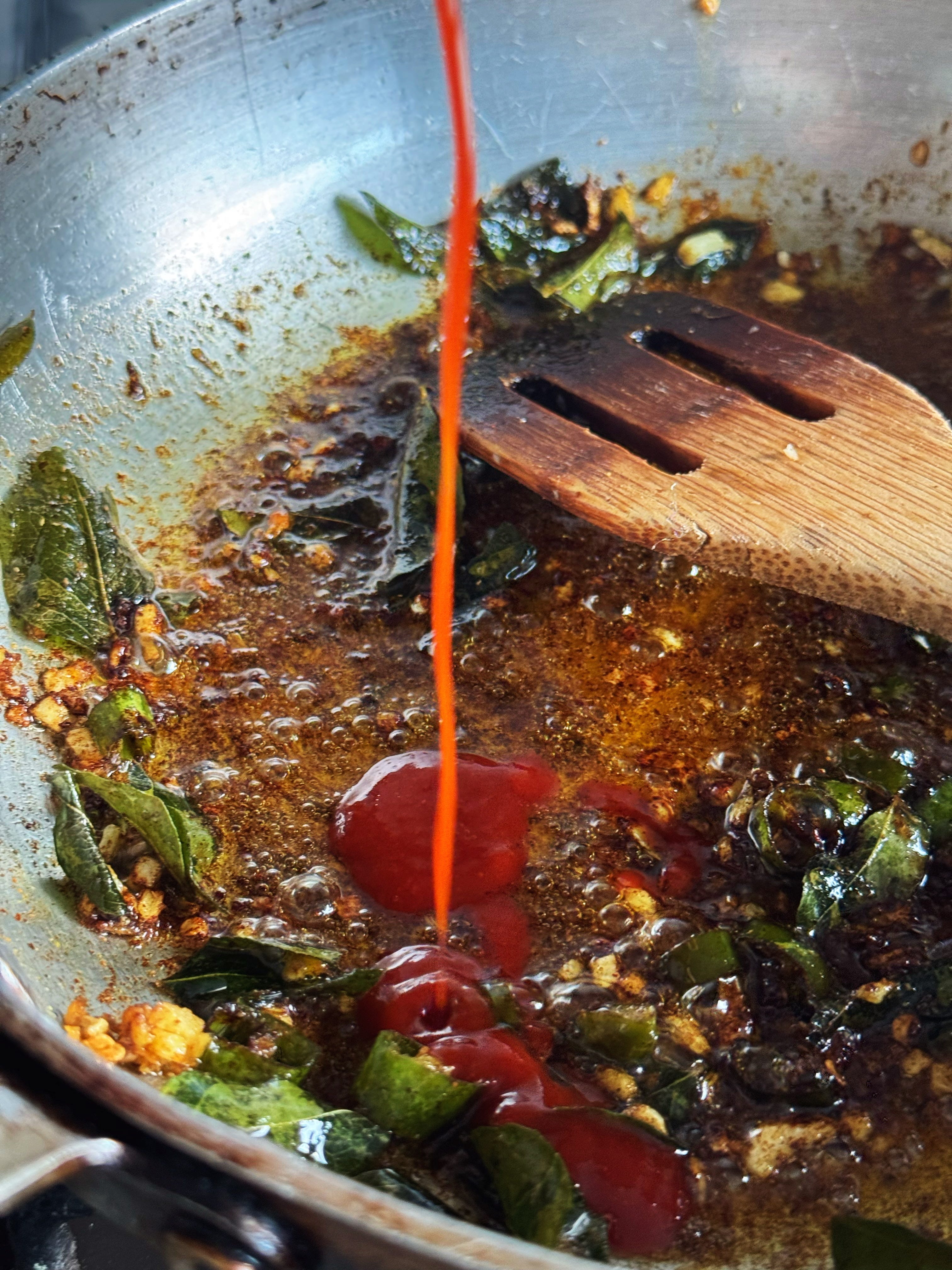 Add the 2 tsps dark soy sauce, 1 tablespoon of chilli sauce/ketchup and fry these into the sauce briefly for 30 seconds.