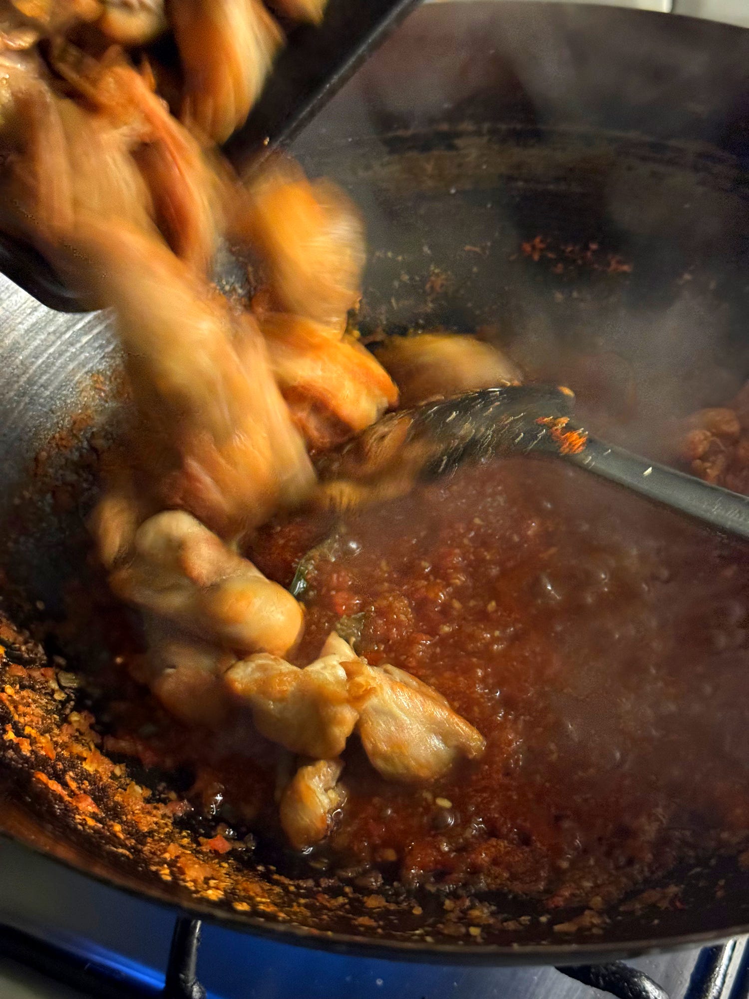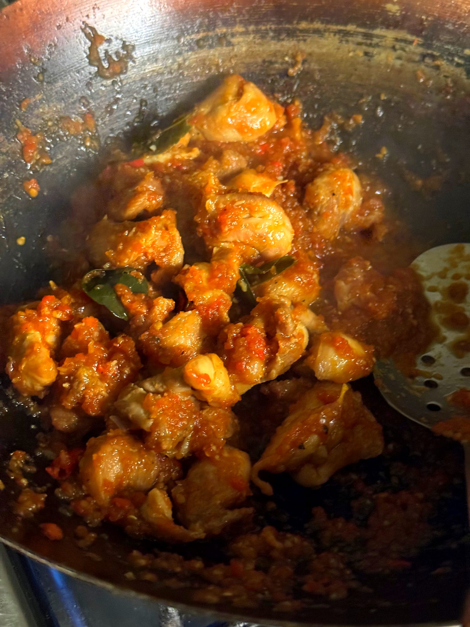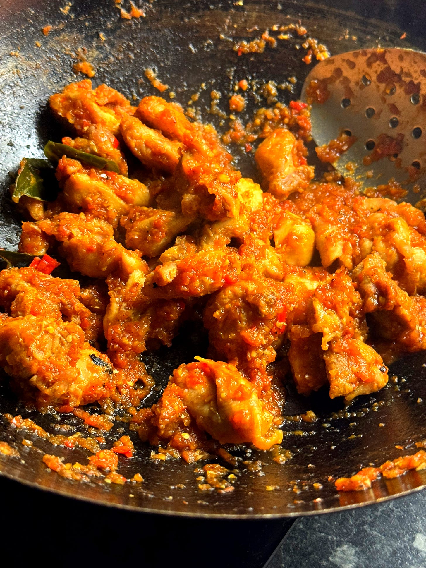 ‘Ayam Belado’ means ‘chicken cooked in chilli sauce’ and it might be the best way to dispense with any leftover cooked chicken or turkey after a feast. A simple blender job of fresh tomato, chillies and aromatics creates the bare bones of a rich, sweet and fiery tomato-chilli sauce which only needs a 5-minute simmer. This is a popular sauce with many Indonesian home cooks and can be combined with vegetables like green beans, hard-boiled eggs or meat and forms a complete plate with a heap of rice or mopped up with roti. The leftover chicken or turkey is given a flash-fry to revive it before ultimately meeting the sauce. It’s a great dish to make after a feast: Christmas, Eid, Thanksgiving and the like. A bowl of Indonesian fire is yours for the taking - if you choose to add the chillies, that is. Let’s go!
