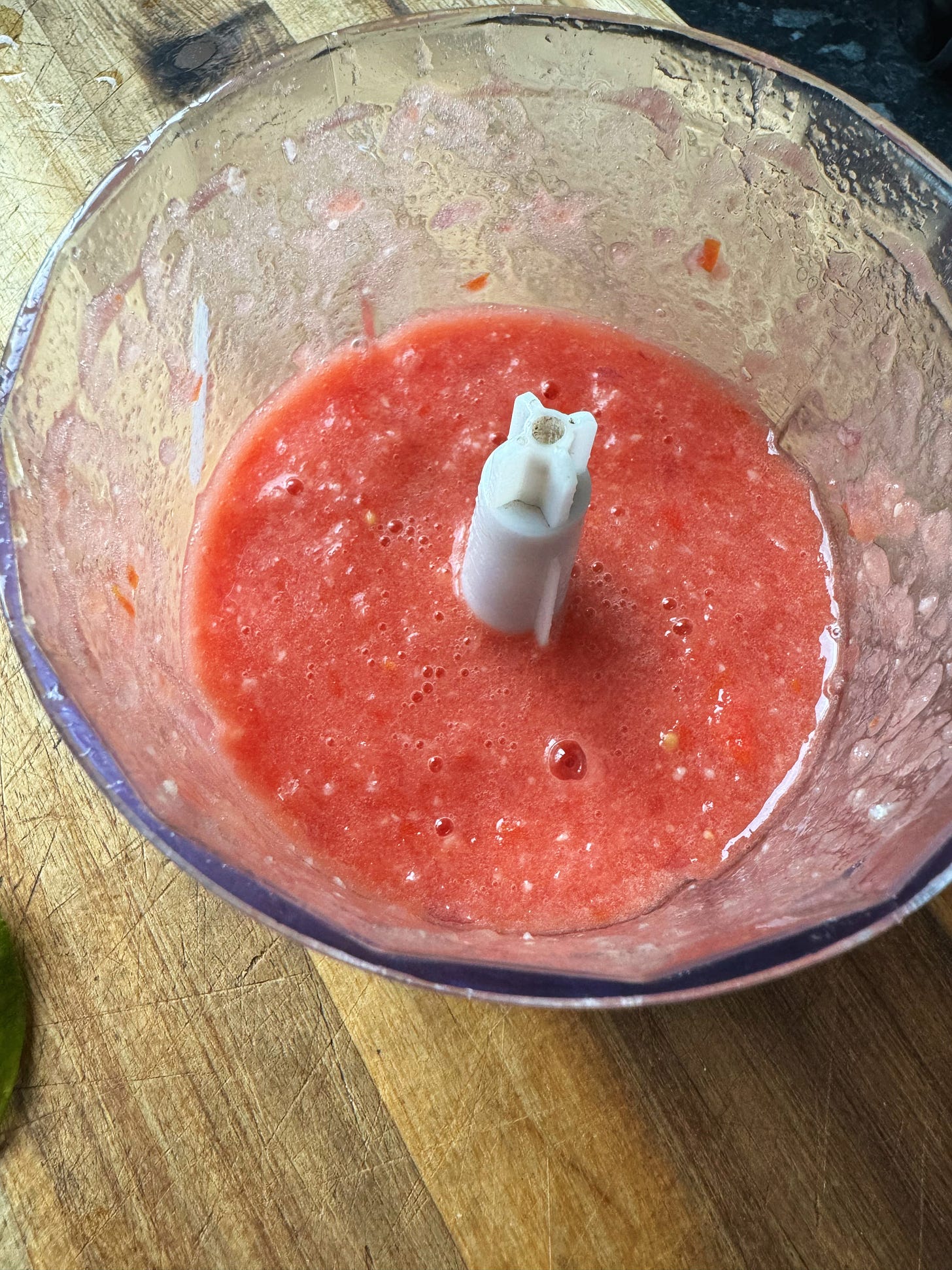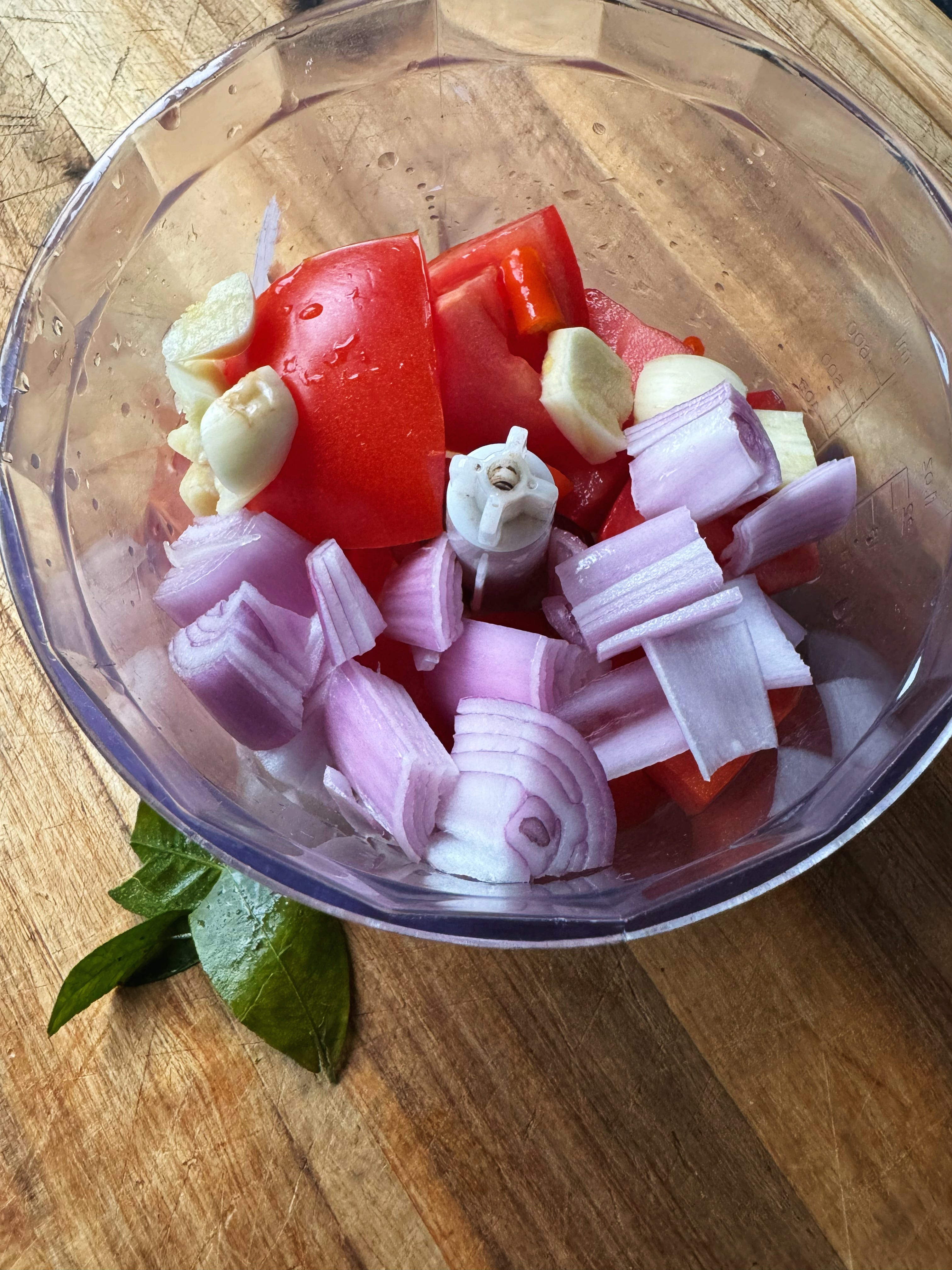 Let’s make the belado sauce. Into a small blender, add the 2x tomatoes, 1x shallot, 3x cloves of garlic and 1-3 birds eye chilli. Blend until you form a semi-smooth, loose paste. Set this aside.
