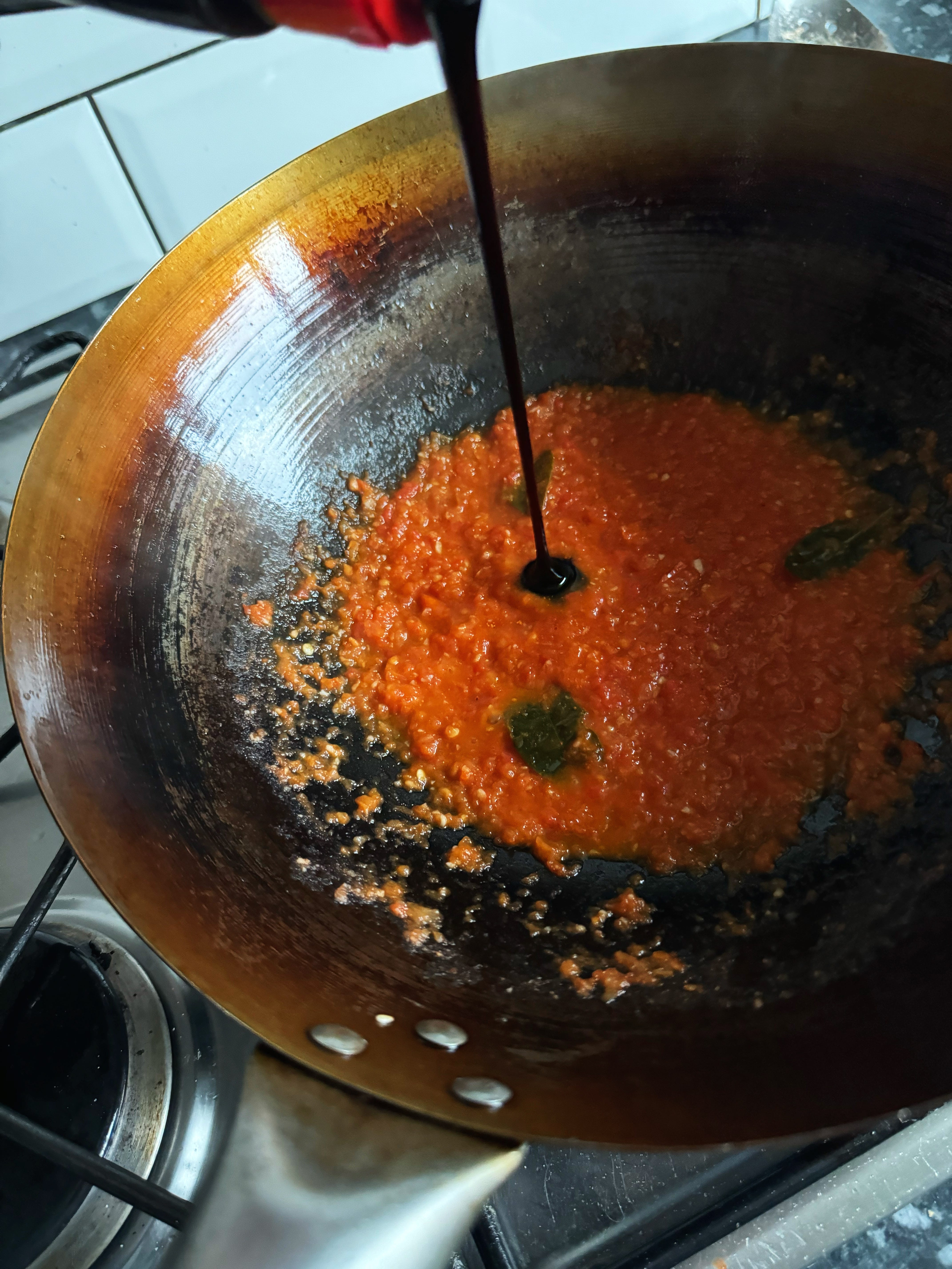 Now we’ll cook the belado sauce. Keeping the heat on medium-high, add the blended belado sauce. Bring the sauce to a boil then add the 1/2 tsp salt, 2 tsps sugar, juice of 1/2 lime and 2x lime leaves. Allow the sauce to cook for 5 minutes on medium-high heat until it’s reduced, thickened and darkened in colour. You should be able to draw a line through the pan with a spoon given its thickness. Taste for seasoning, and to finish, add 2 tsps of kecup manis (Indonesian sweet soy sauce) [BEST BUY]. This adds umami, sweetness and a deepened, tomato flavour