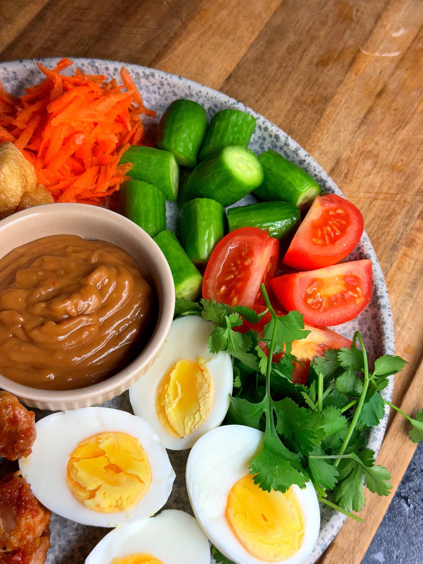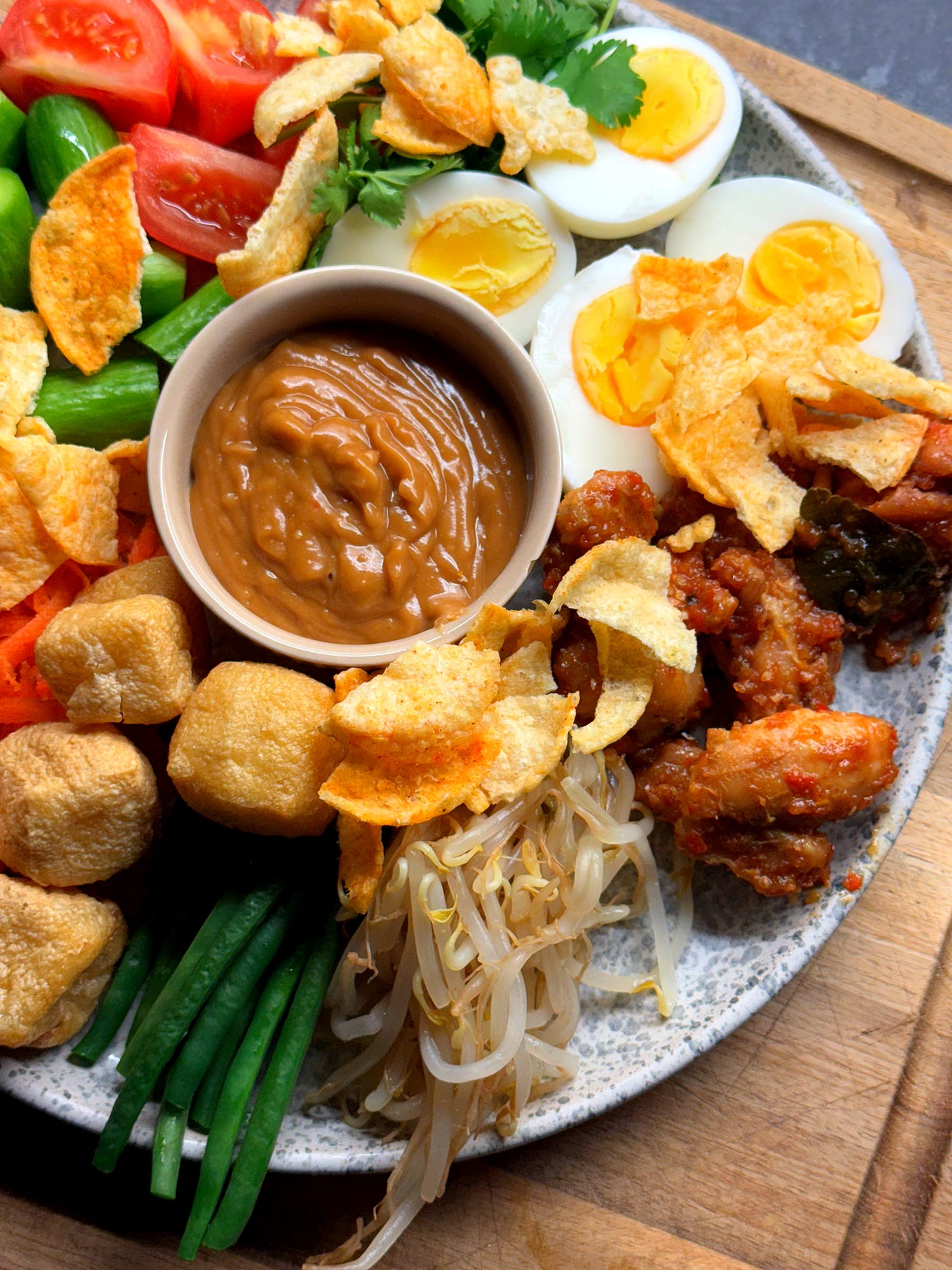 This exciting, hands-on Indonesian platter ties together a variety of cooked vegetables and protein with a spicy peanut-coconut sauce. A tantalising alternative for Christmas day leftovers.