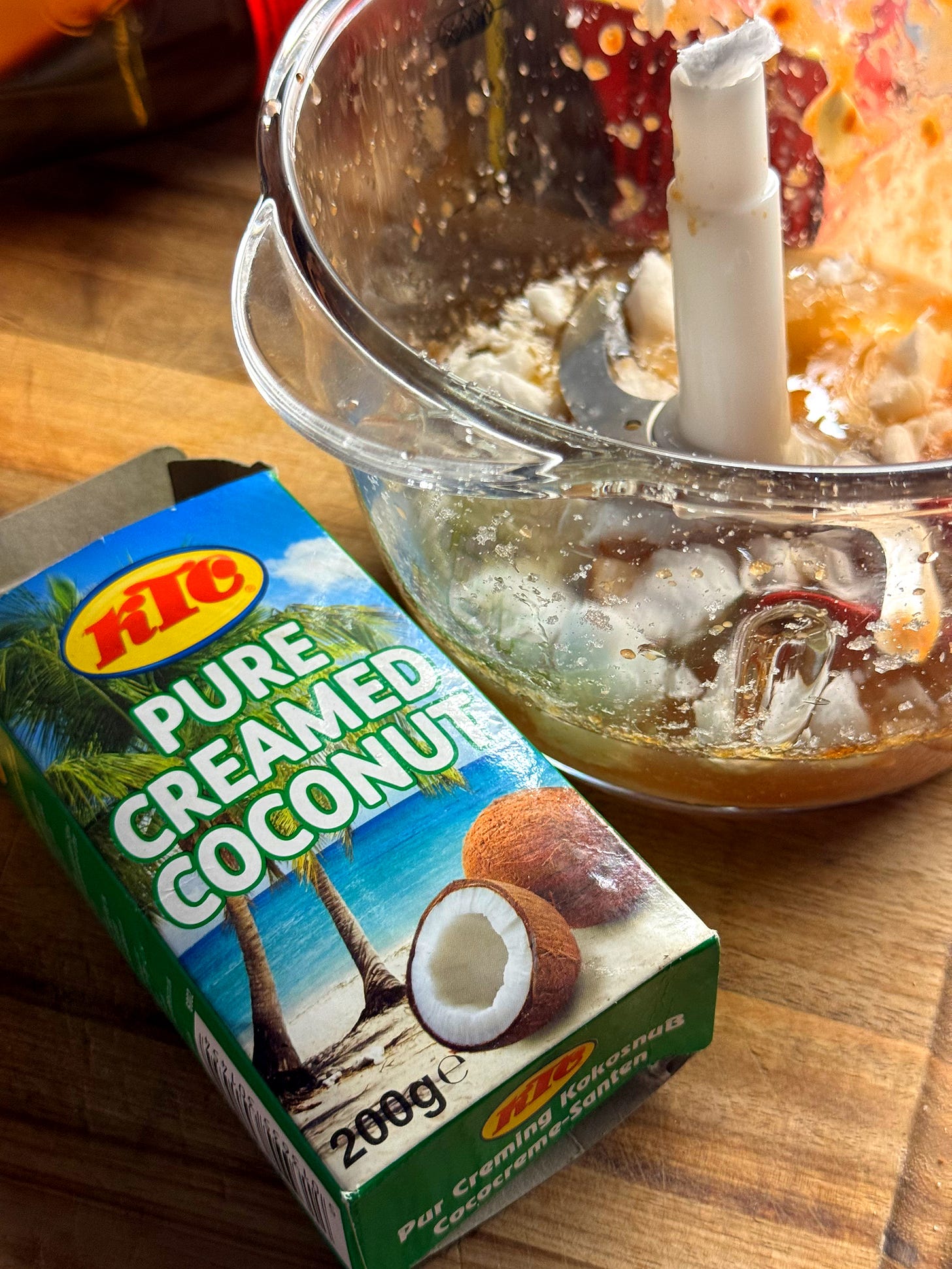 Transfer the mixture to saucepan and add the 50g coconut cream, crumbled up if solid, and 100ml of water. Place the pan onto medium heat and bring the mixture to a boil, stirring until the coconut cream has melted and dissolved.