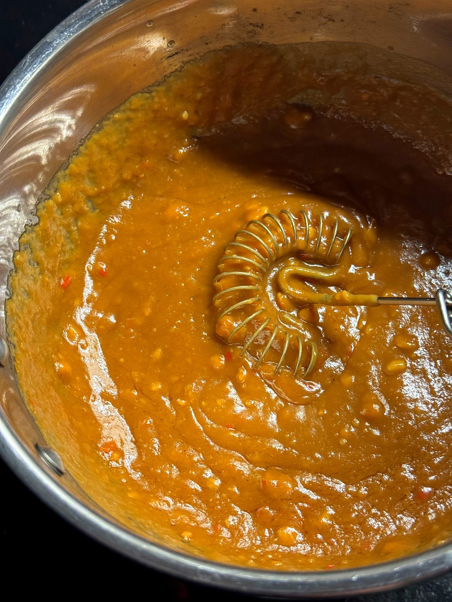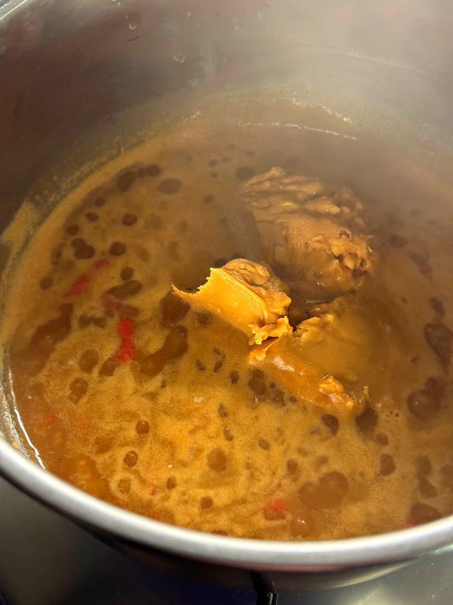 Add the 2 tablespoons of peanut butter and stir until combined. The mixture will initially curdle and seize, but will eventually loosen out after stirring. If the mixture remains curdled and thicken, loosen the mixture by adding some water.