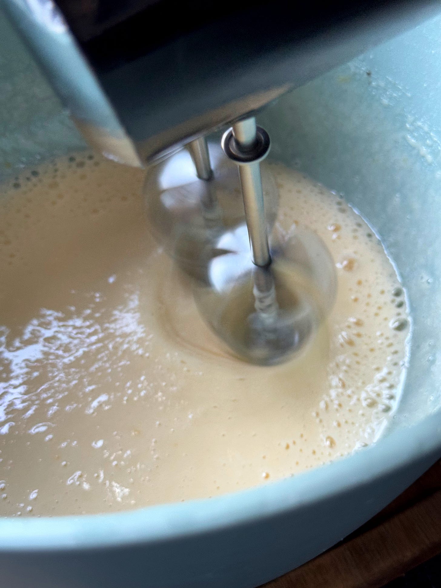 In another mixing bowl, add the 2 eggs and 140g caster sugar. Whisk for 2-3 minutes until lightly aerated. Add the 1 tsp vanilla and 1/2 tsp almond extract and mix to combine.