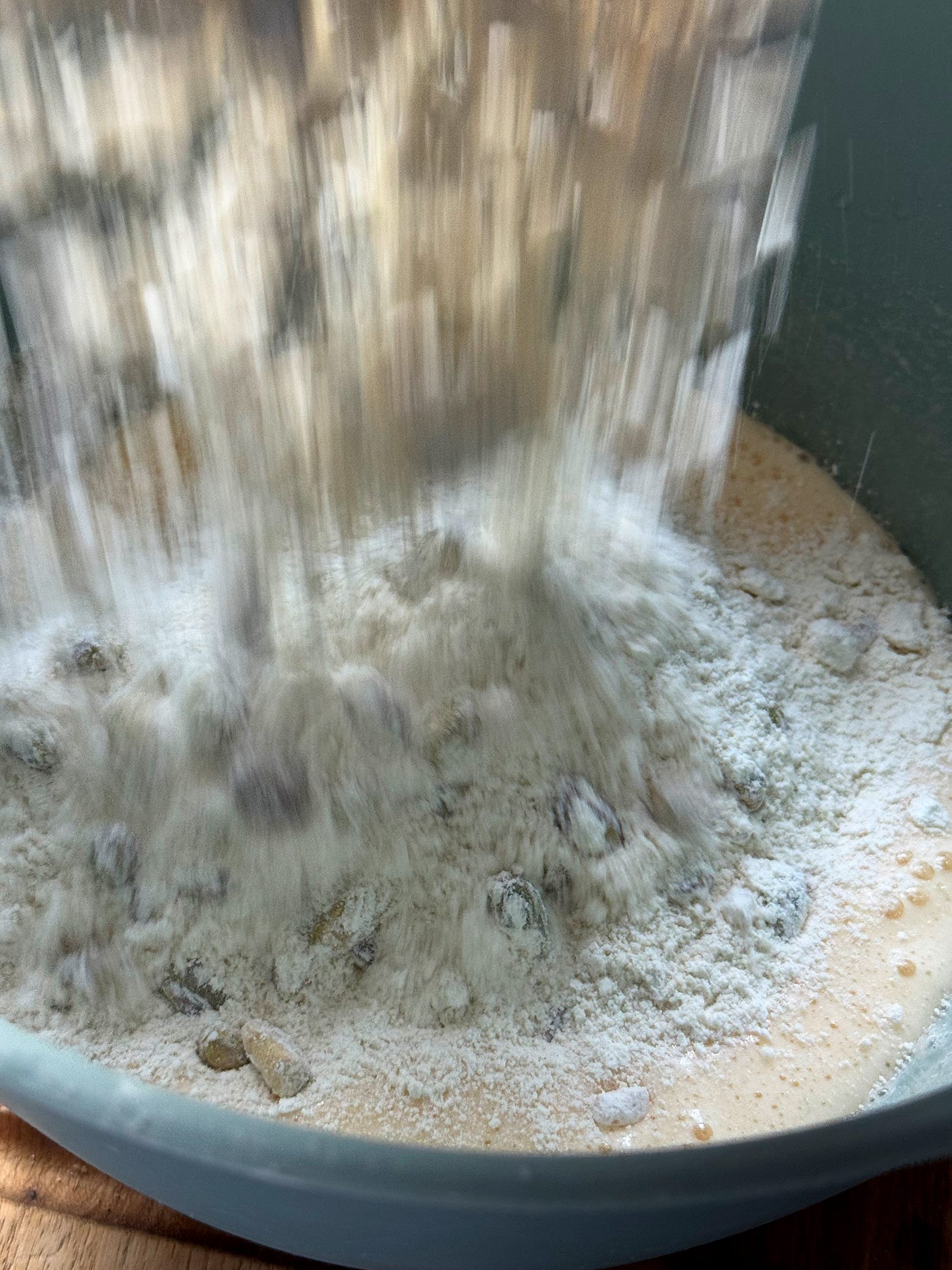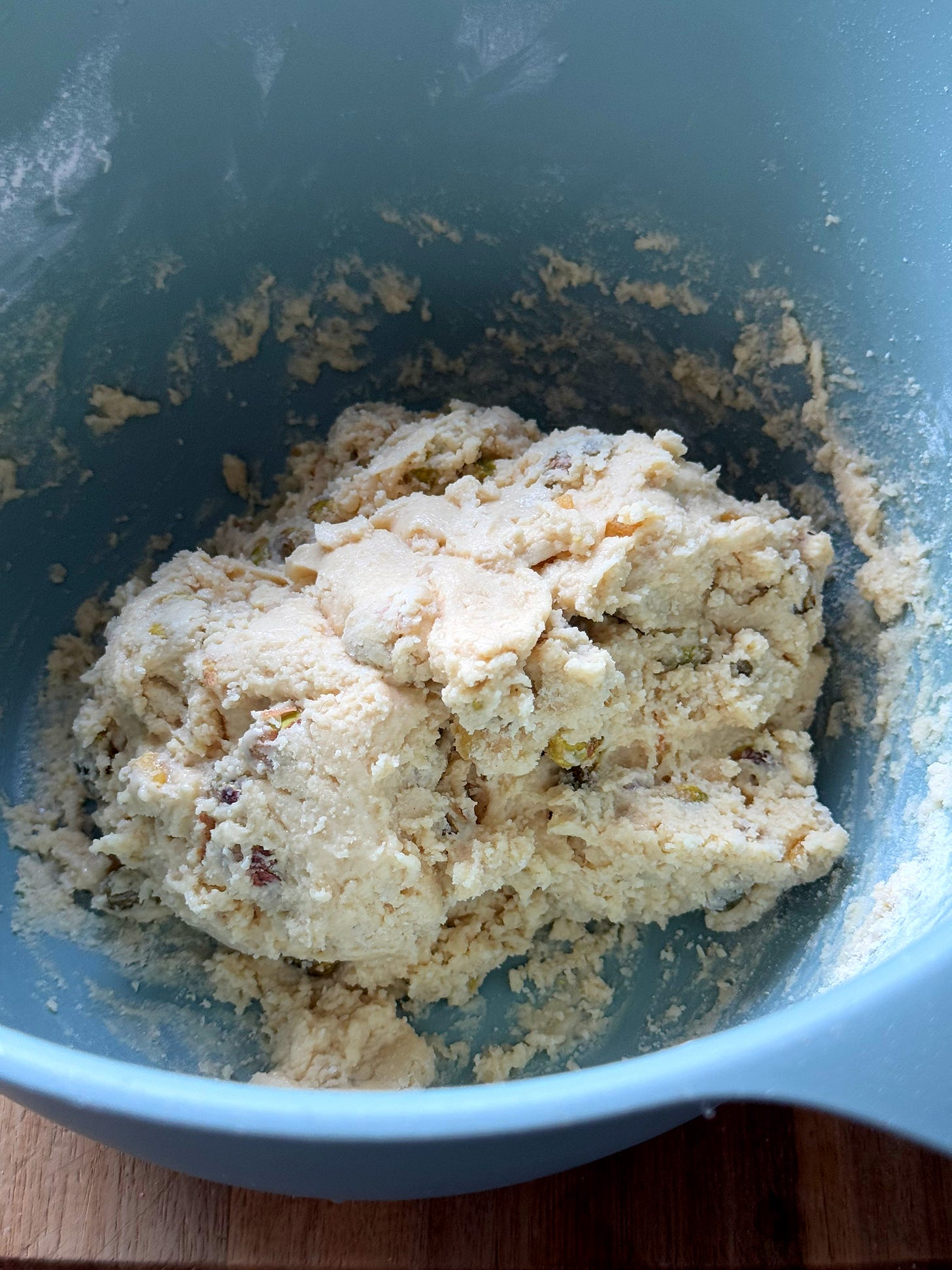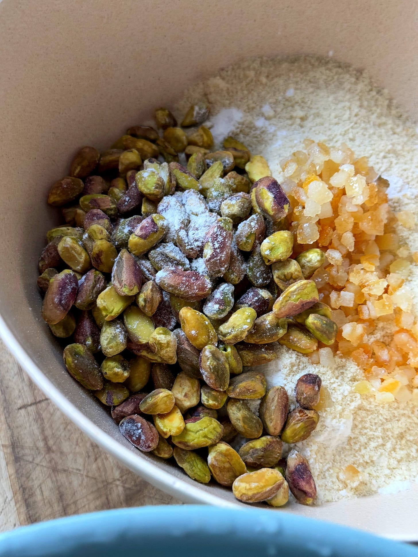 Combine the dry ingredients. In a mixing bowl, combine the 250g plain flour, 50g ground almonds, 120g pistachios, 2 tablespoons of candied peel (or 1x lemon zest), 1 tsp baking powder, 1/4 tsp nutmeg and 1/4 tsp of salt. Mix until combined.