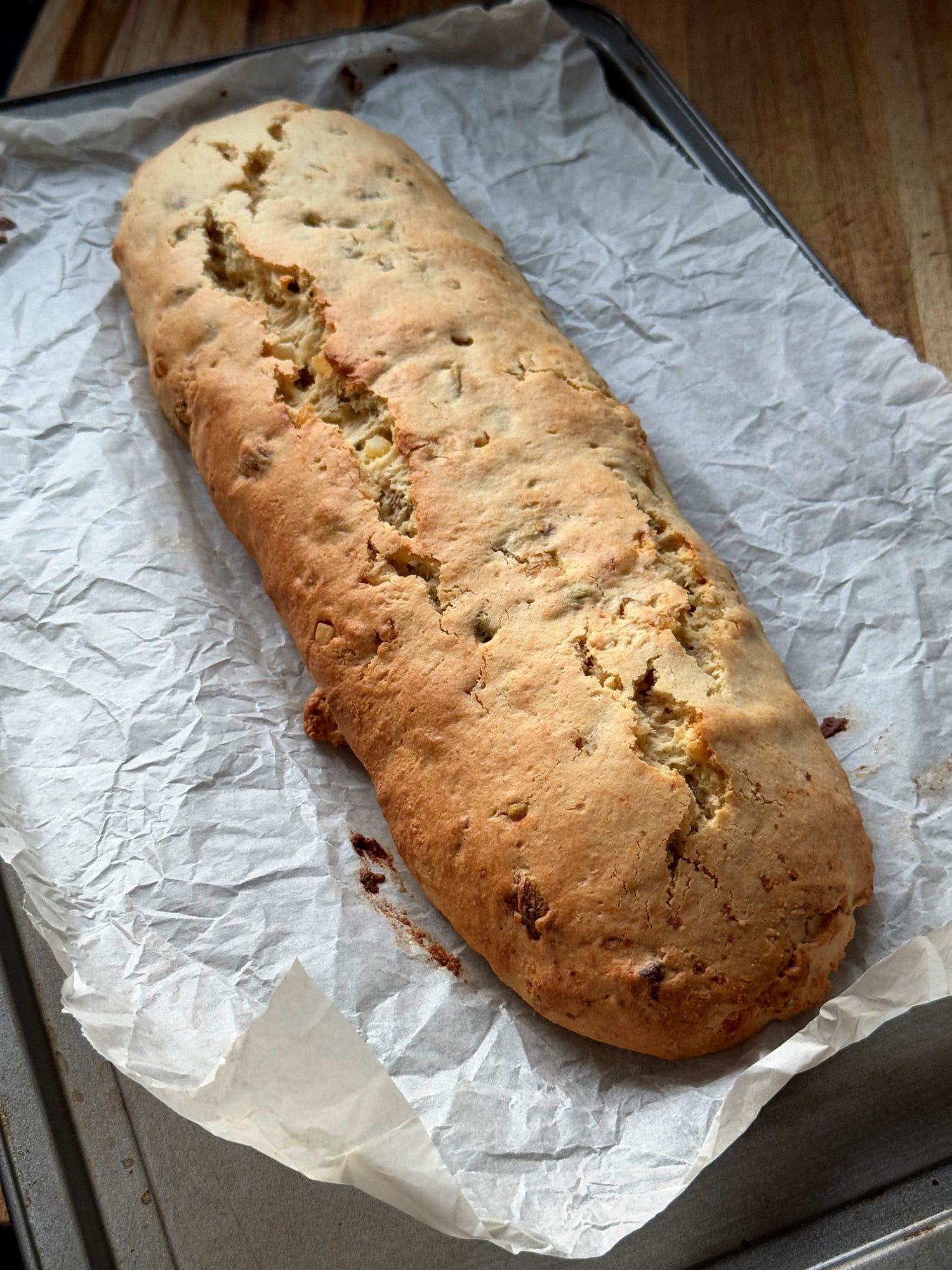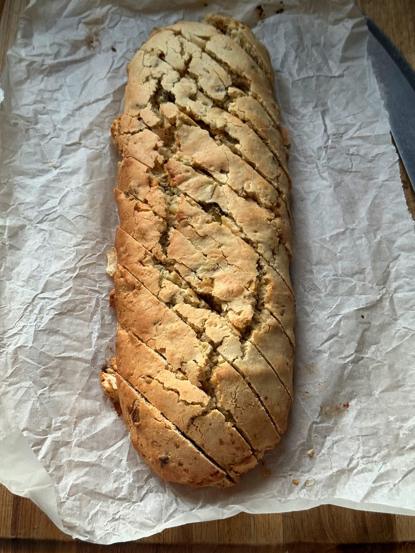 Tip the dough out onto a counter and briefly roll it to form a log, about 20cm long. Transfer it to the paper-lined baking tray. Using your damp hands, press the long into a flat, biscotti shaped loaf.
