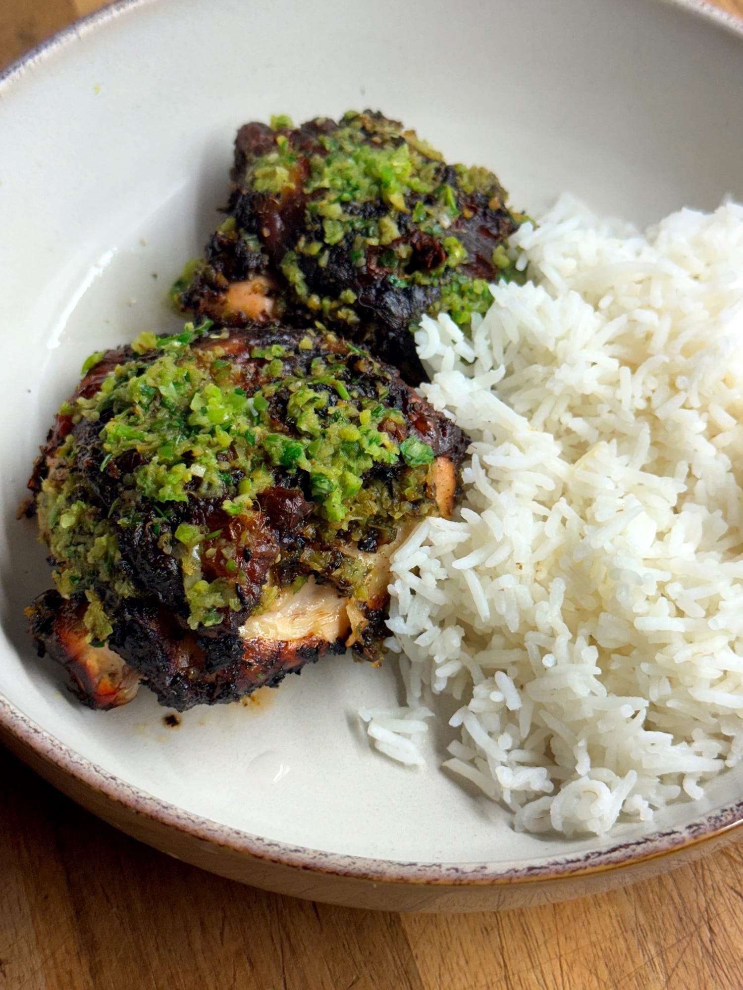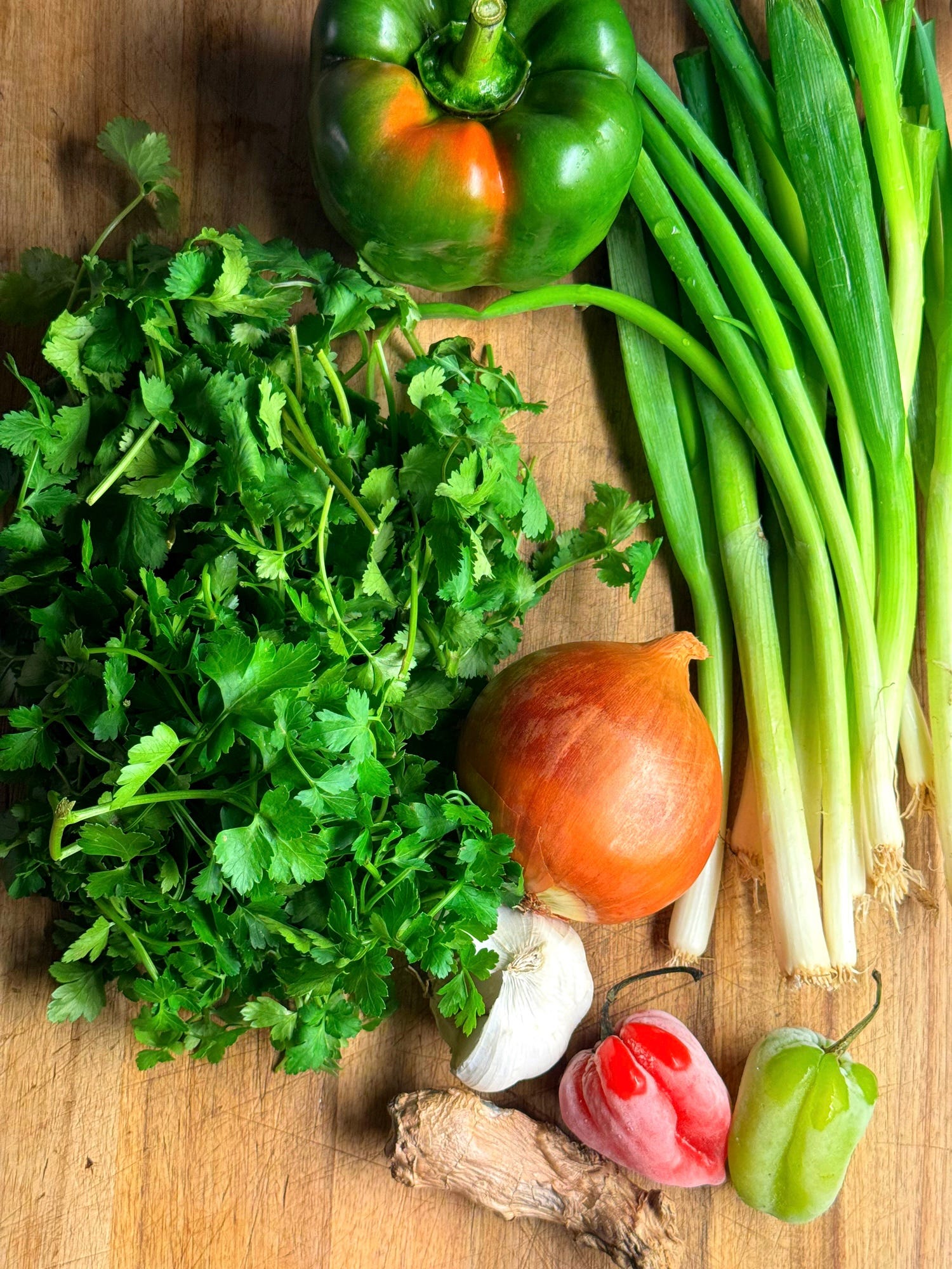 The Caribbean islands offer one of the richest and most eclectic fusions of culinary traditions in the world. Although most of the islands will have their own produce, influences and forged culinary style, there are some ideas and techniques that connect them. This dish celebrates one of them: ‘green seasoning’. This blended wet seasoning would be made with chilli peppers, green onions and fresh green herbs. It ties together various beliefs from various cultures about how to preserve food before the advent of refrigeration. Many cultures believed strong-tasting and strong-smelling aromatics made food last longer, both before and after cooking. Though they couldn’t explain the mechanism for how this happened, it just seemed to, and there actually were truths to it. Many of the ingredients were anti-bacterial to some degree, and also happened to be delicious too. ‘Green seasoning’ is the embodiment of that. Though it’s often used as a first step in more complex Caribbean recipes, ‘green seasoning’ alone makes a great marinade for grilled or roast chicken. Nowadays, we may not need these old-time preserving ways, but it seems we have learned to love the taste of them. Let’s honour that. Let’s go!
