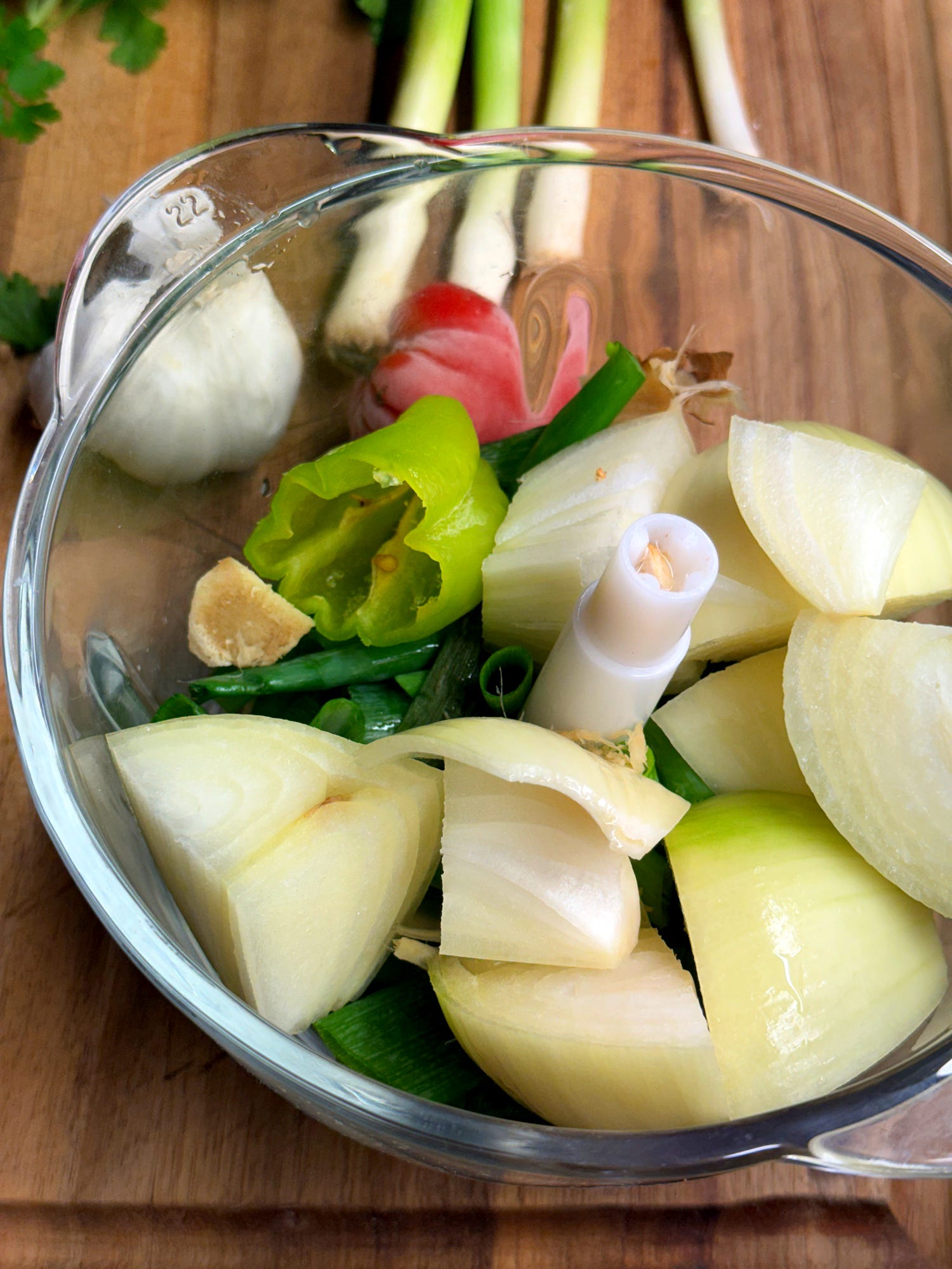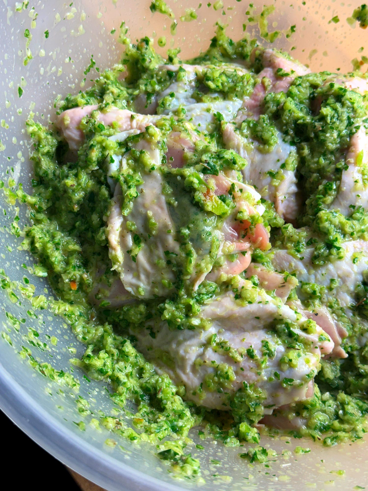 First, let’s make the green seasoning. In a large processor combine all of the ingredients (besides the chicken). Blend them to a fine paste, with a little bit of texture remaining. This green seasoning can be stored in the fridge for up to 5 days.