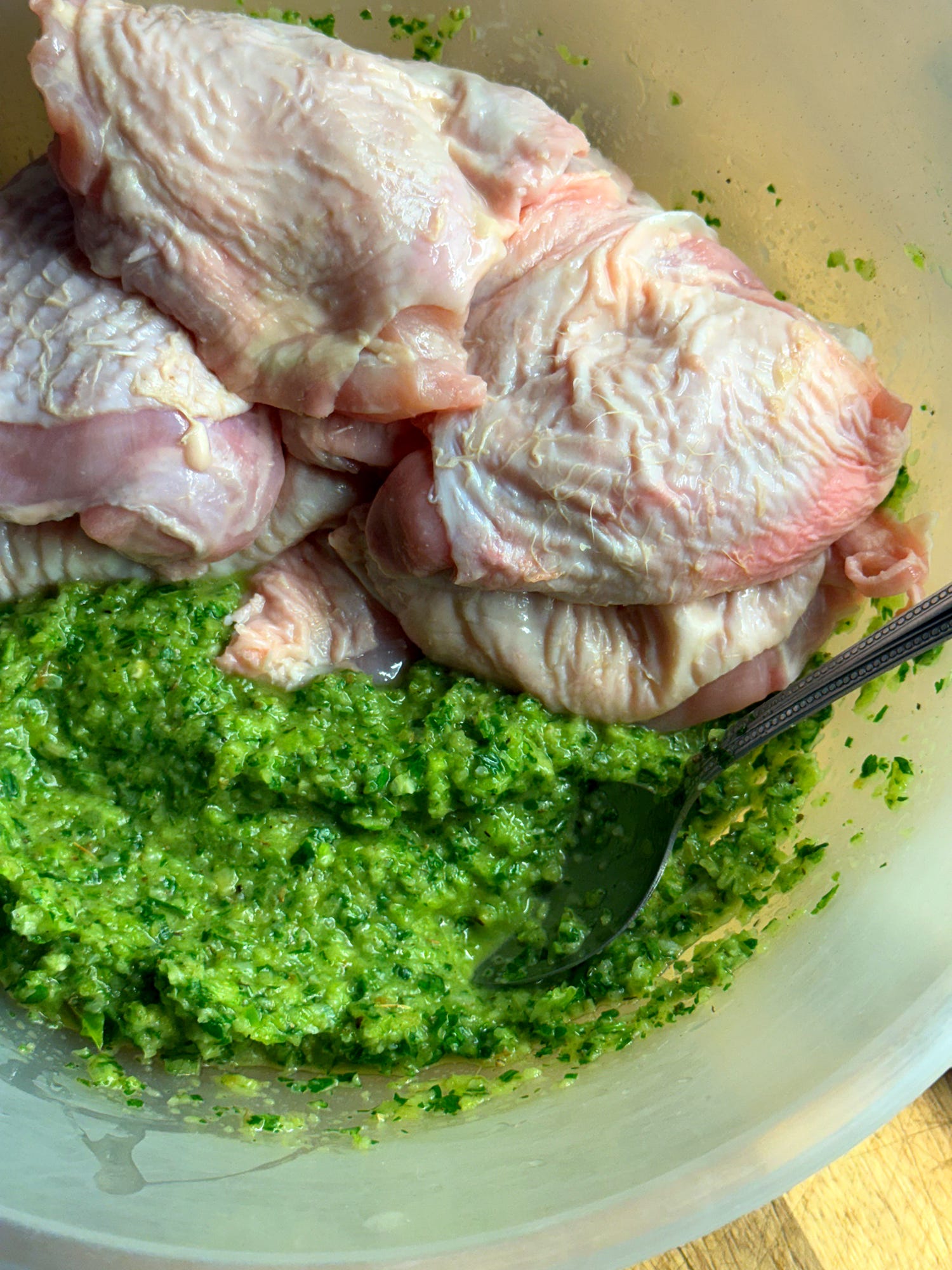 Remove approximately 1/4 of the green seasoning and set it aside for later. To the remaining green seasoning, add your 8-10 bone-in chicken pieces (thighs and/or drumsticks). Use your fingers to loosen the skin away from the meat. Using your hands (gloves recommended), spread the green seasoning around the meat, tucking it under the skin of the chicken. For deeper penetration, you can cut slits into the meat and push the seasoning in. Allow the chicken to marinate for 20 minutes or up to 2 days in the fridge.