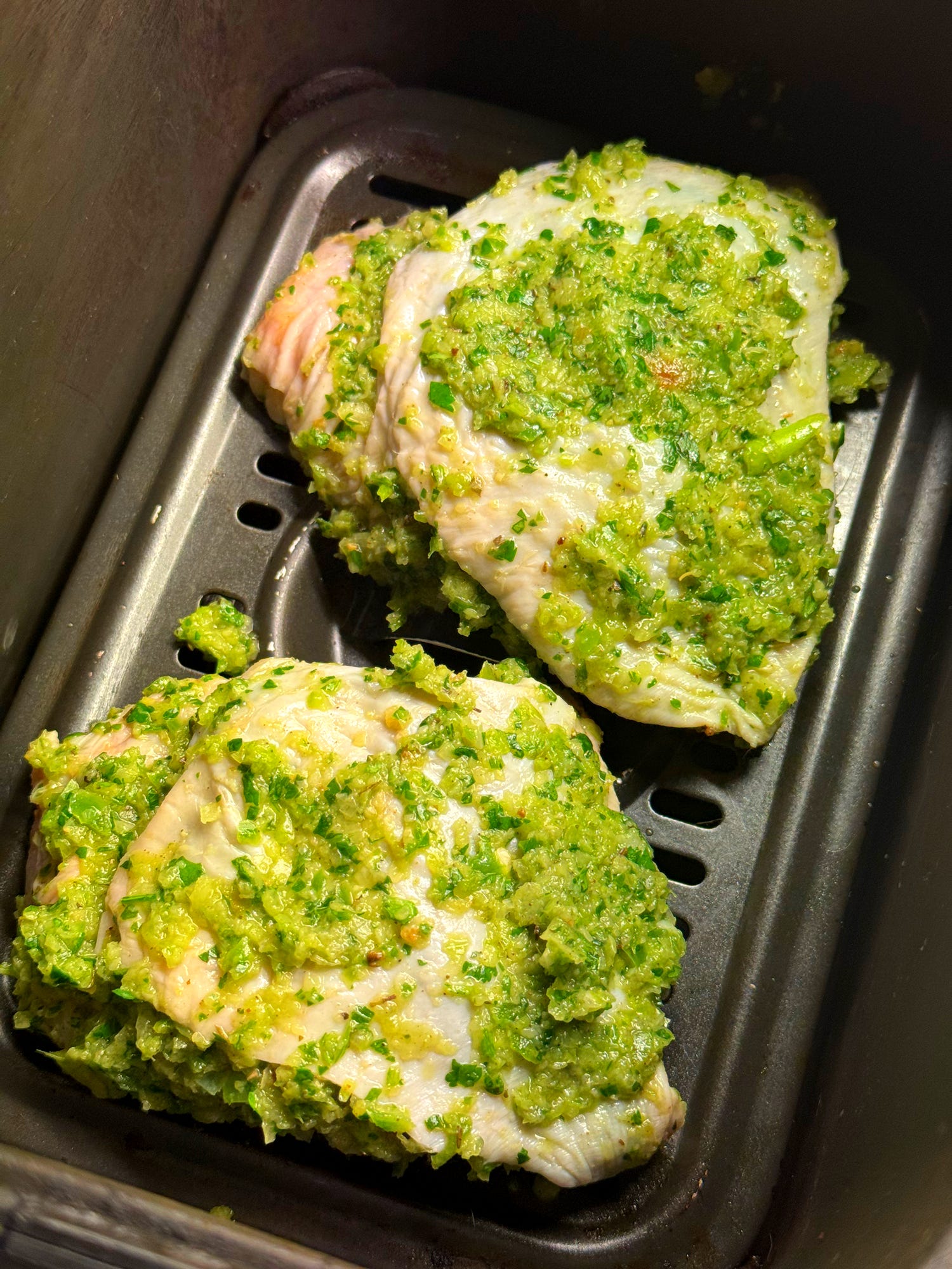 To cook, place the marinated chicken pieces onto an oven tray. Preheat an oven to 180C. Roast the chicken at 180C/350F for 20-25 minutes. The chicken will darken considerably on the surface - this is normal - but will remain green under the skin.