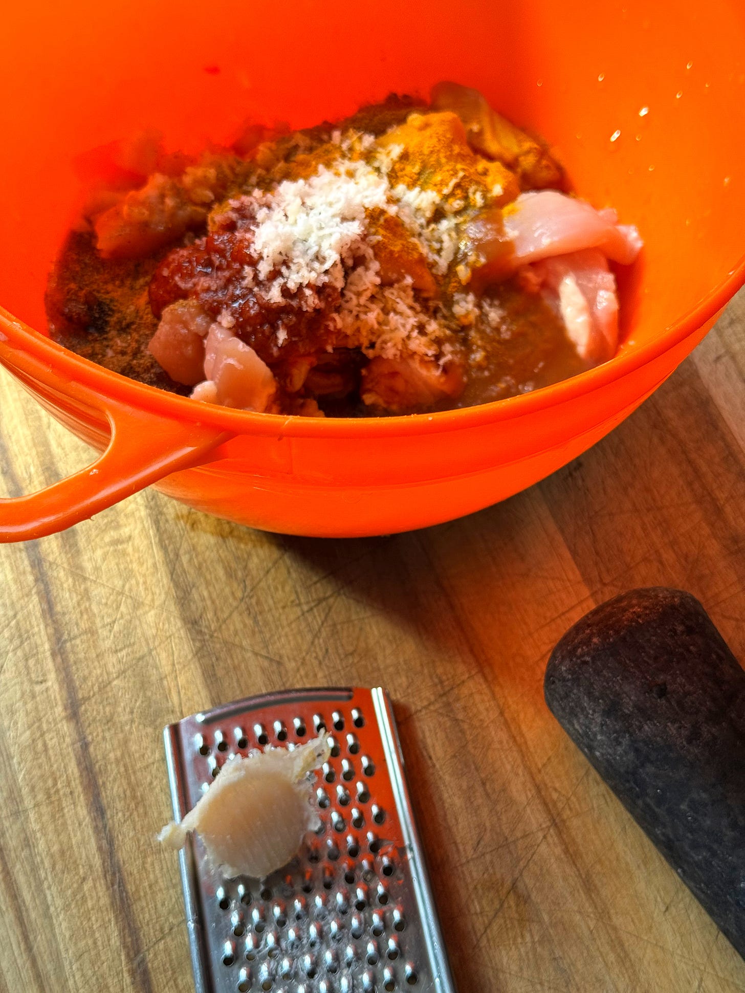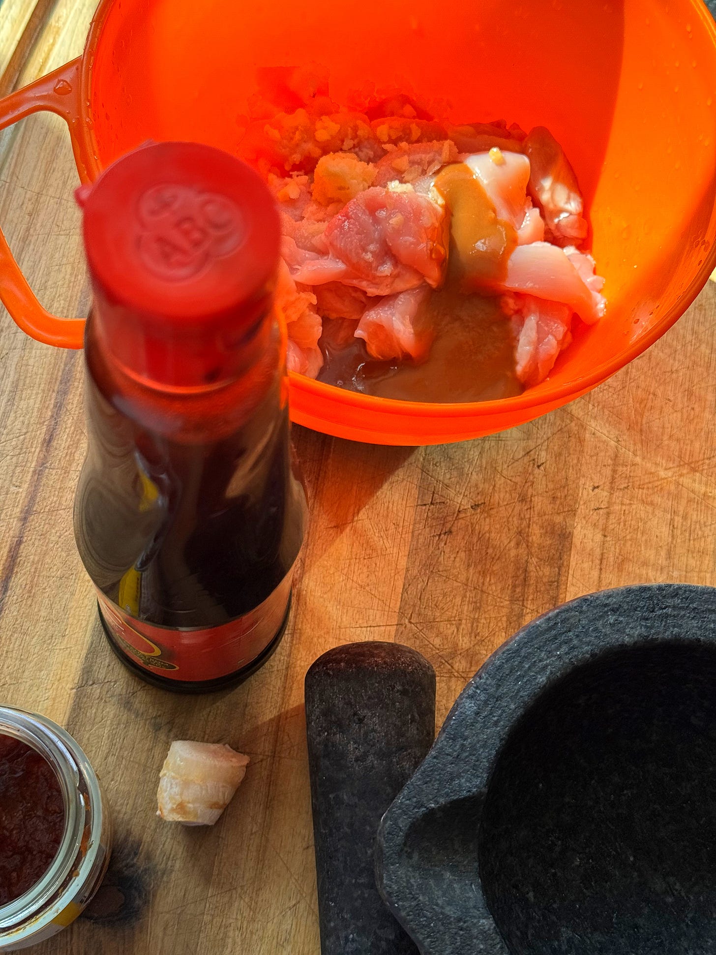 First, let’s marinate the chicken. Add the 6x diced, boneless chicken thighs to a mixing bowl. Grate in 4x cloves of garlic and a 2cm piece of galangal, if using. Add 1 tsp salt, 1 tablespoon tamarind concentrate (or 2 tsps lime juice), 3 tablespoons ketchup manis, 1 tsp ground coriander, 1/2 tsp ground turmeric and 2-4x chopped birds eye chillies. Combine the chicken with the marinade and allow to marinate for 20 minutes or up to 24 hours.