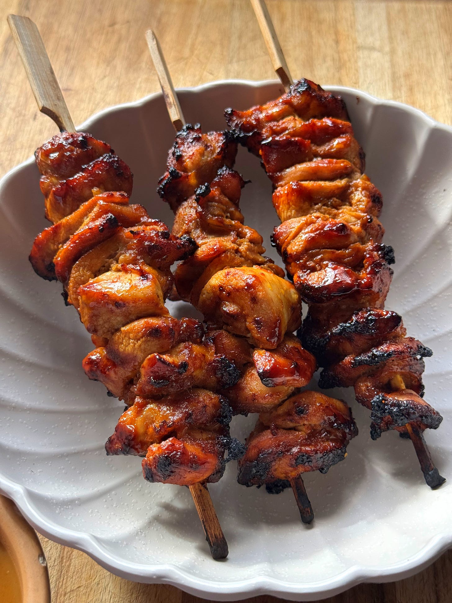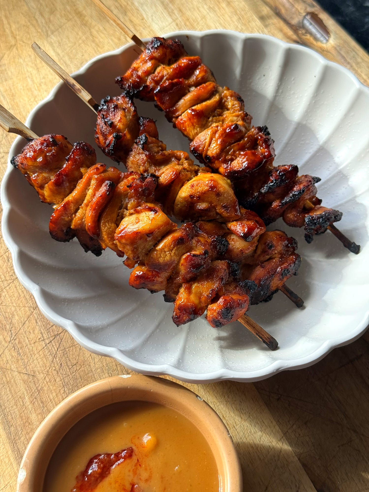 Chicken satay has become a quick grab-and-go protein snack over the last few decades, but not many people consider making it at home. True chicken satay comes from Indonesia, where pieces of marinated chicken are skewered, grilled over charcoal and served with a sweet peanut-coconut sauce. There are many variations across Indonesia, but the true home of satay is in Java. Given its origin, these are great contenders to cook on a barbecue, and the peanut-coconut sauce is prepared by simply melting the ingredients together. Naturally, this sauce can be made ahead and even frozen - highly recommended considering these little chicken sticks are highly addictive. Once re-heated, the sauce melts back to its glossy glory. Enjoy satay as a high-protein snack or make a meal of them with some fried rice and beansprouts. Let’s go!