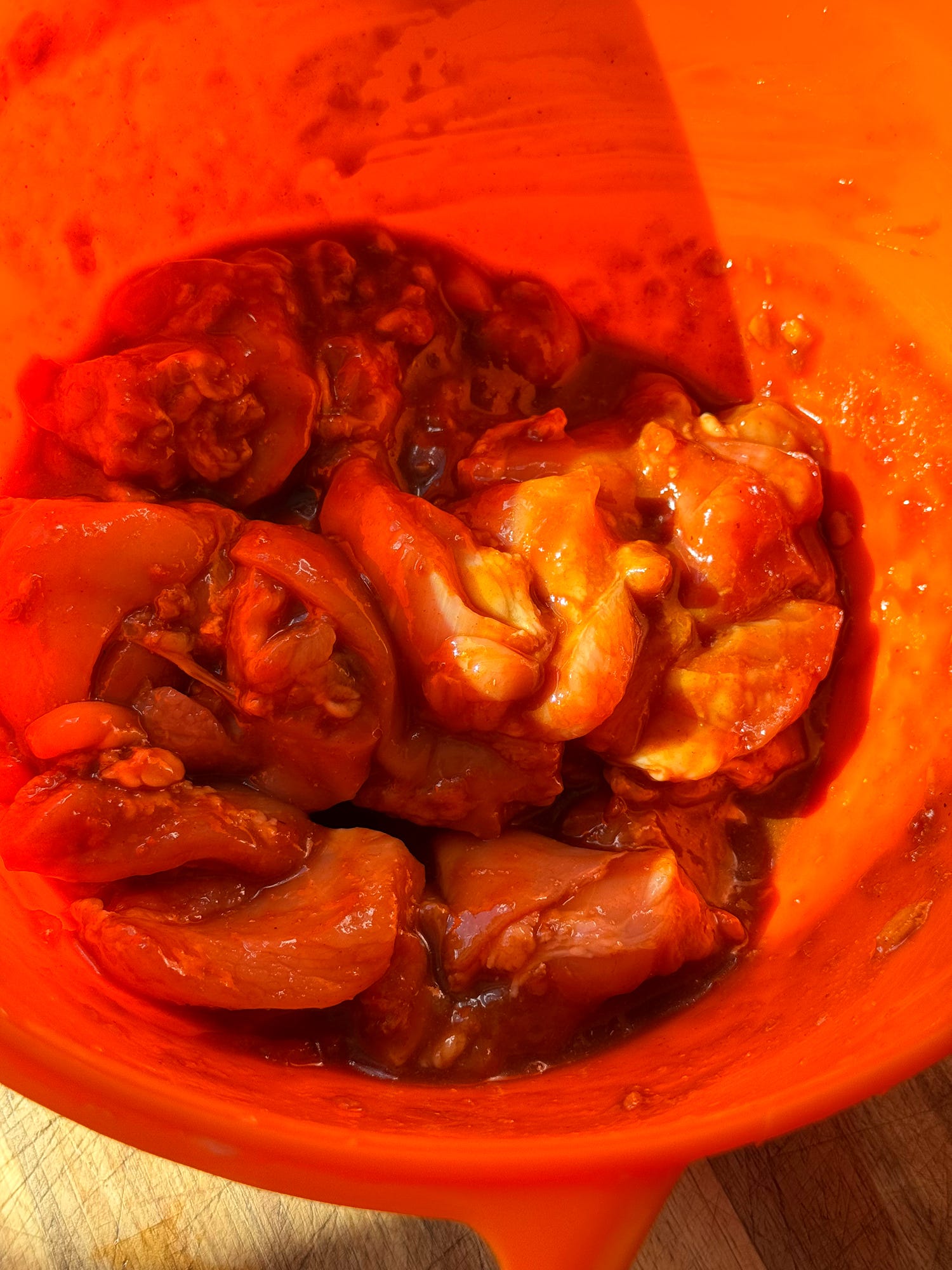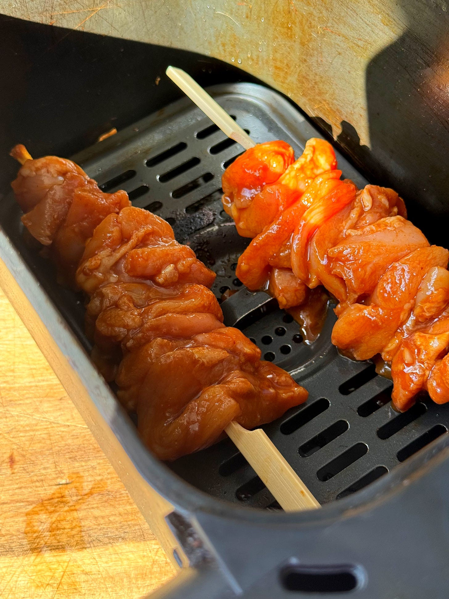 Now let’s grill the chicken. Thread the pieces of marinated chicken onto some skewers, making sure to compact the pieces together. Place the skewers onto a baking tray or a wire rack. You can grill the skewers on a barbecue, or roast in an air-fryer or oven at 220C for 15-18 minutes, until the meat is deeply-coloured and charred in places.