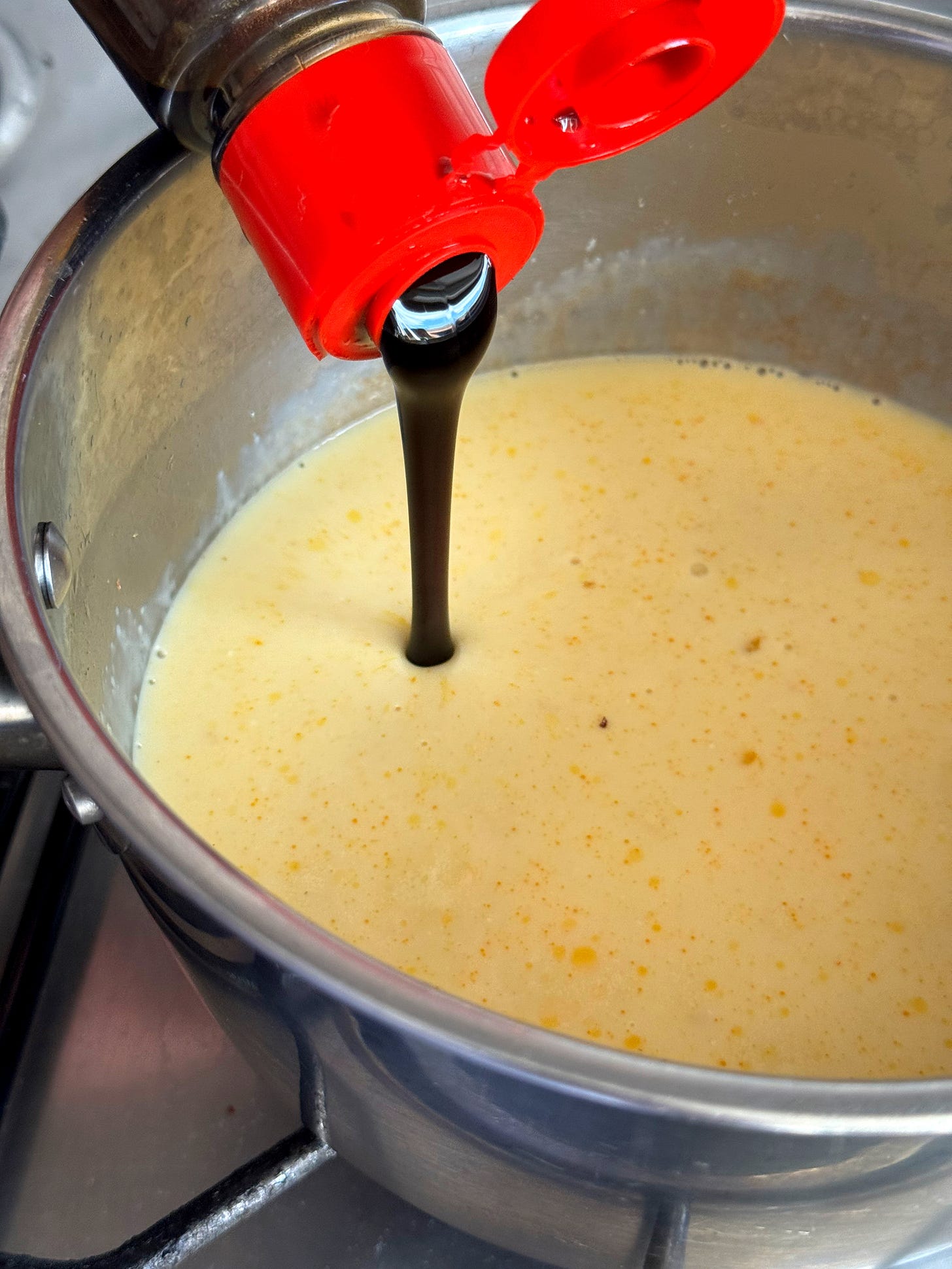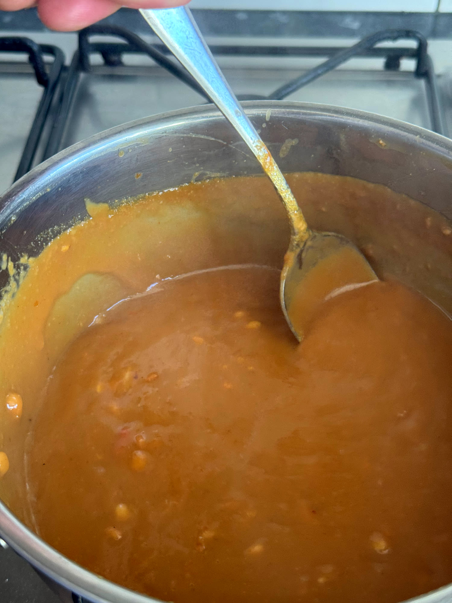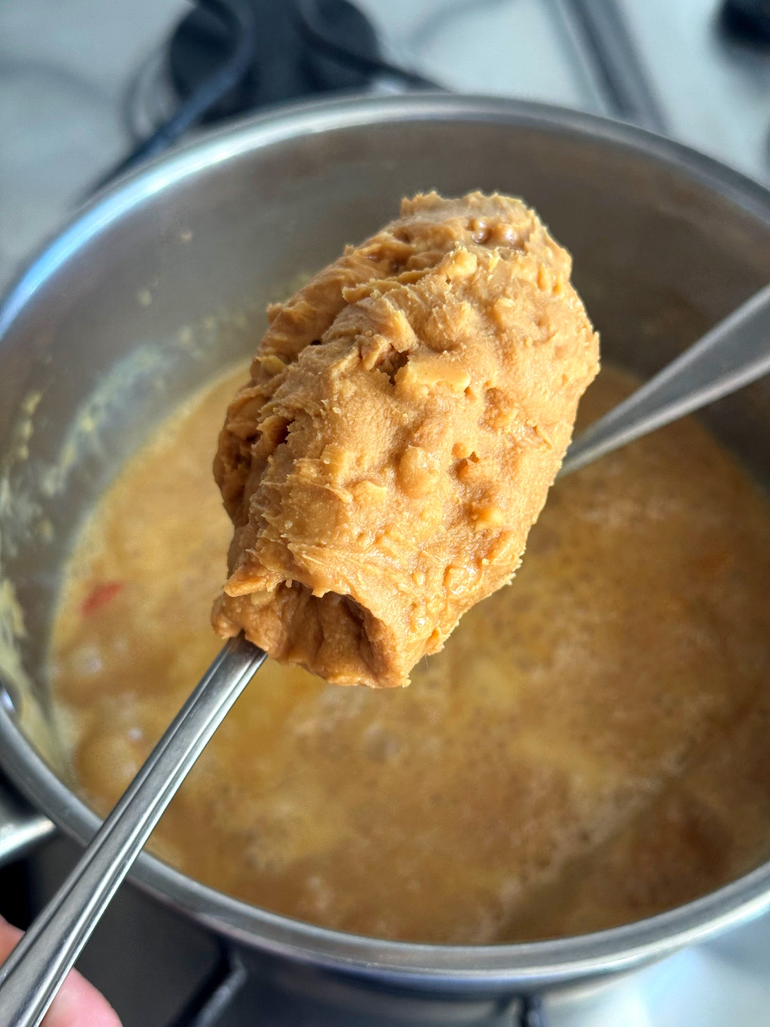 Now let’s prepare the peanut-coconut sauce. In a saucepan, combine all of the sauce ingredients. Place the pan onto a medium heat and allow the ingredients to melt together. Simmer the sauce for 10-15 minutes, stirring occasionally until it thickens and becomes rich. It should be the consistency of Greek yoghurt. This sauce will thicken further on cooling - this is normal.