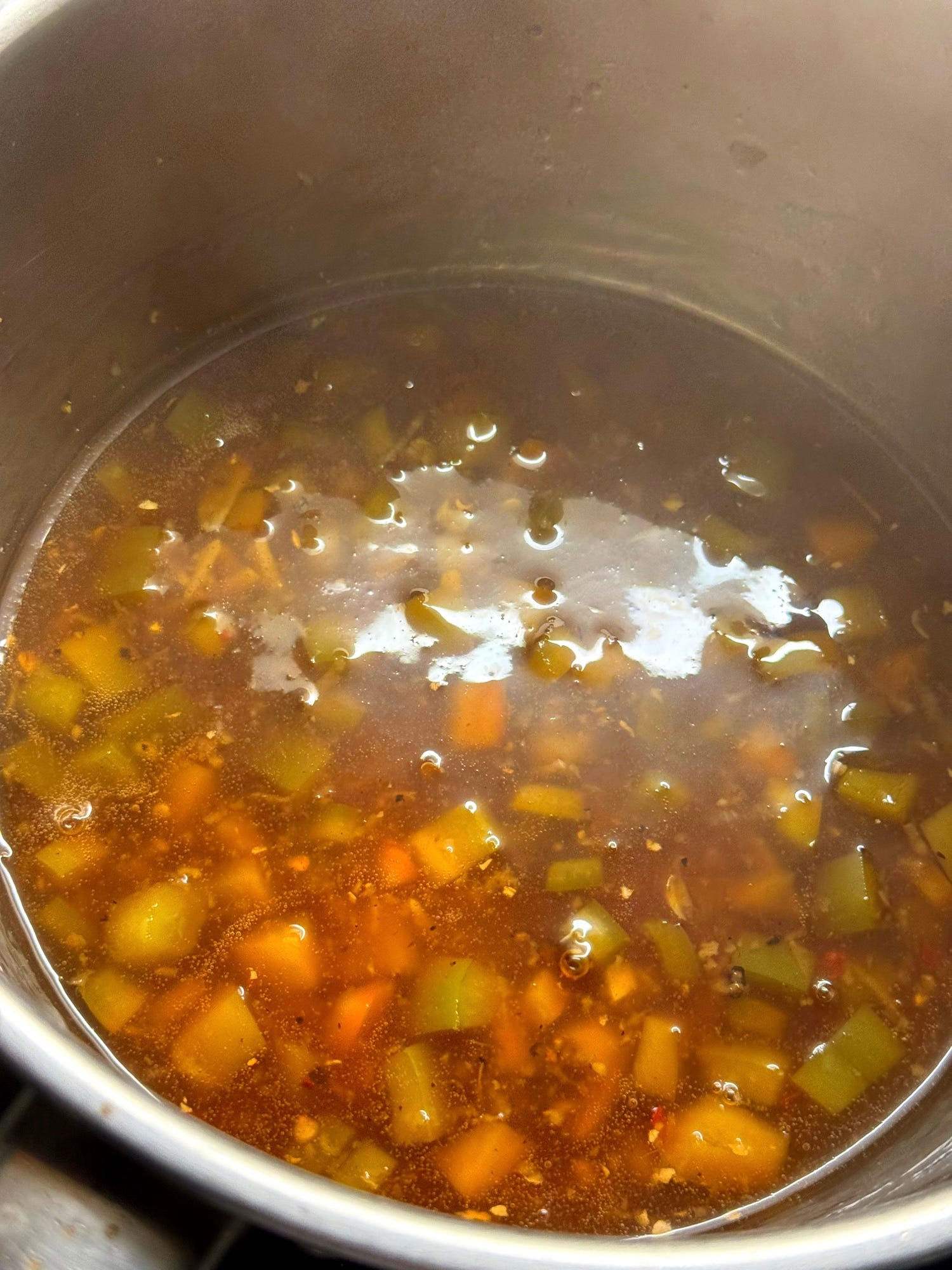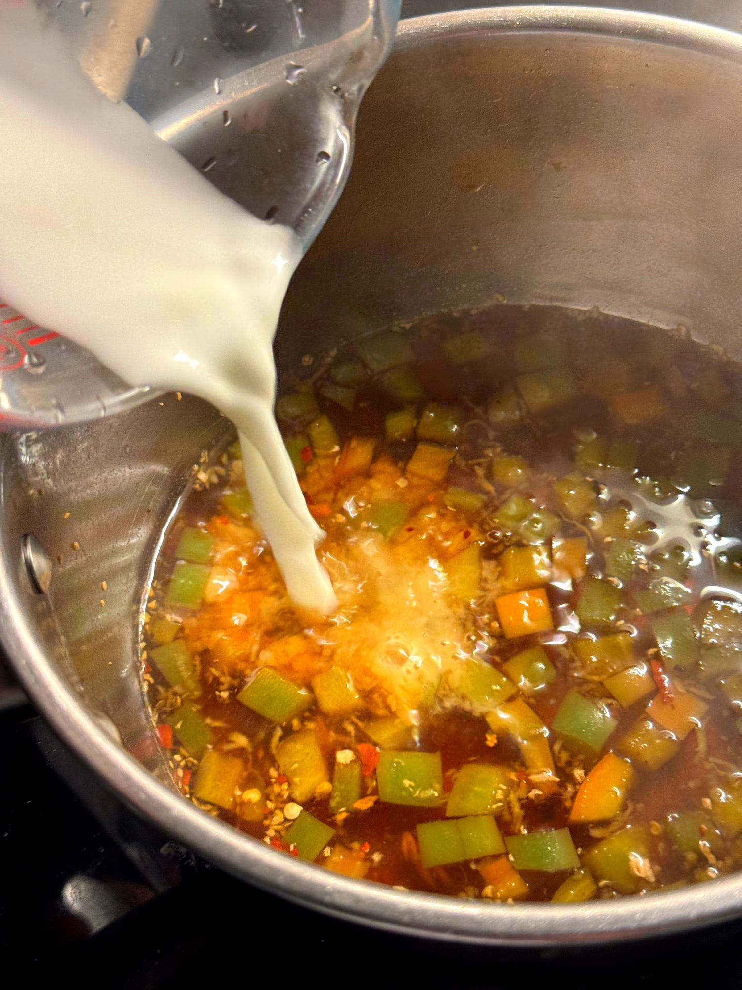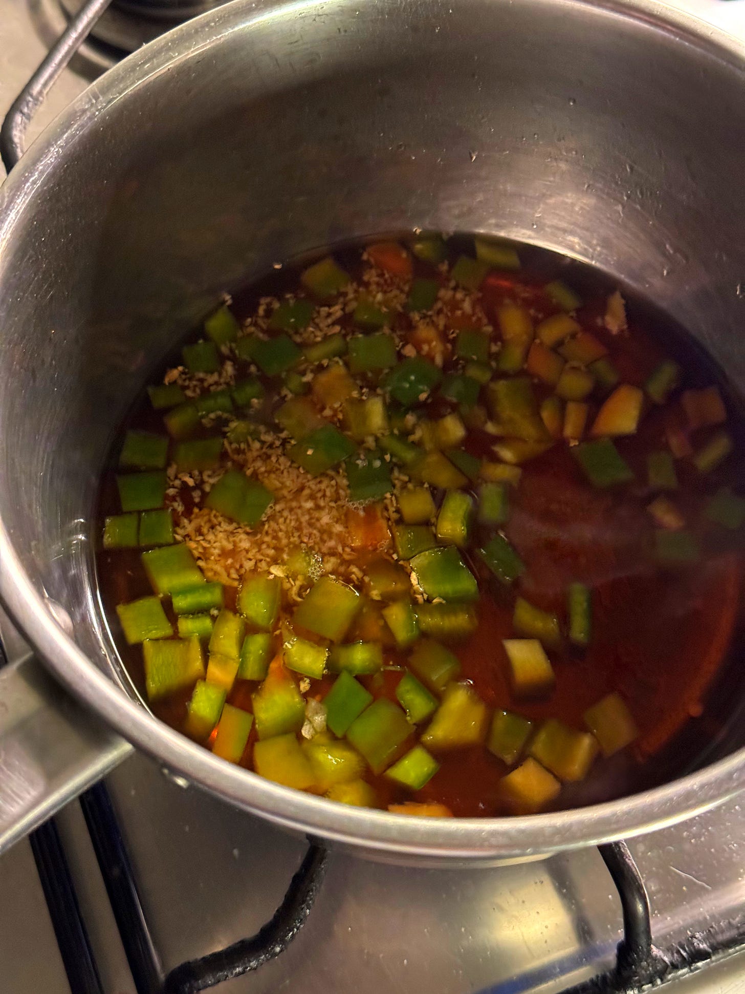 Add the diced bell pepper, diced garlic clove, grated ginger, 1 tablespoon of vinegar and 1 tablespoon of light soy sauce. Simmer the mixture for 5 minutes.