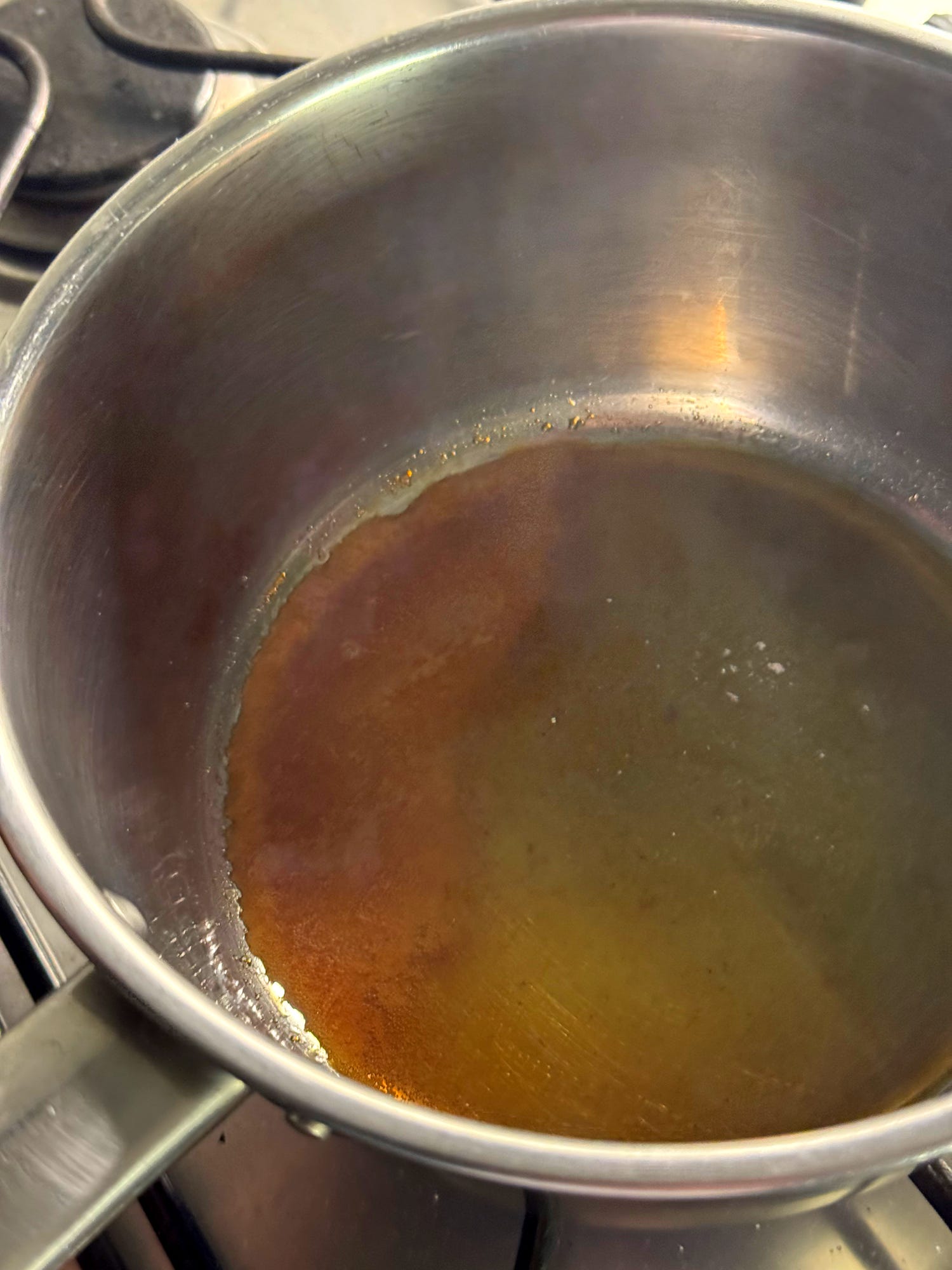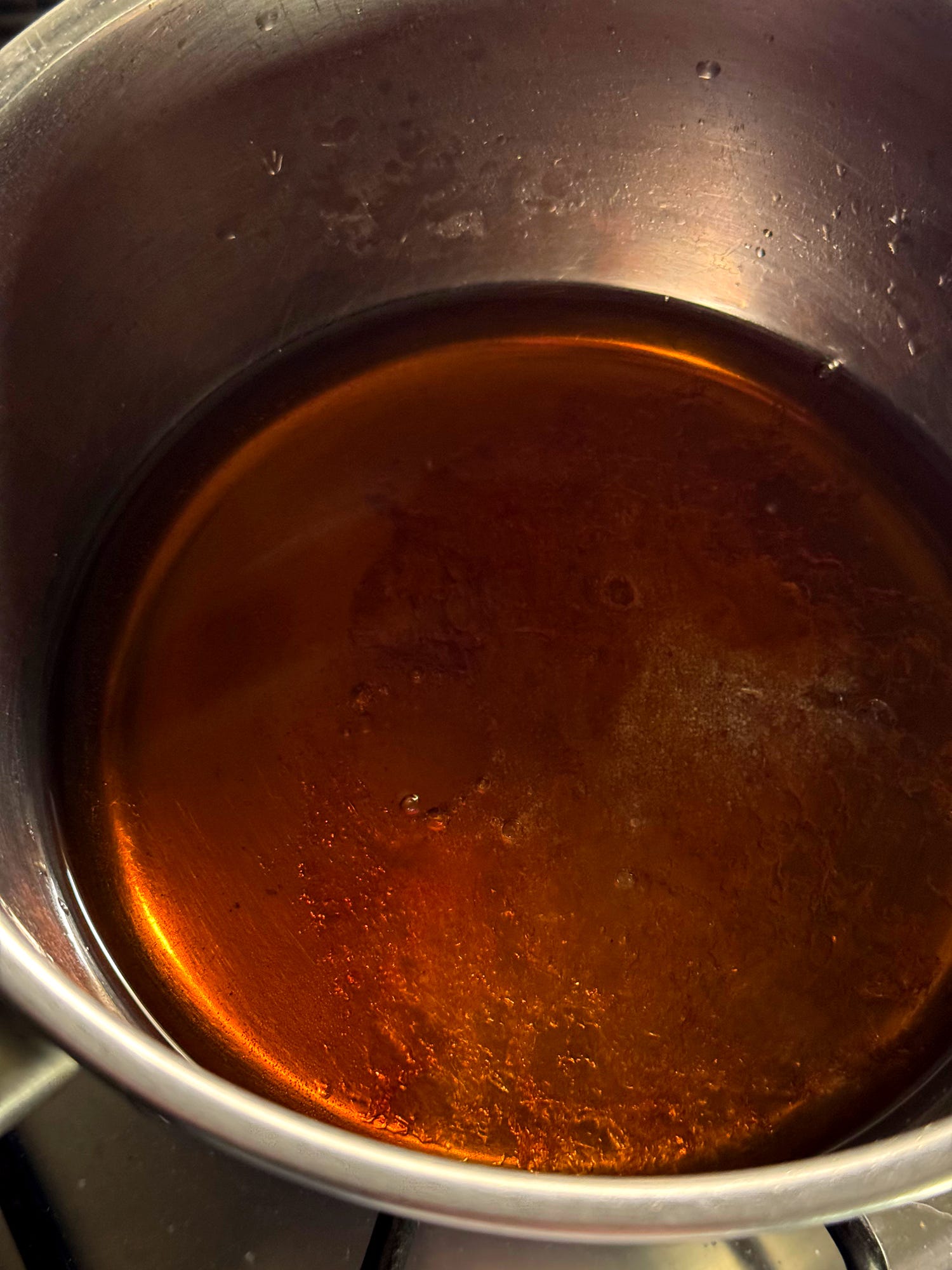 Let’s make the sweet and sour sauce. Place a saucepan onto medium heat and scatter over the 3 tablespoons of white sugar. Allow the sugar to gently melt and caramelise until lightly golden. Add 200ml of water - be careful of any spluttering - and stir over medium heat until the caramel pieces have dissolved.