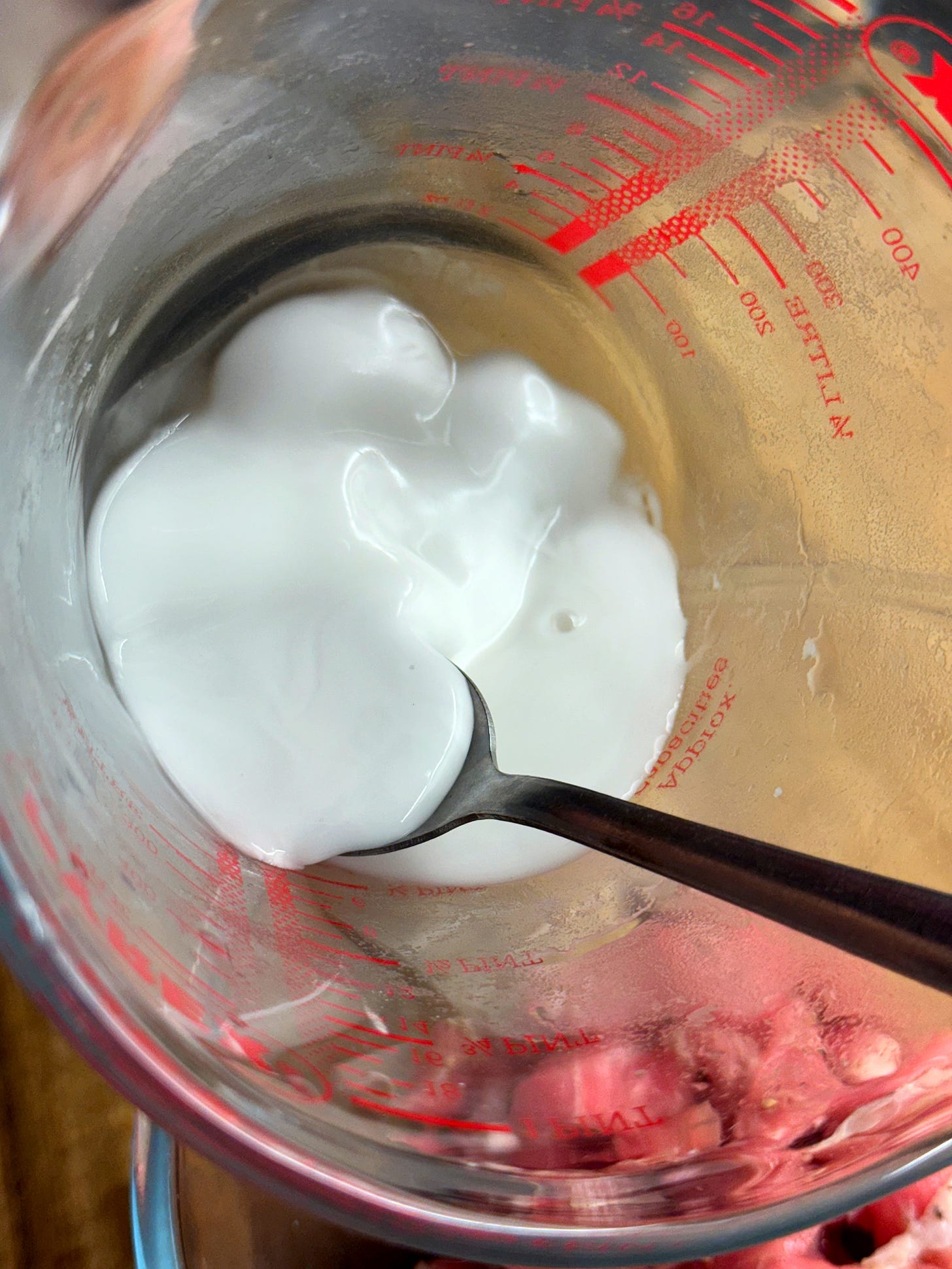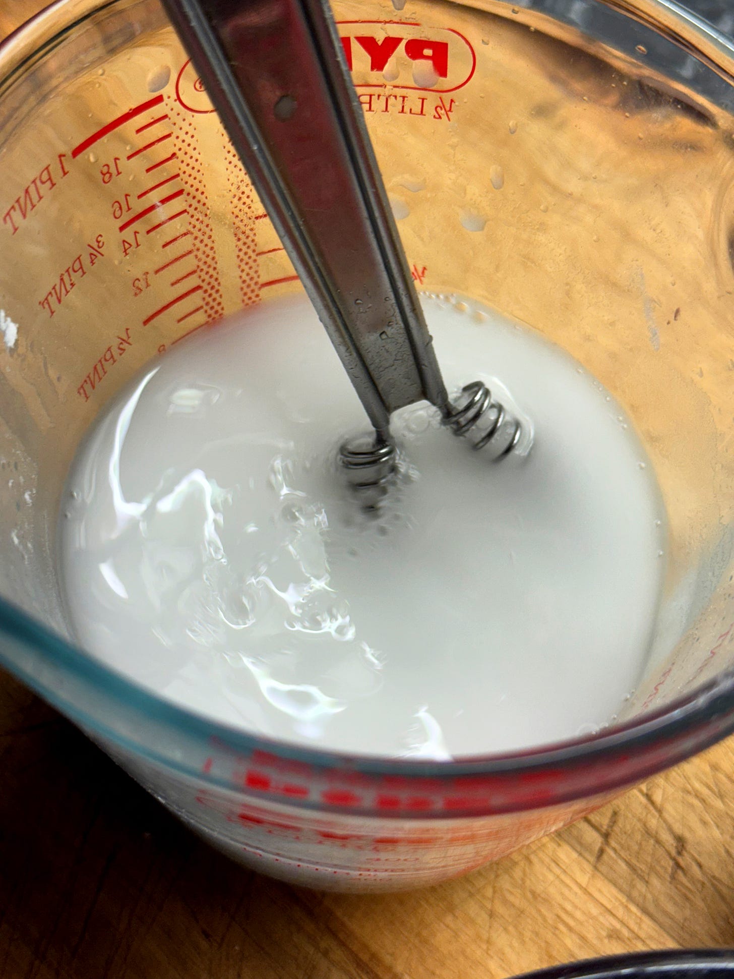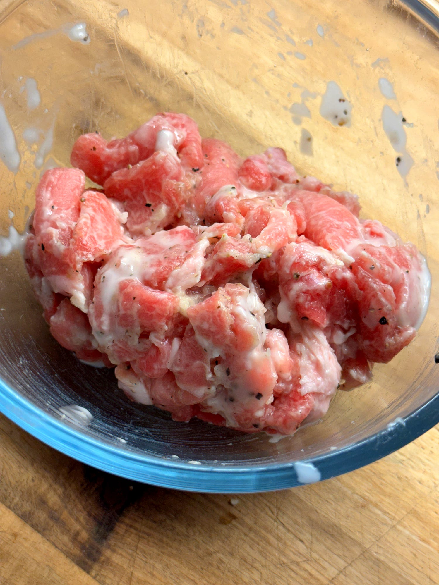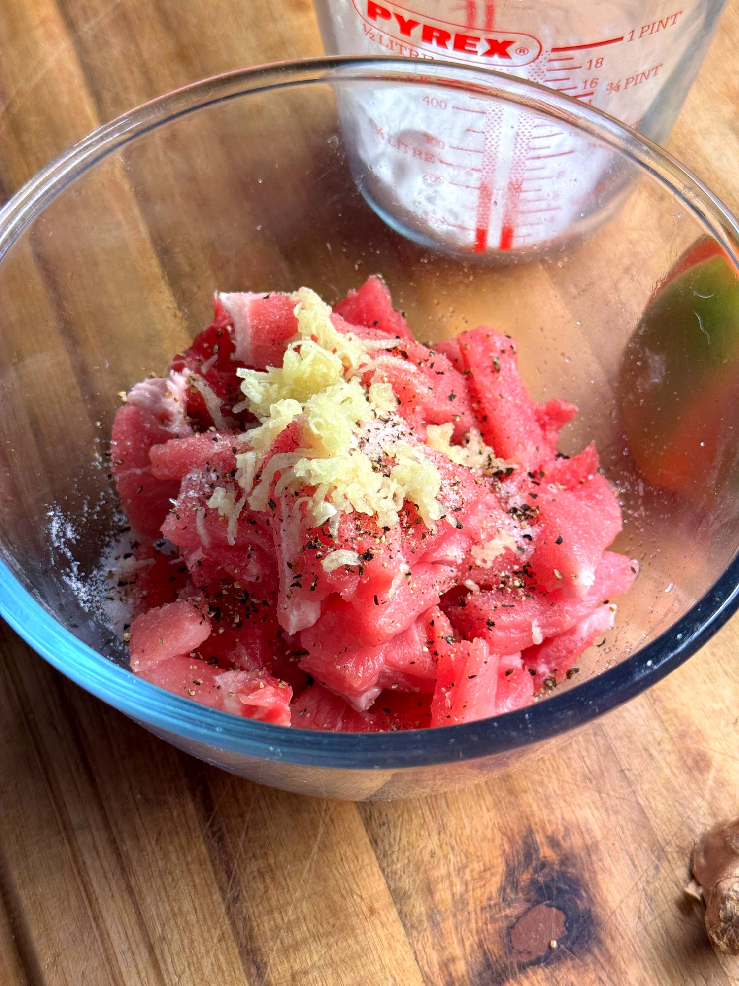 Now we’ll drain the starch slurry. The starch will have settled at the bottom of the jug, with a clear layer of water on top. Carefully pour away all of the water layer. Add the remaining starch goo to the pork mixture and mix until the meat is well-coated and set aside.