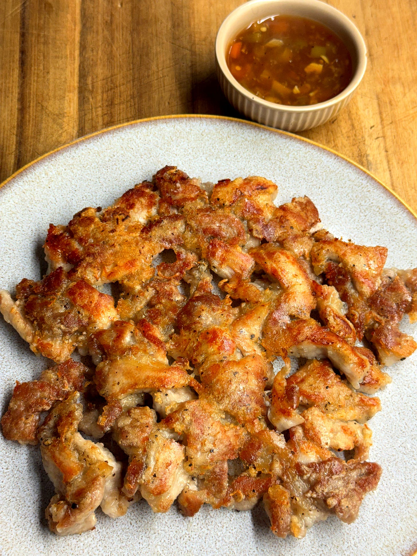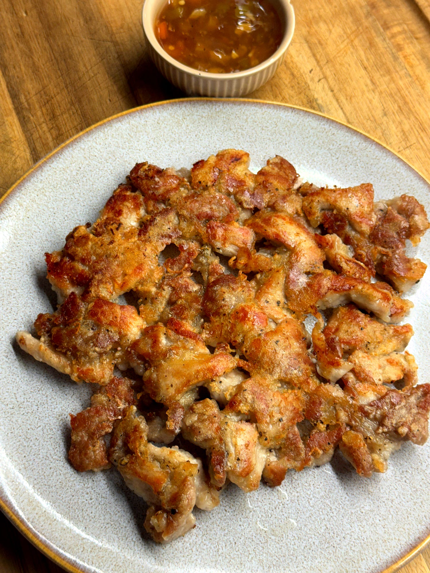 Transfer the pork fritter to a serving a plate. Break it up with chopsticks and enjoy it with the sweet and sour sauce - it’s great to share also! Enjoy!